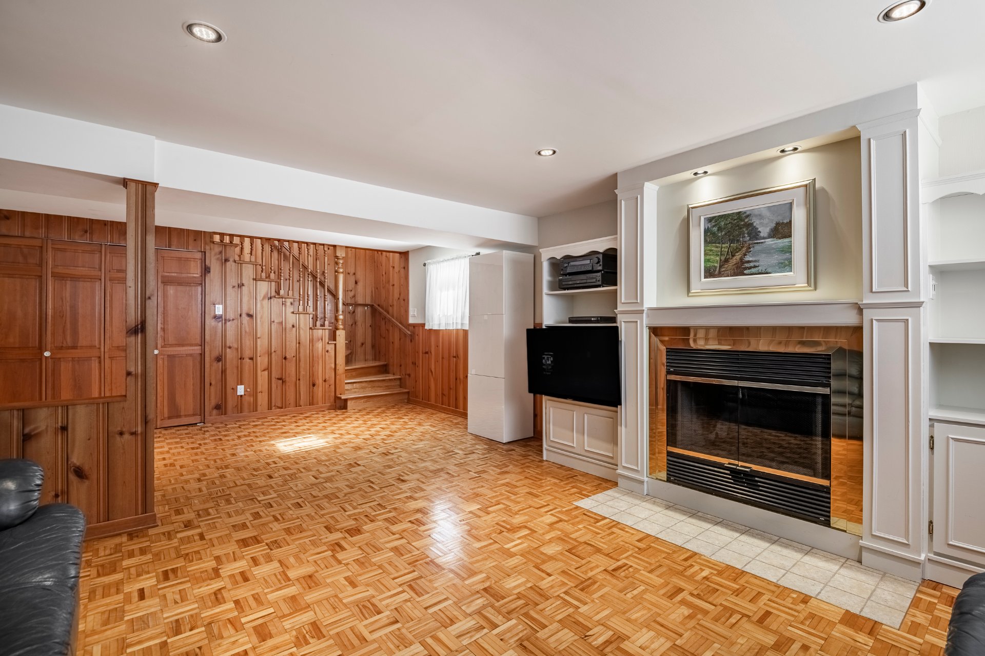 The basement offers a cozy family room with a fireplace, perfect for family evenings, a relaxation area, or a game room.