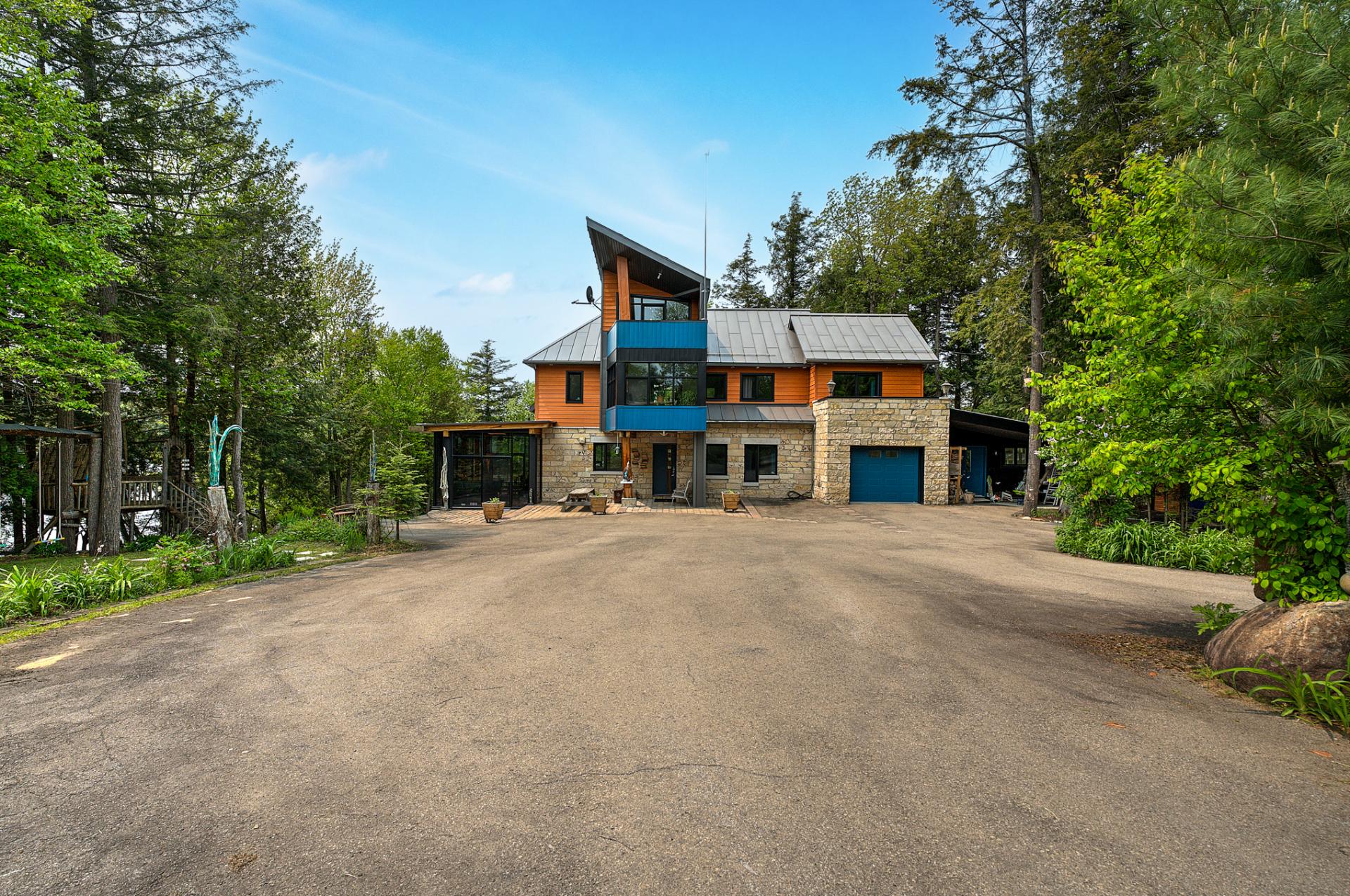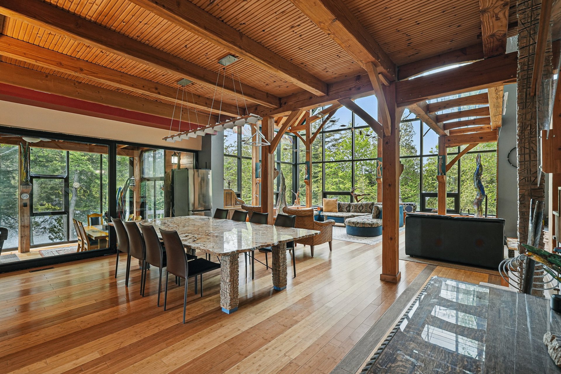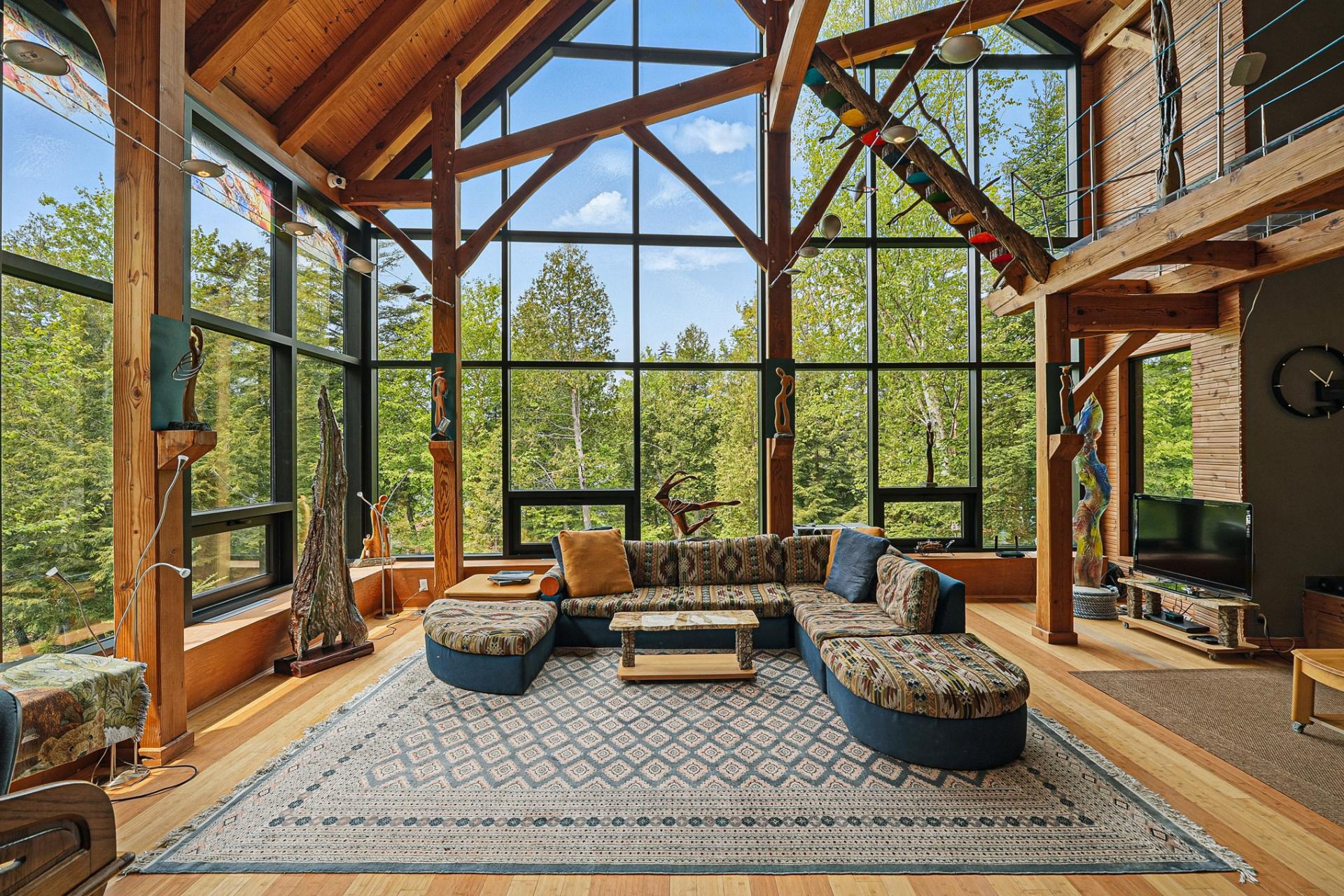 Discover a truly unique estate. The four-story main residence, built in 2008 atop a rocky bluff, features 30-foot south-west facing glass walls, offering breathtaking panoramic views. Highlights include: 5 bedrooms | 5 bathrooms, 2 living rooms + wellness suite. A grand solarium with spa, overlooking the lake. Comfort & Self-Sufficiency: 2 geothermal wells (gas + electric), 2 heat pumps + 26 kW automatic generator, dual H-Q power connection (underground and overhead).Private dock, fully automated organic greenhouse, vegetable garden, fruit trees, thriving forest. A Unique Lifestyle just steps from Lac Carling Golf.