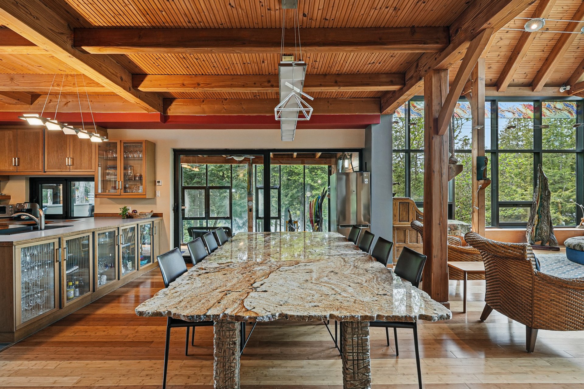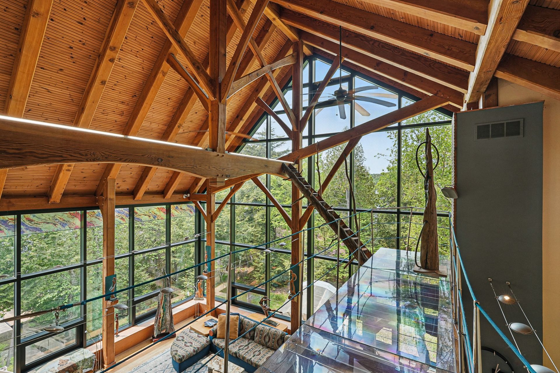 With its soaring 30-foot-high south-west facing glass walls, the interior is bathed in natural light, offering breathtaking panoramic views of the surrounding nature.