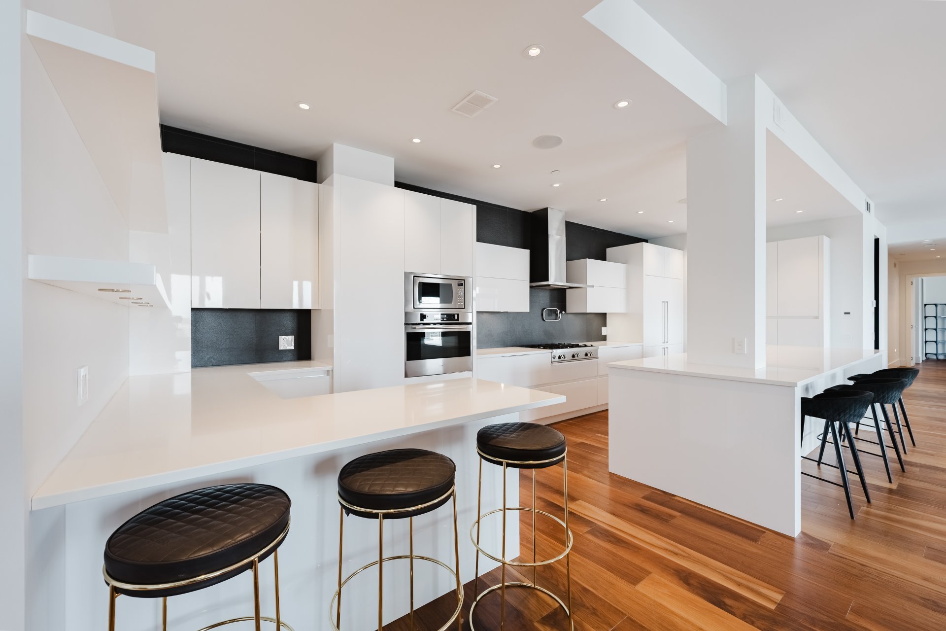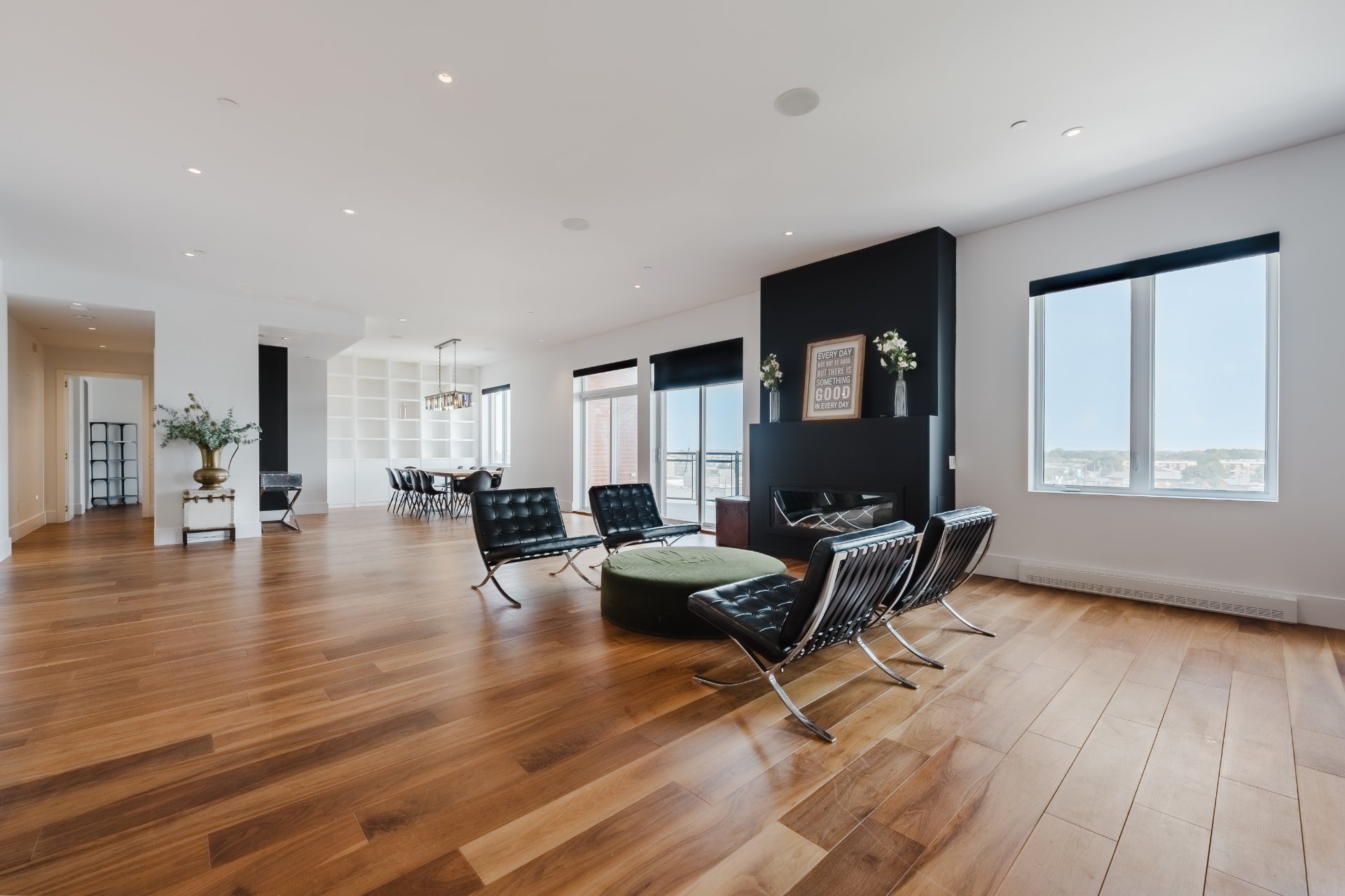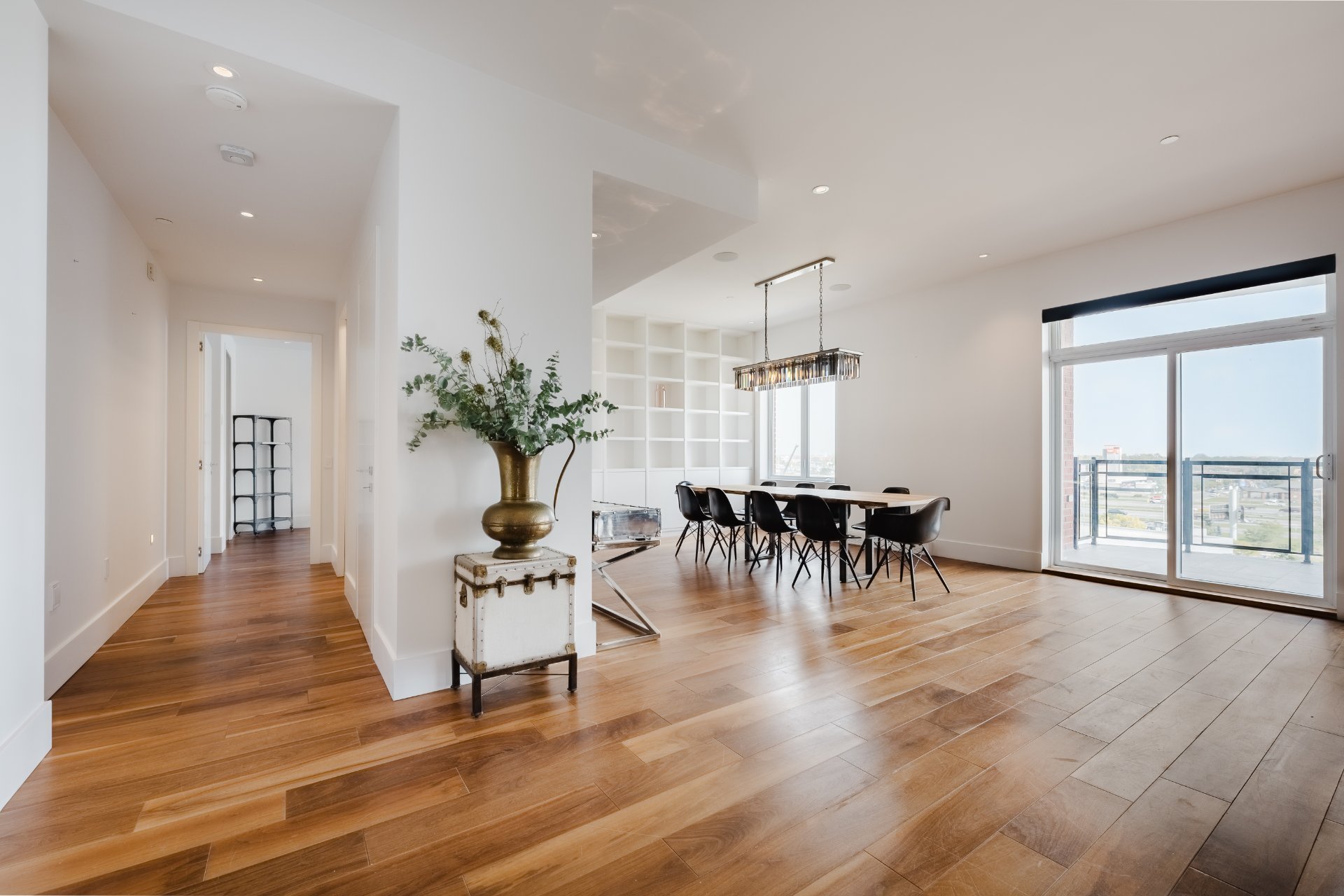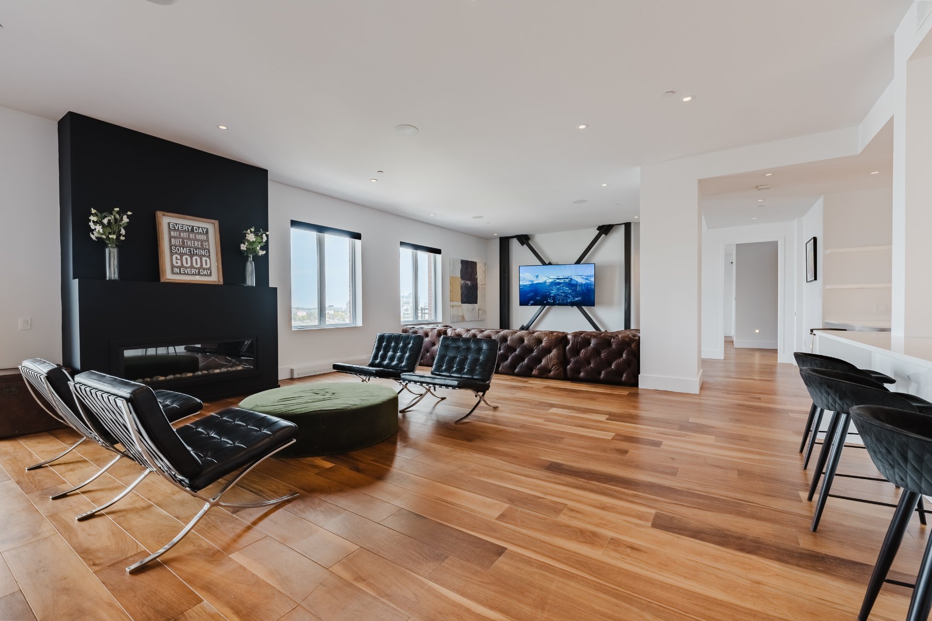 Located on the top floor, this spacious unit offers spectacular panoramic views of the city. The living area, with its generous windows, enjoys remarkable natural light thanks to the large windows that line the dining room and living room, opening onto a first balcony. The modern, chef-worthy kitchen features quartz countertops, two lunch counters, and ample storage.