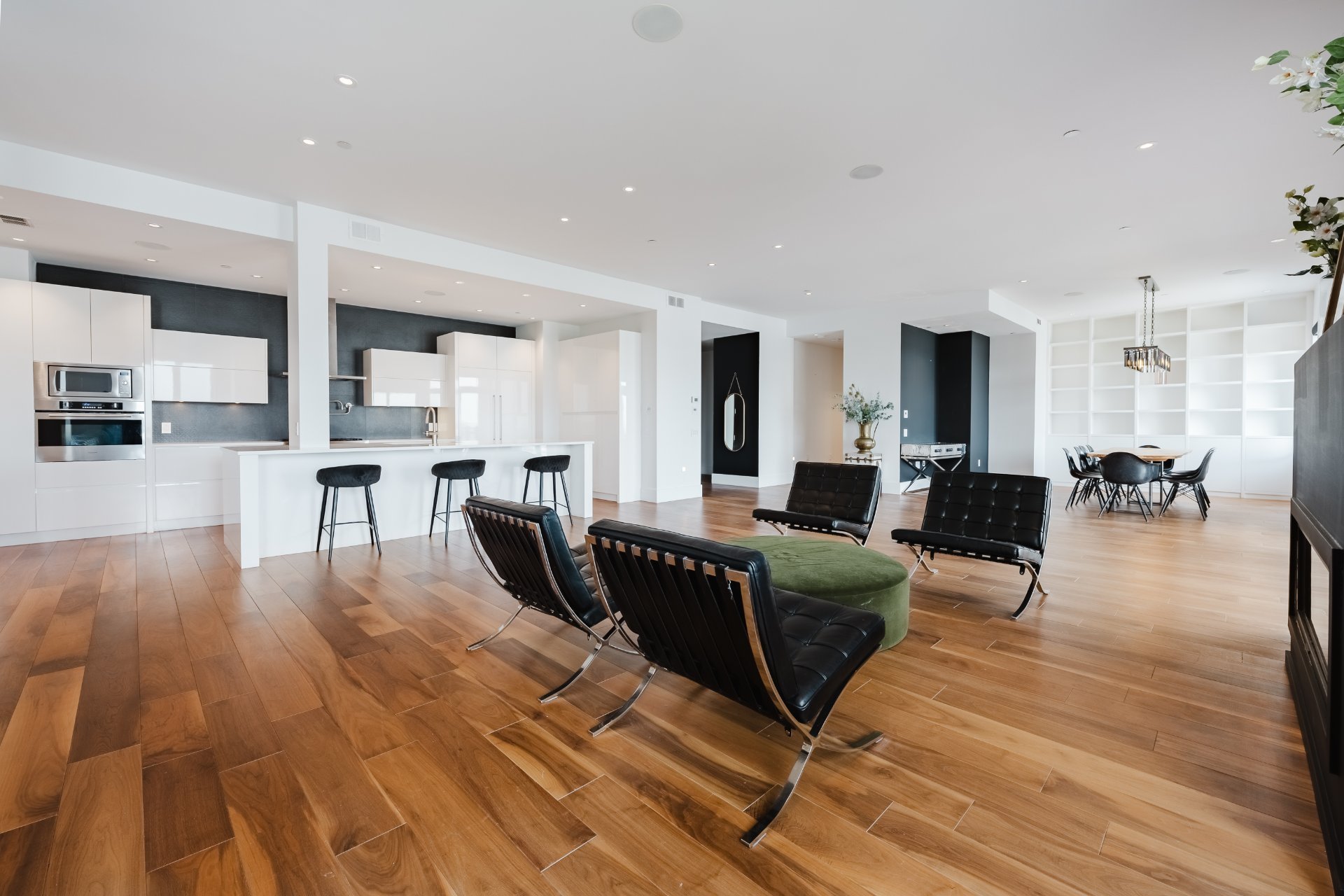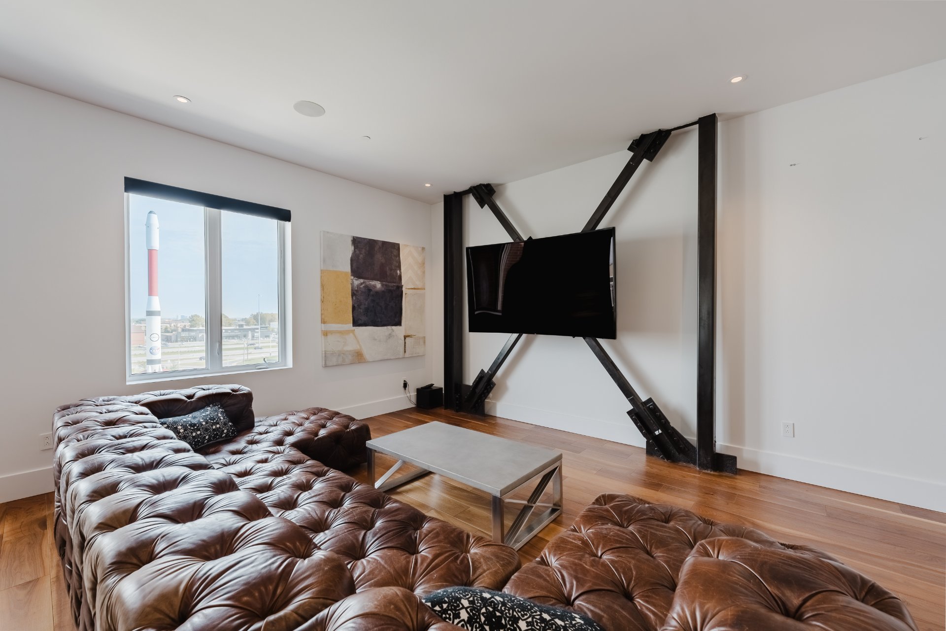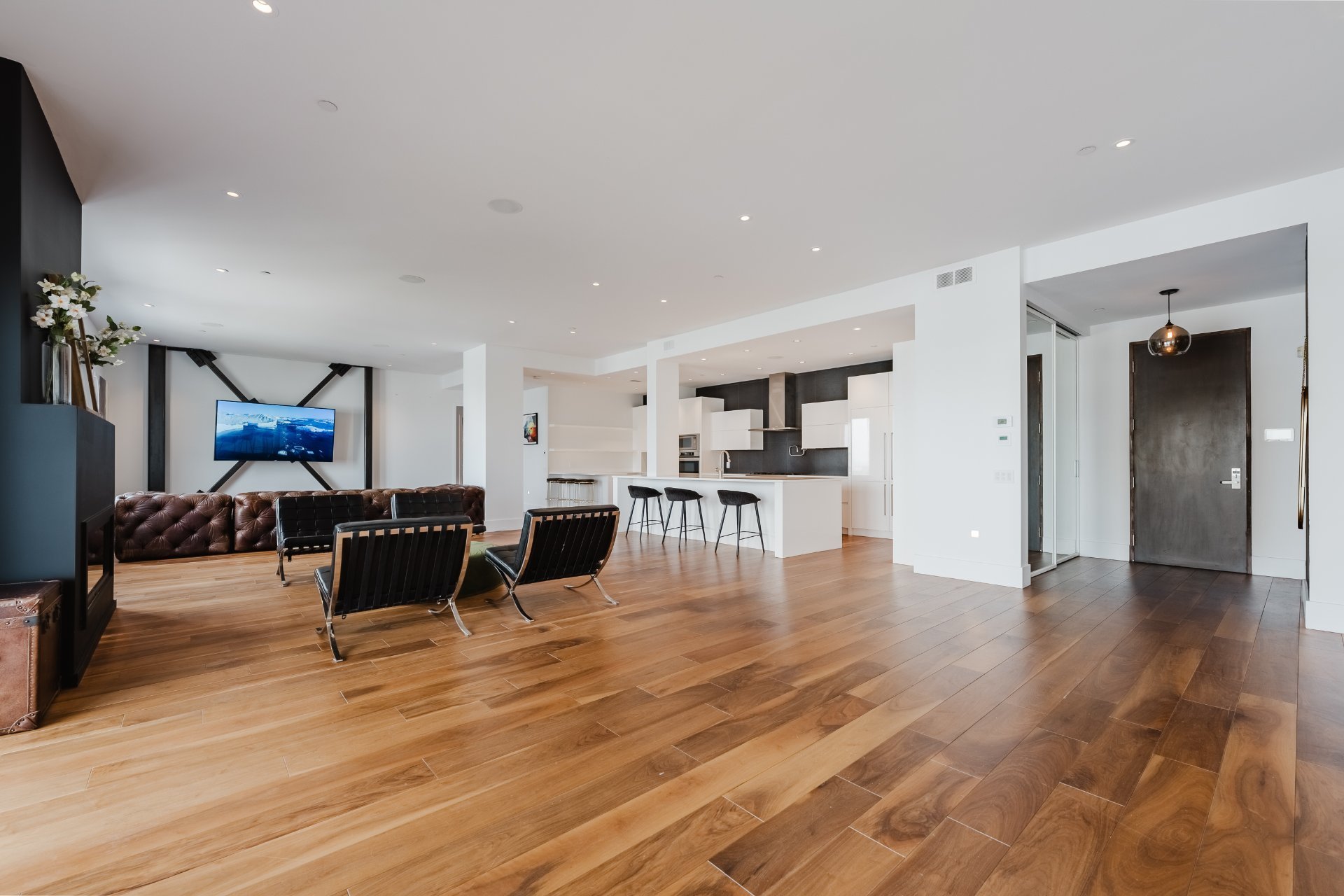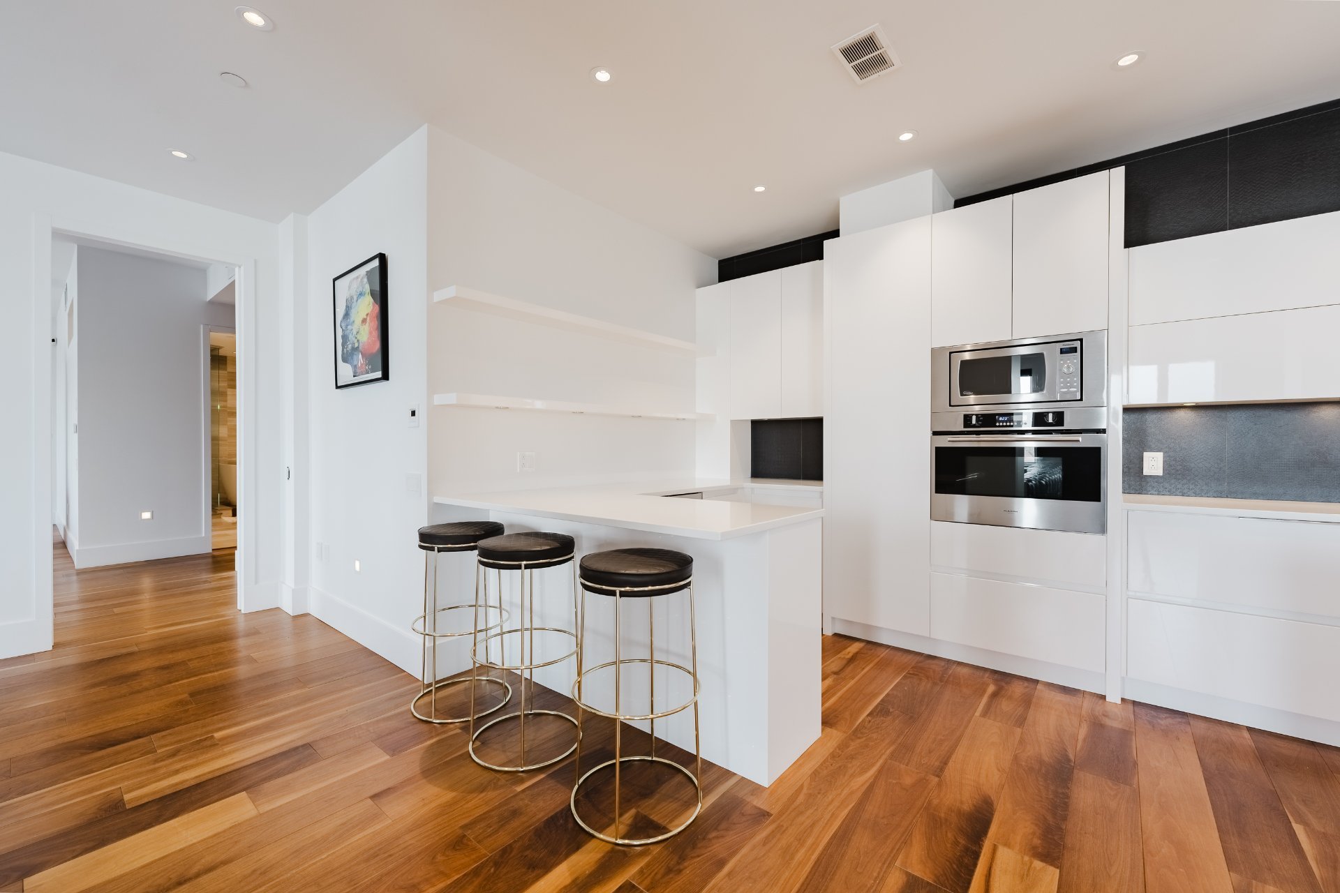 Located on the top floor, this spacious unit offers spectacular panoramic views of the city. The living area, with its generous windows, enjoys remarkable natural light thanks to the large windows that line the dining room and living room, opening onto a first balcony. The modern, chef-worthy kitchen features quartz countertops, two lunch counters, and ample storage.