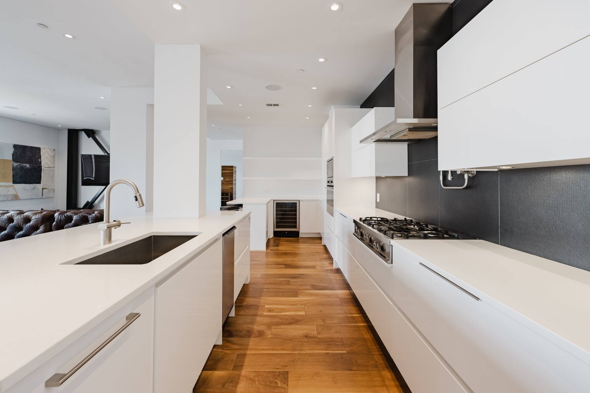 - Modern kitchen with quartz countertops, 2 lunch counters, abundant cabinetry and magnificent backsplash