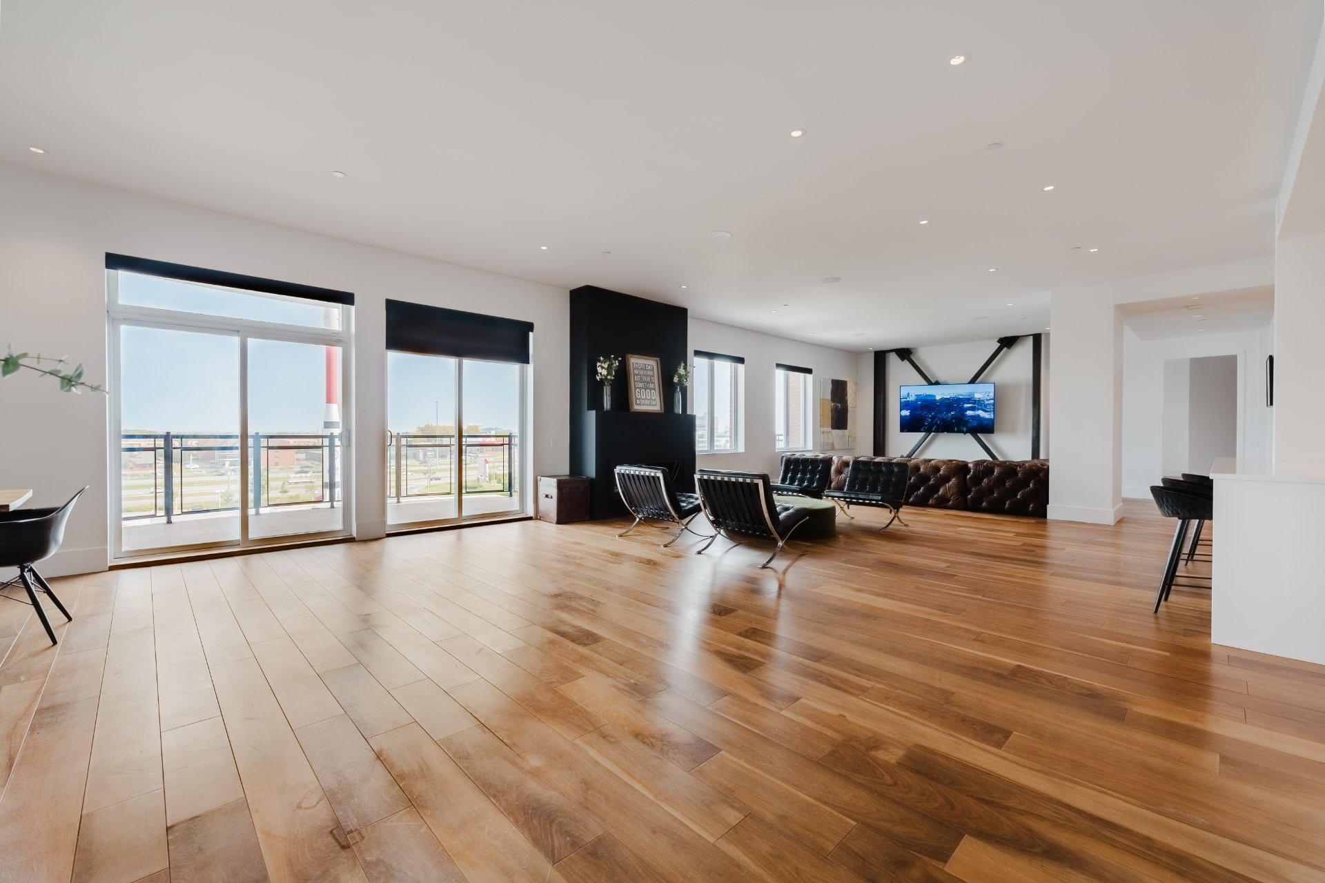 - Living and dining room with fireplace and access to first balcony with incredible city views
