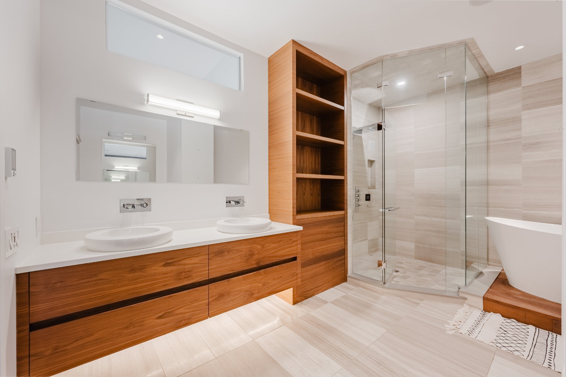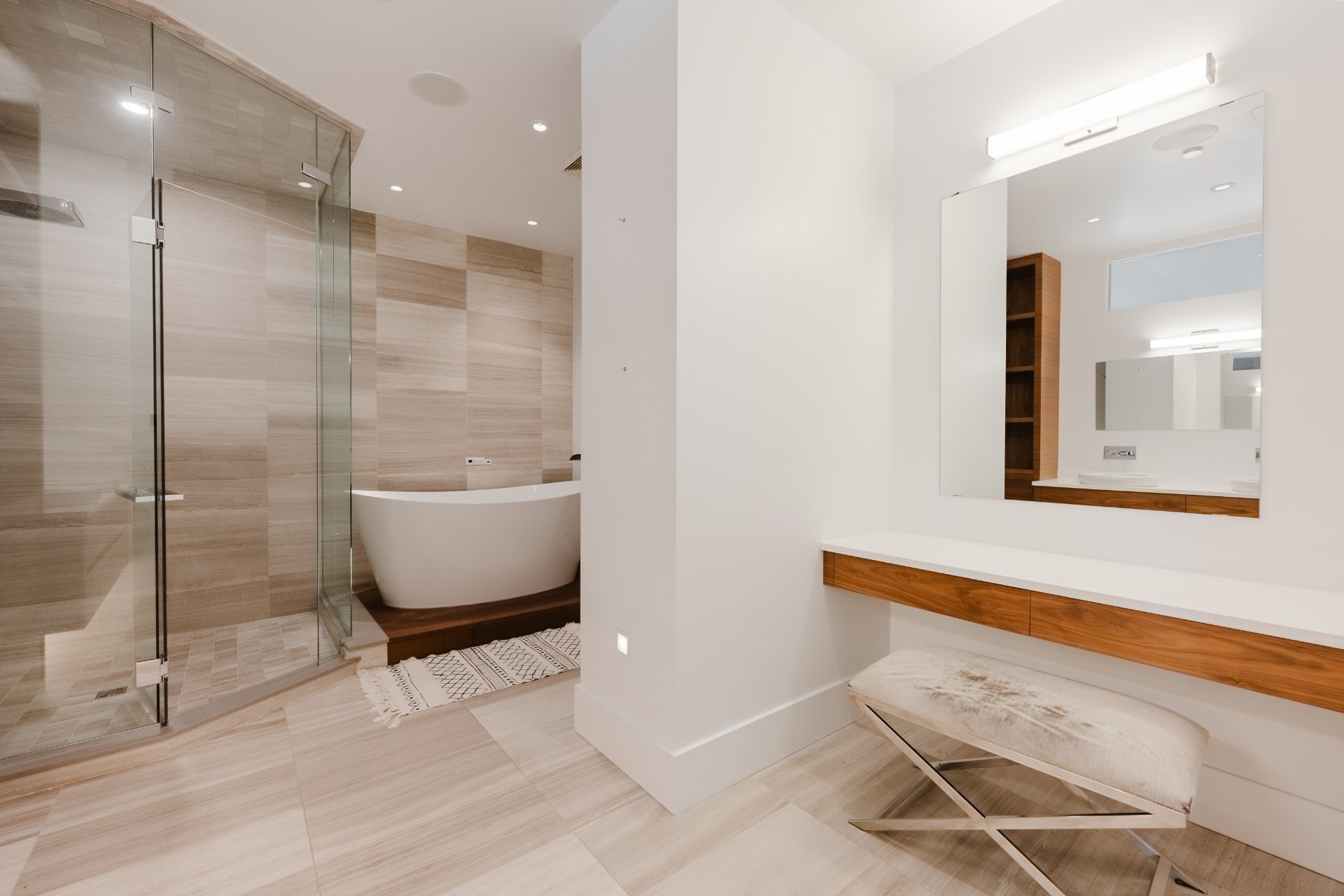 - En-suite bathroom with glass shower, freestanding tub, make-up area and storage space