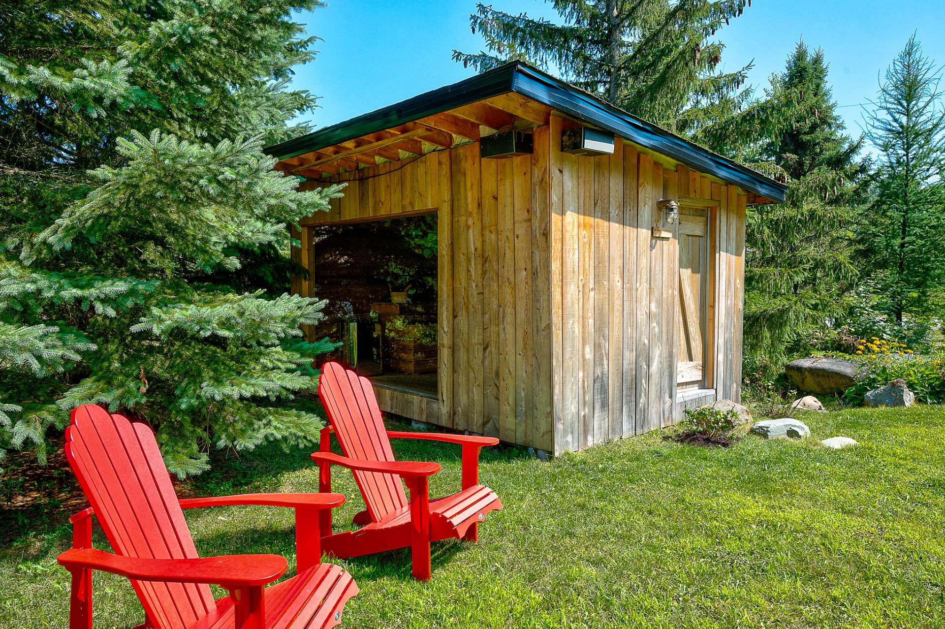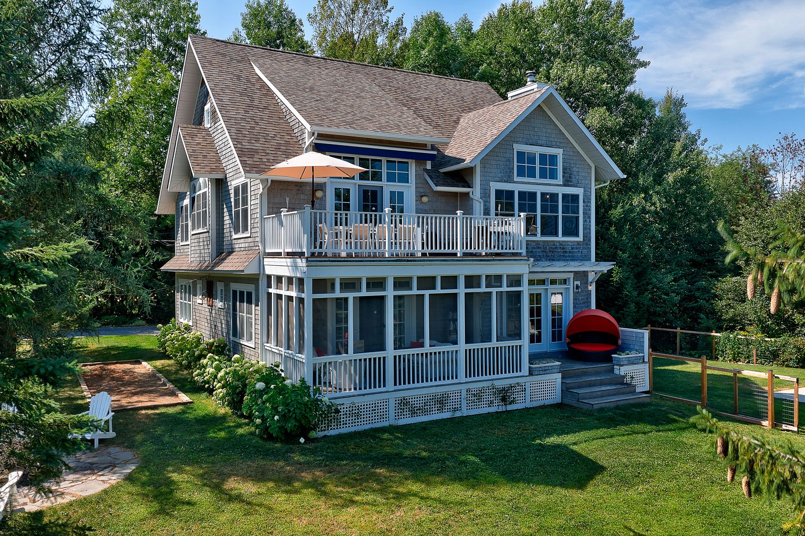 Outdoors, life feels like a permanent vacation: screened veranda, Finnish spa with a panoramic window to enjoy nature, outdoor shower, heated saltwater pool (14 × 30 ft), illuminated bocce court, and a firepit area.