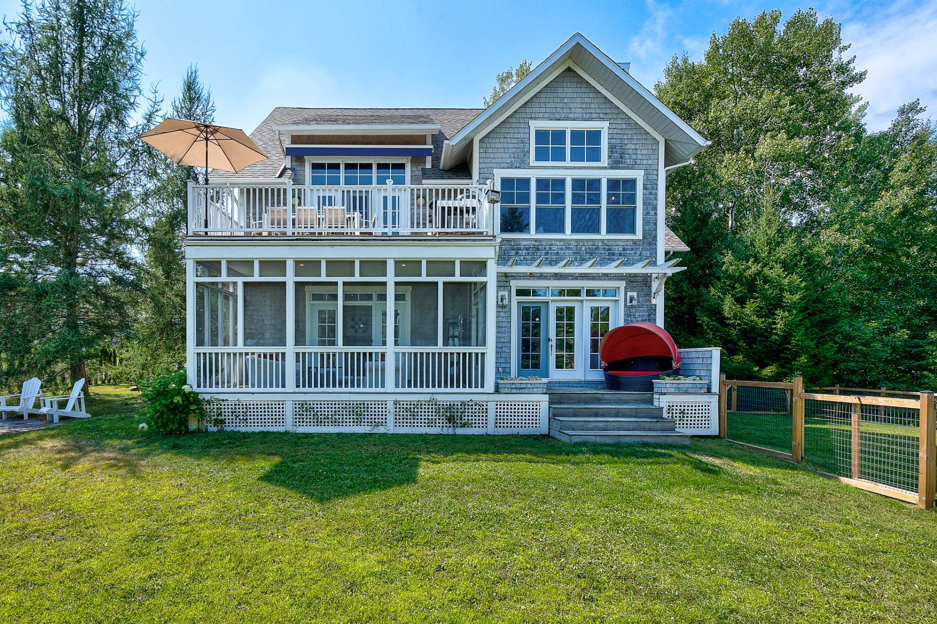 Every detail exudes authenticity: cedar shingle siding, nautical accents, warm woodwork, exposed beams, a staircase with raw accents enhanced by a handcrafted wrought-iron handrail, and a wood-burning fireplace.