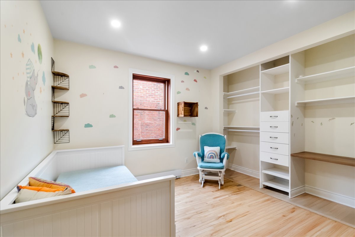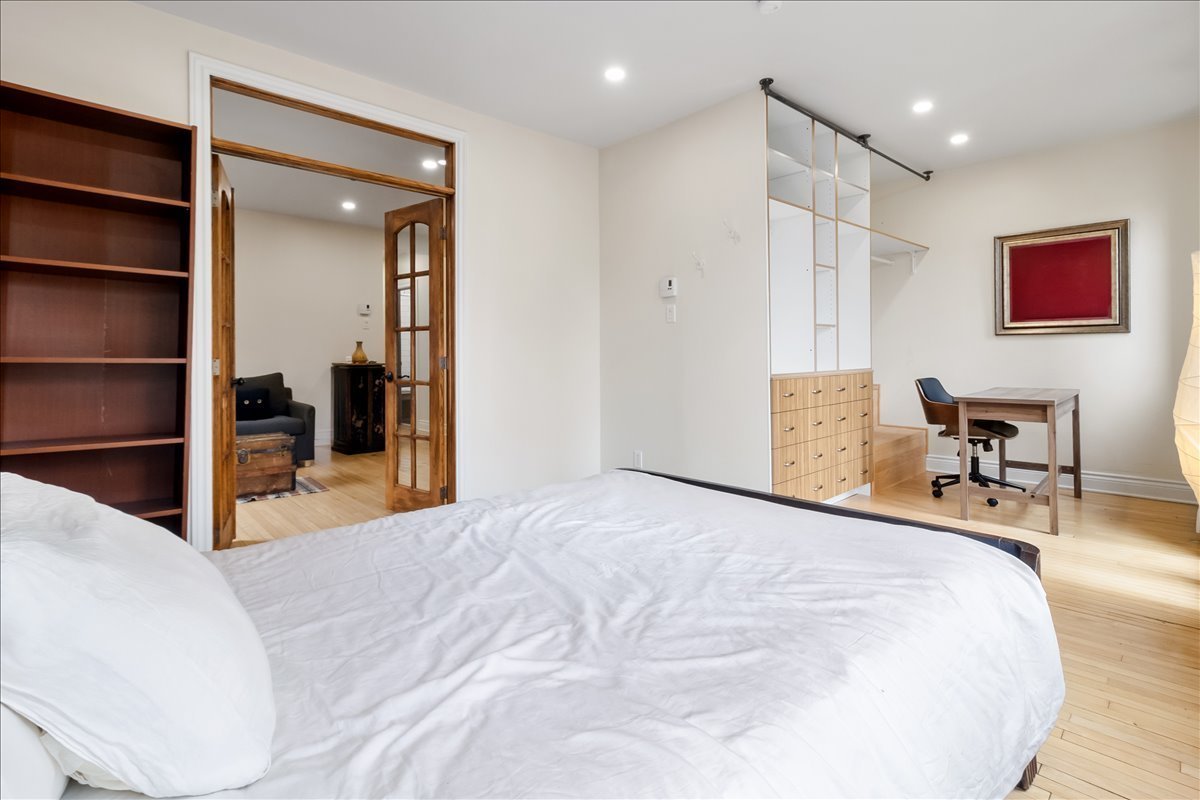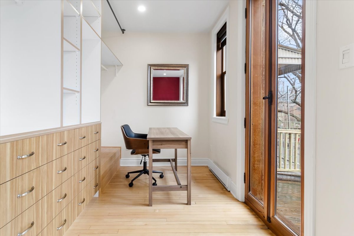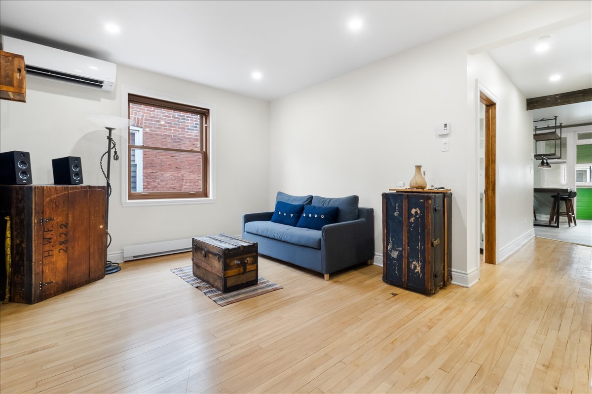 Renovated upper unit of an undivided duplex, located in the heart of Côte-des-Neiges, within walking distance of the metro, shops, and services. Bright open-concept living area offering a seamless flow between the living room, dining room, and kitchen. Modern kitchen with central island and ample built-in storage. Two bedrooms, including a spacious primary bedroom with a dedicated office area. One bathroom and one powder room featuring skylights. Windows on three sides, wall-mounted heat pump, and storage space in the basement.