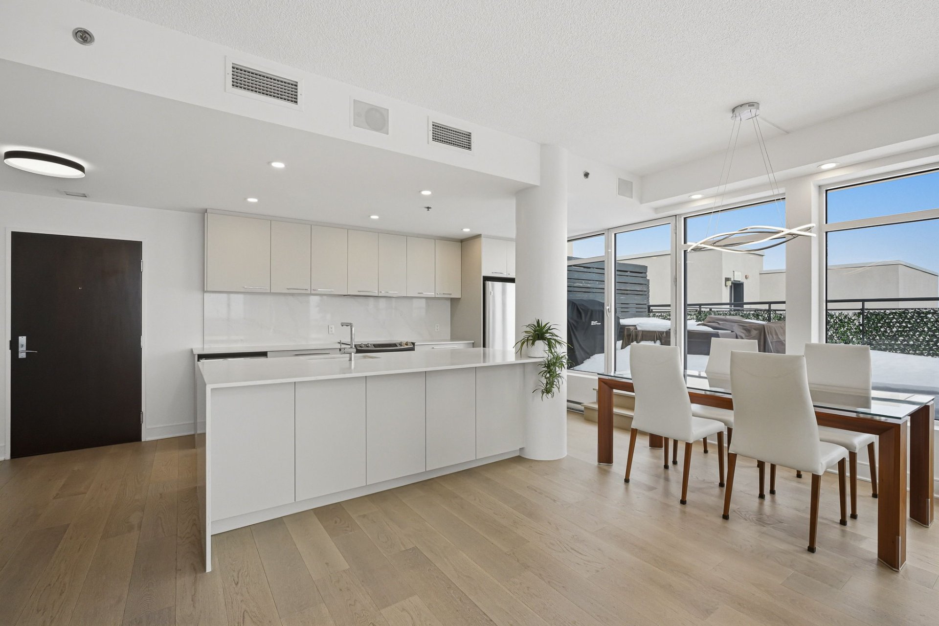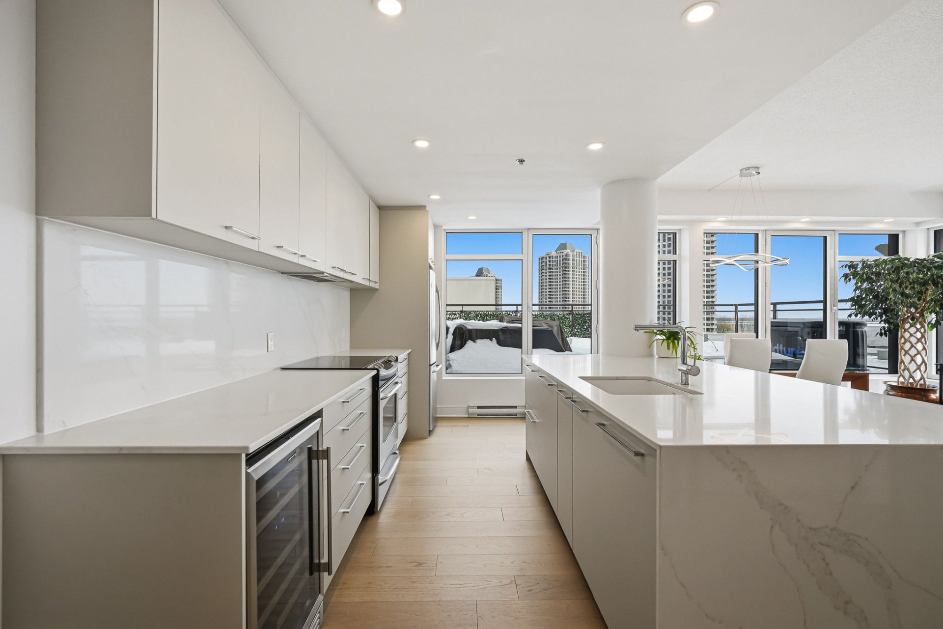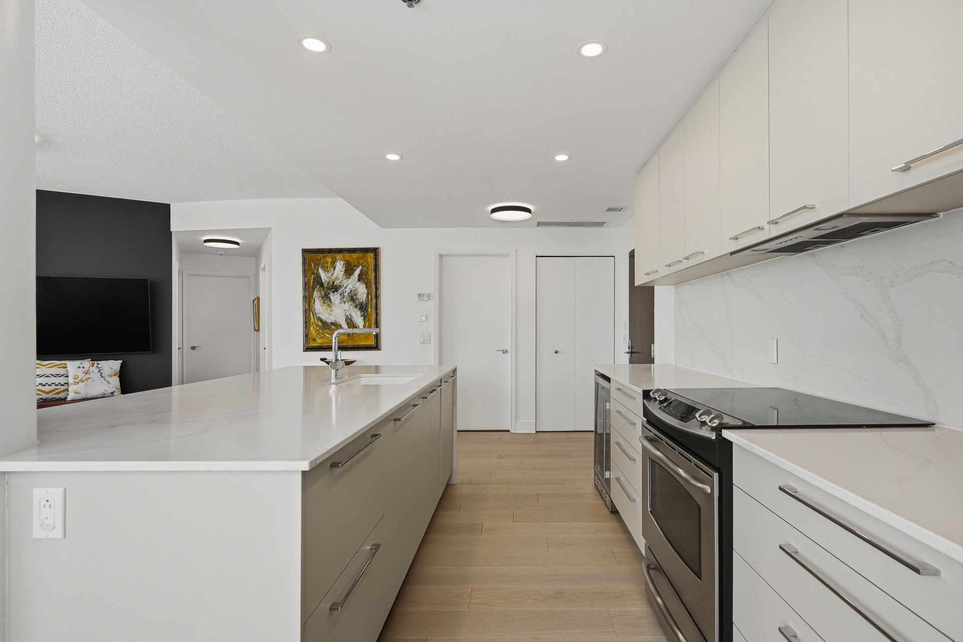 The kitchen has been recently renovated in modern, refined tones. It features a large quartz central island measuring approximately 8 feet by 4 feet, which can accommodate at least four seats, ideal for entertaining or everyday meals.