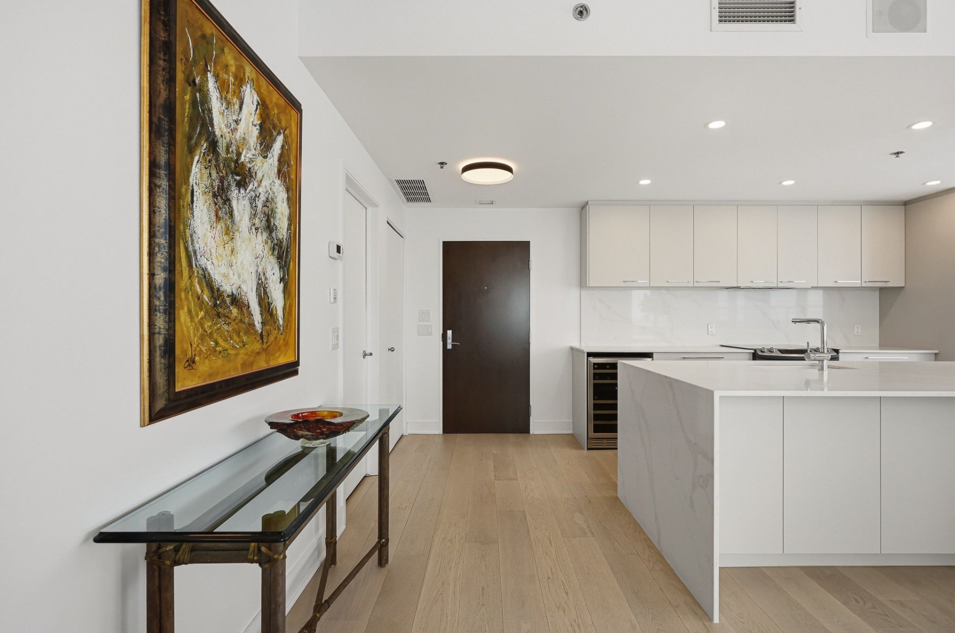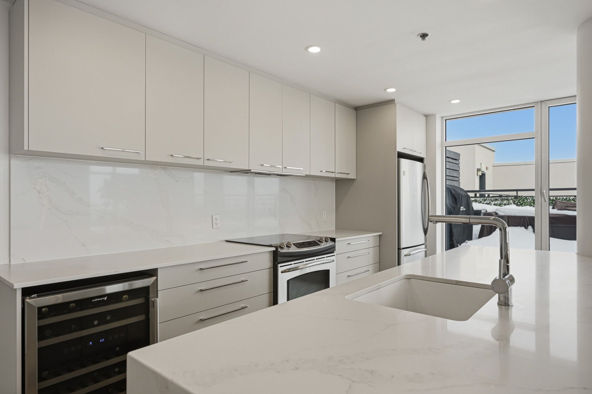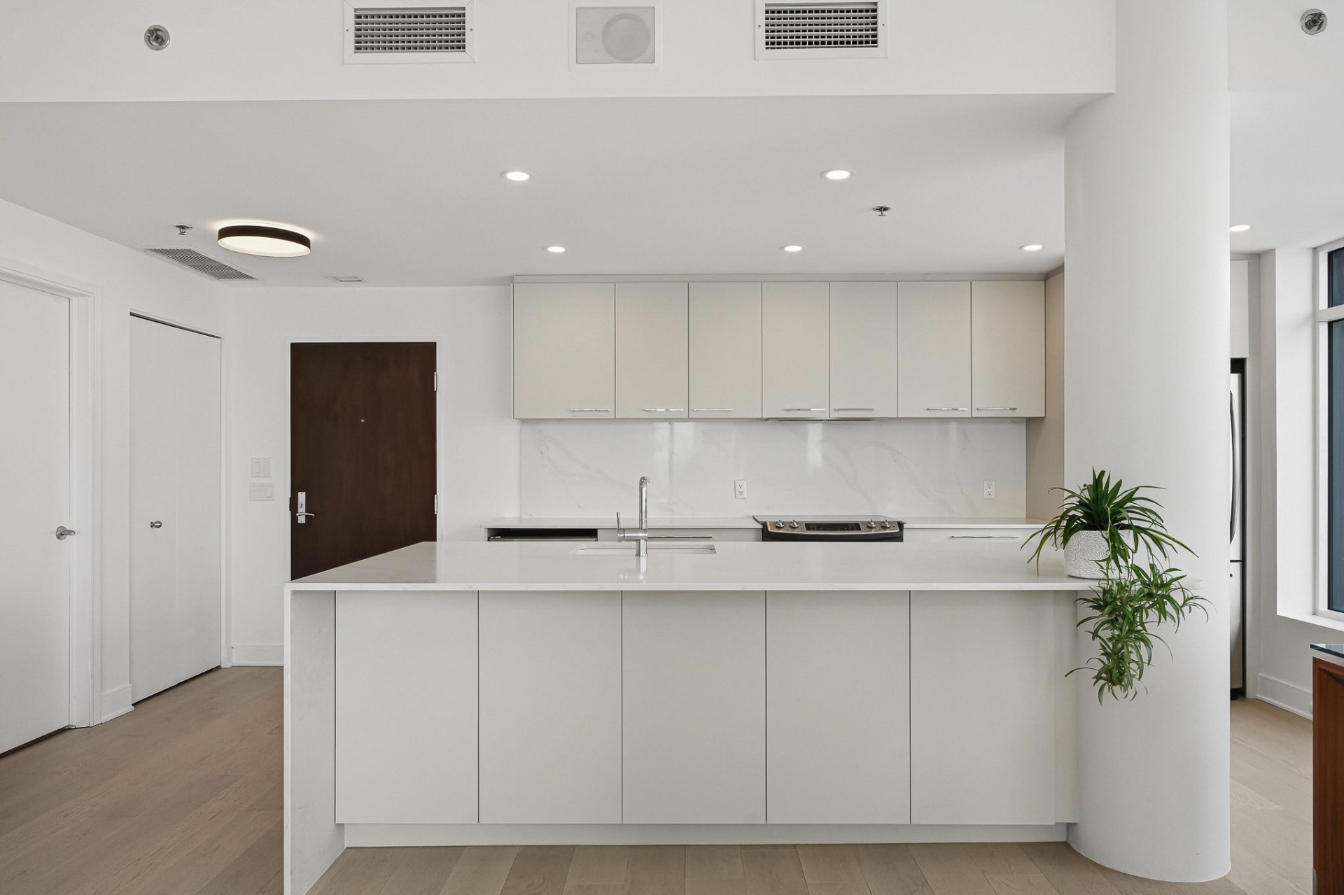 The kitchen has been recently renovated in modern, refined tones. It features a large quartz central island measuring approximately 8 feet by 4 feet, which can accommodate at least four seats, ideal for entertaining or everyday meals.