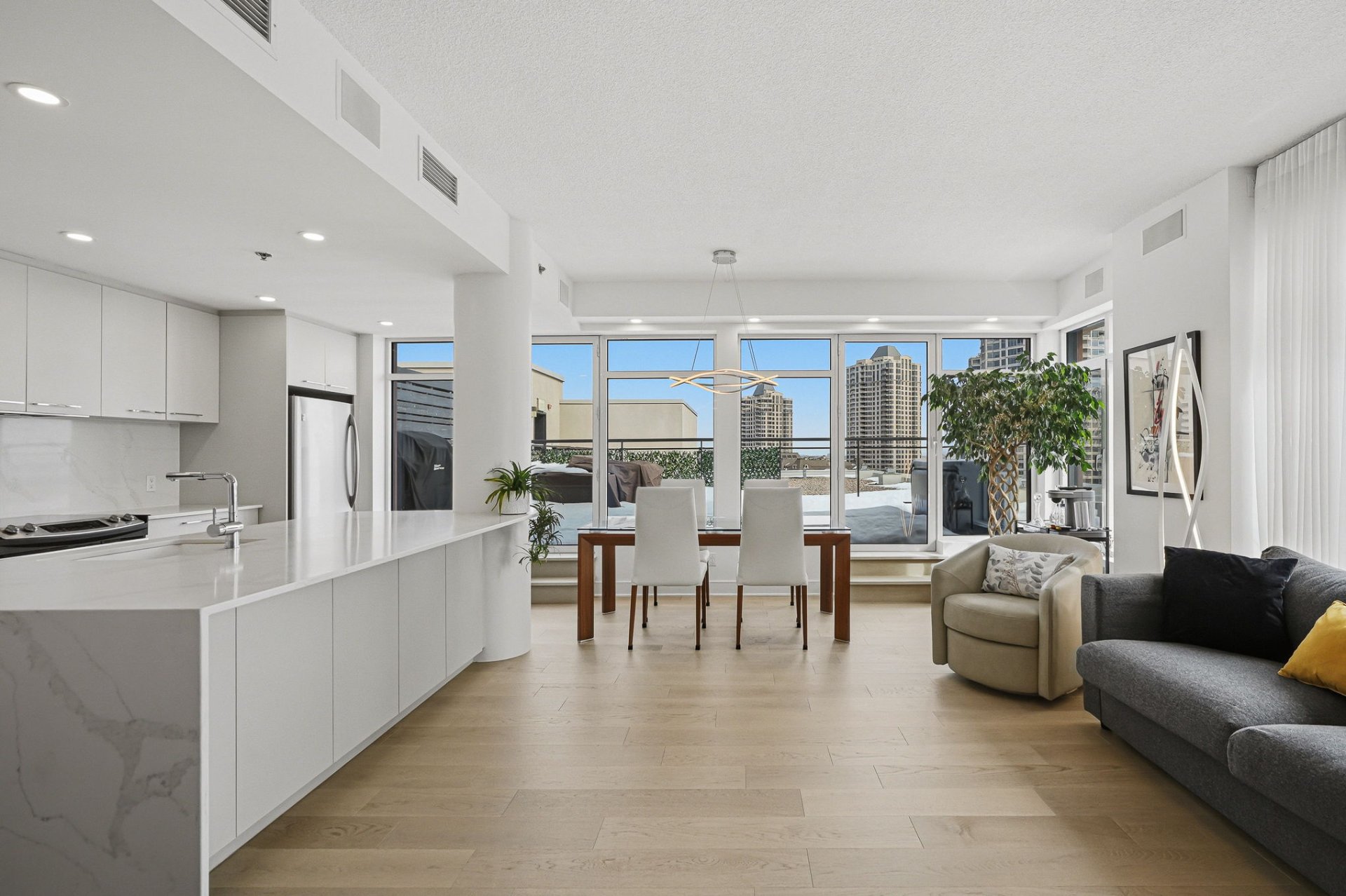 PH#2 penthouse located on the 7th and top floor, offering spectacular south facing views of the river and the city through abundant windows in every room. This 1,007 sq. ft. unit features 2 bedrooms and 2 full bathrooms, including an ensuite to the primary bedroom. The second bathroom includes a sauna. Recently renovated kitchen with an 8 x 4 ft quartz island that can accommodate at least four seats. Newly installed white oak hardwood floors. Private terrace measuring 12.4 x 23 ft accessible directly from the unit. Includes a storage space and 3 indoor parking spaces, including one tandem.