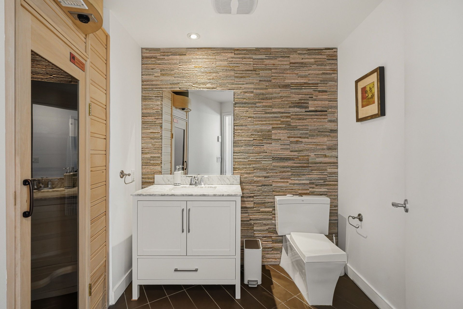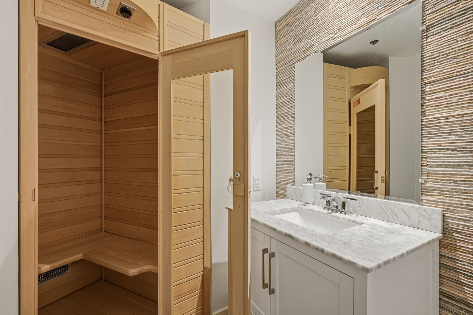 The primary bedroom features its own ensuite bathroom. The second bathroom includes an integrated sauna, offering a relaxation space directly within the unit.
