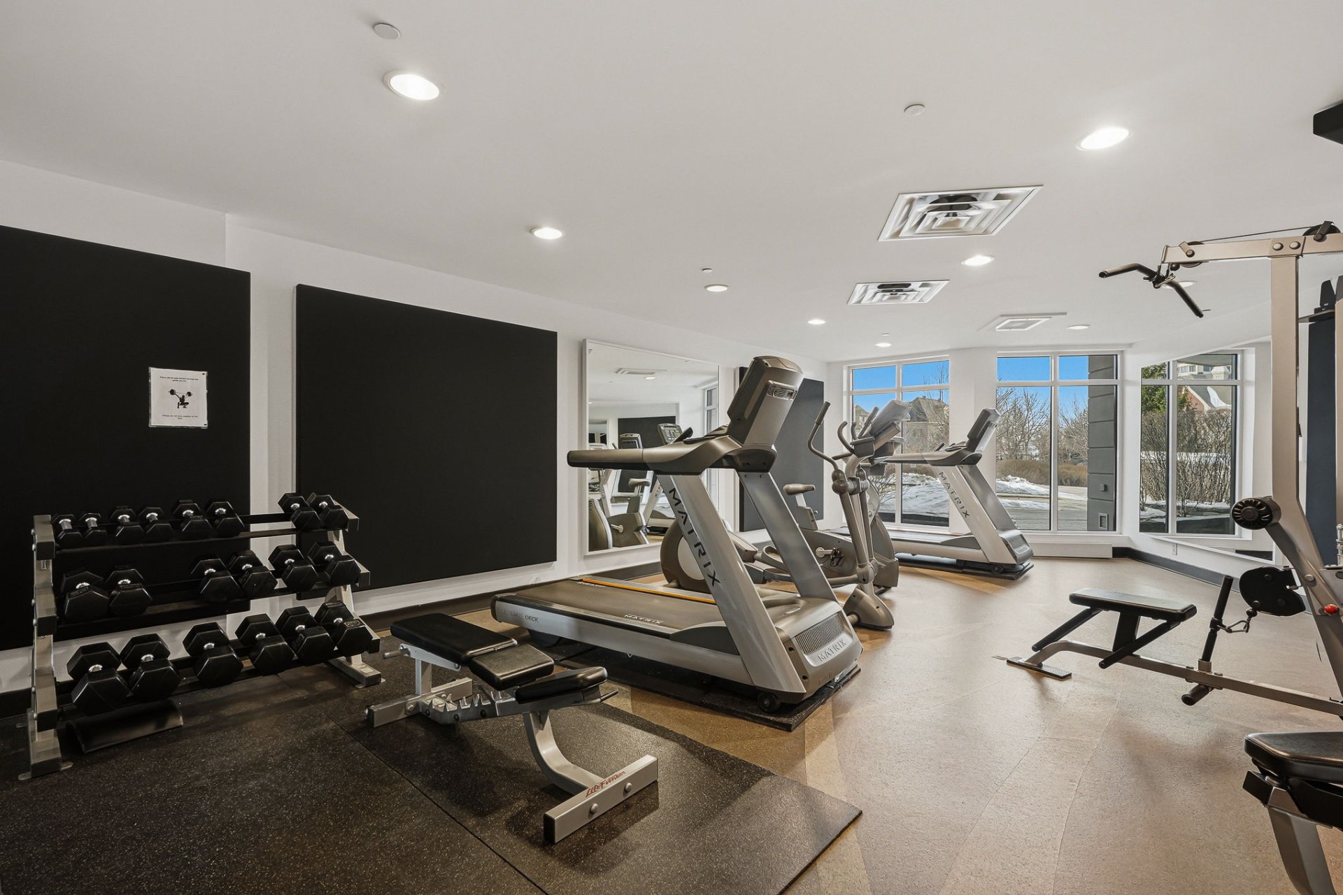 Fitness room equipped with television and exterior views