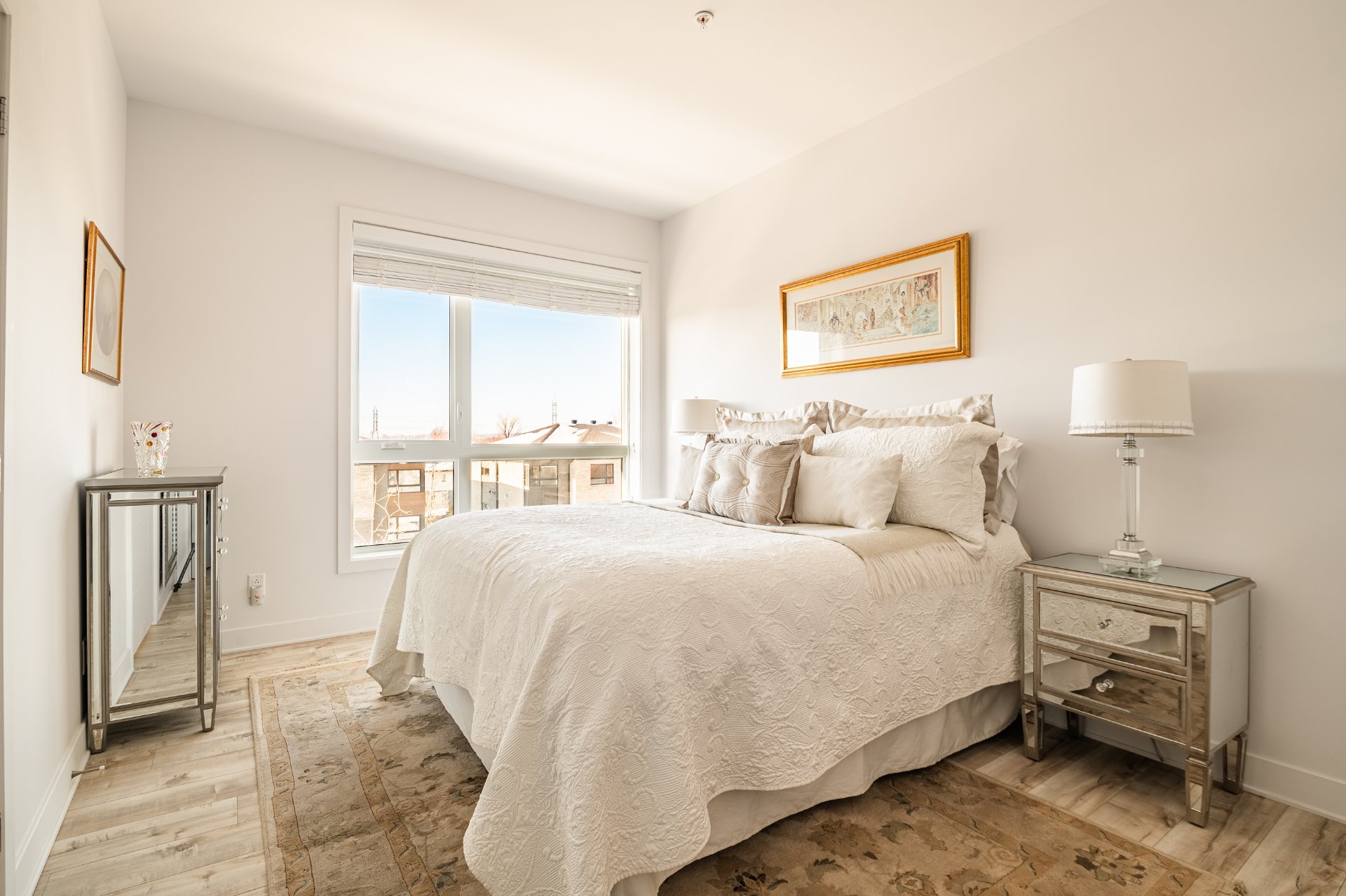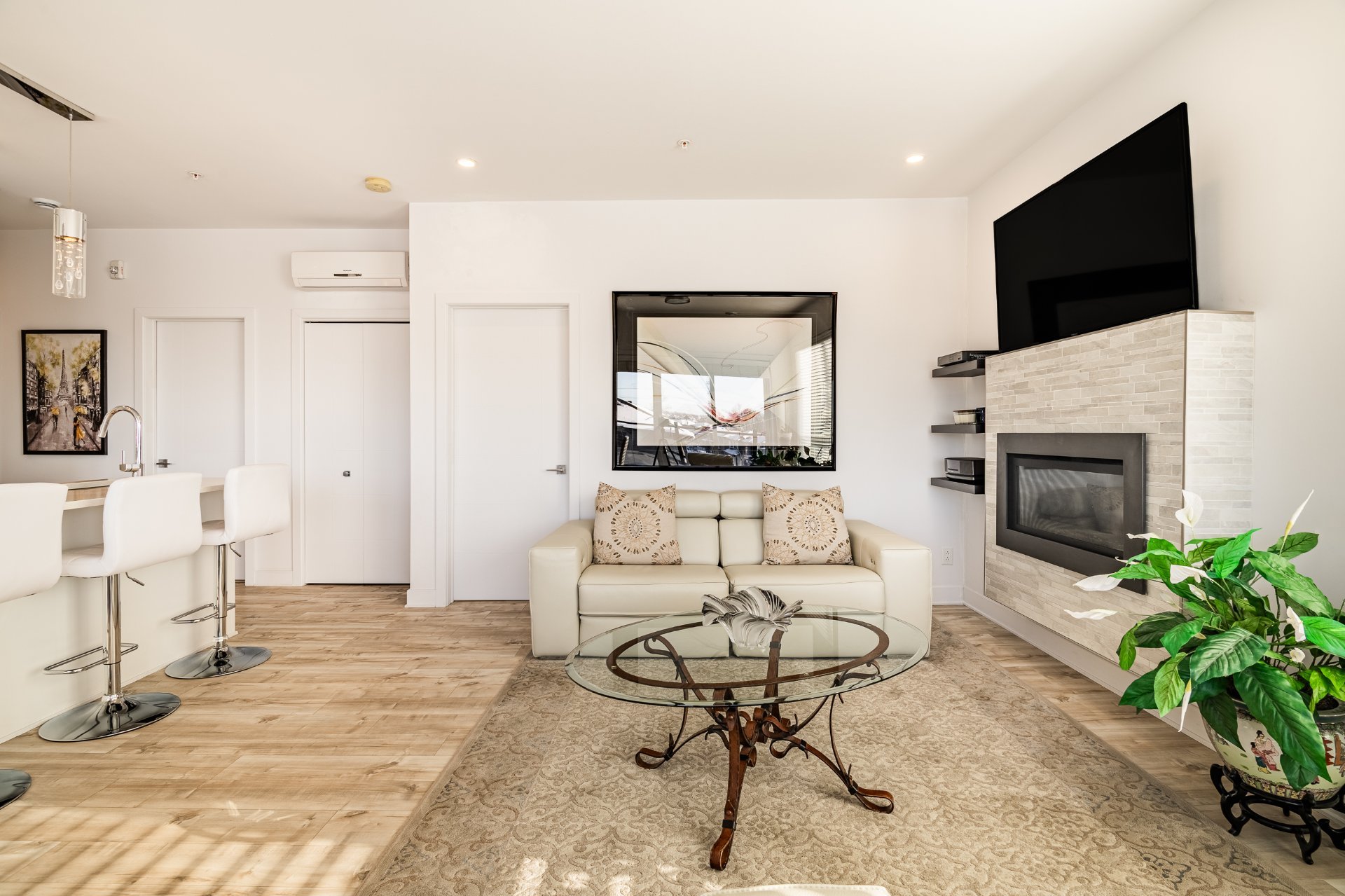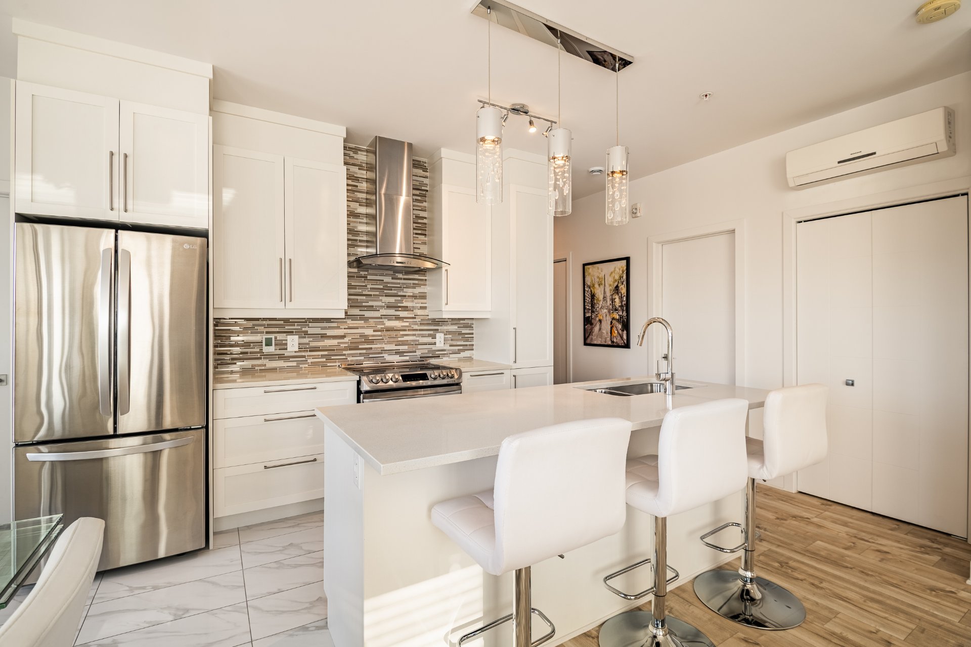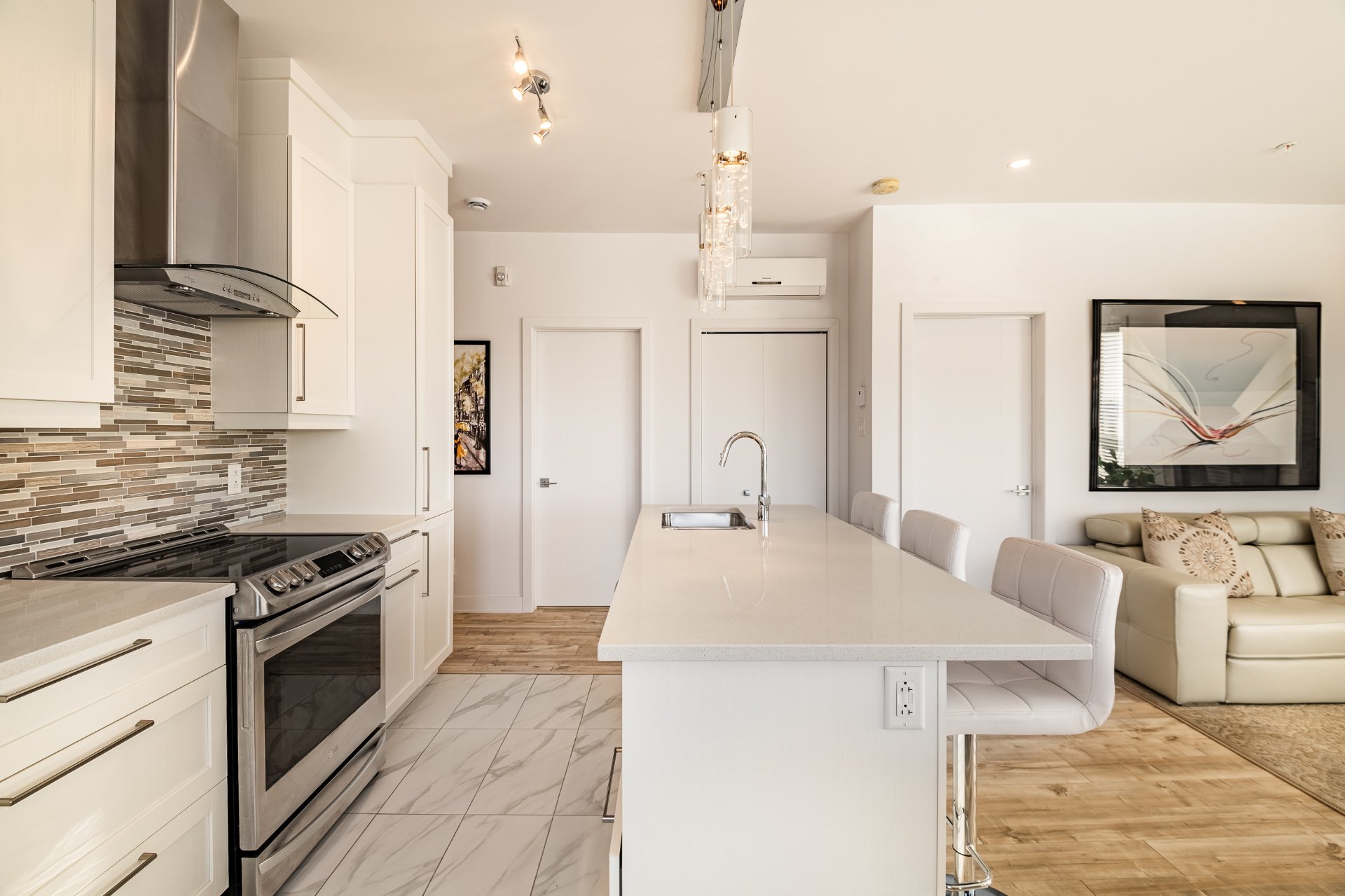Nestled on the 4th floor, this unit stands out for its refined design and bright atmosphere. It offers two spacious bedrooms, a bathroom, and a shower room adjoining the master bedroom, harmoniously combining aesthetics and functionality. The open-concept living space is enhanced by a contemporary kitchen with quartz countertops, a large island that seats three guests, and optimized storage. The private balcony, with its unobstructed view of the city, is the perfect place to relax. Indoor parking and a meticulously maintained condominium ensure a carefree quality of life.