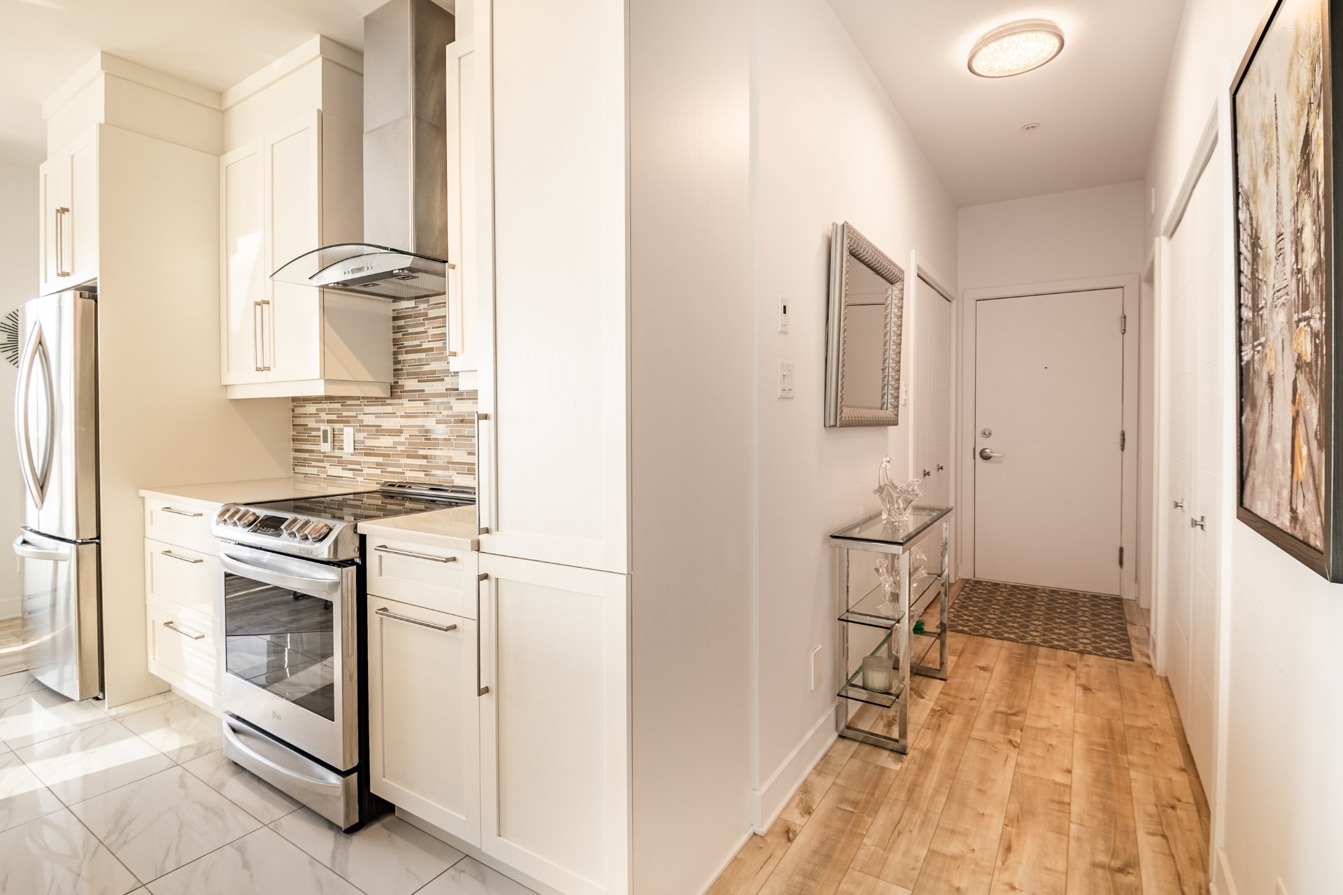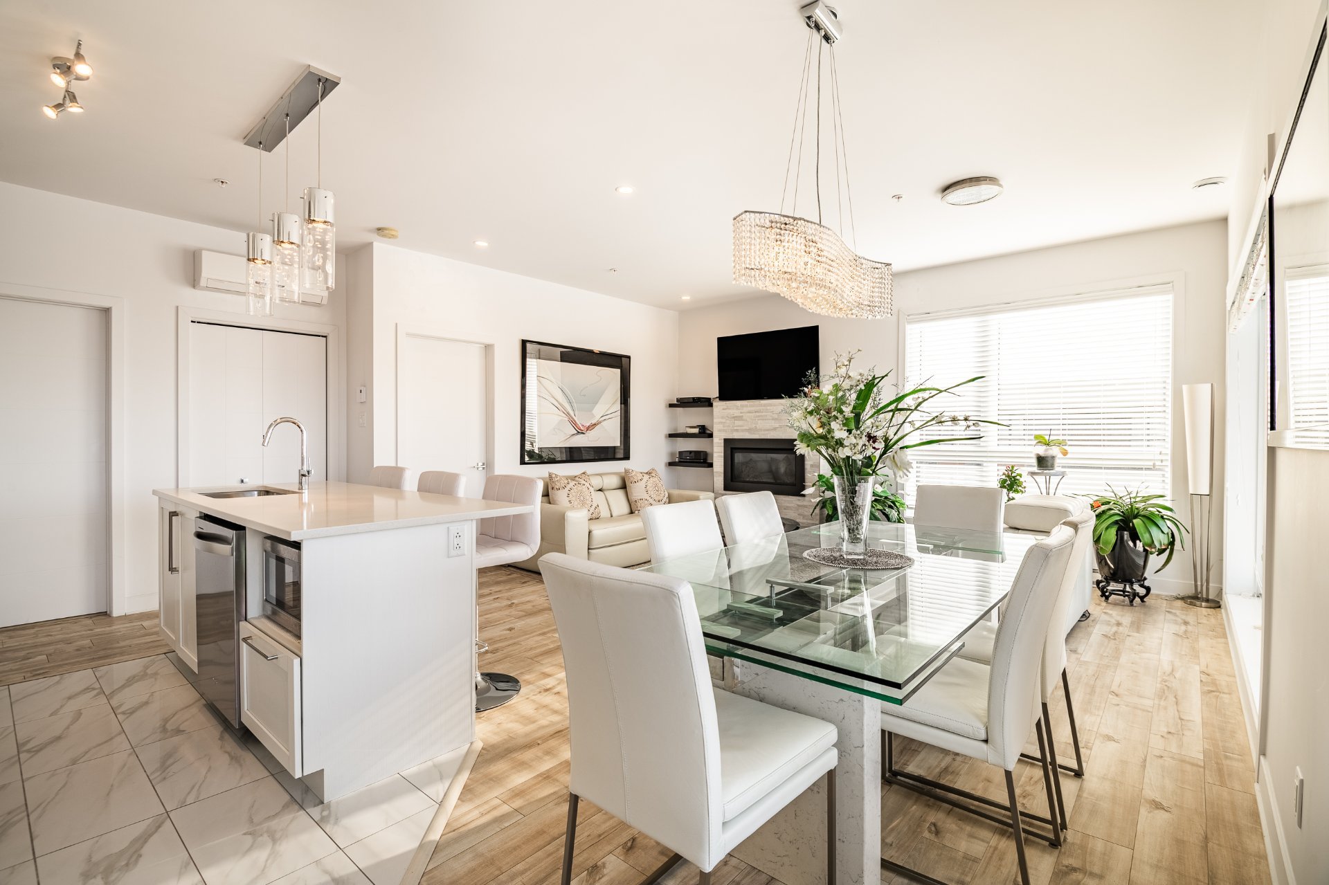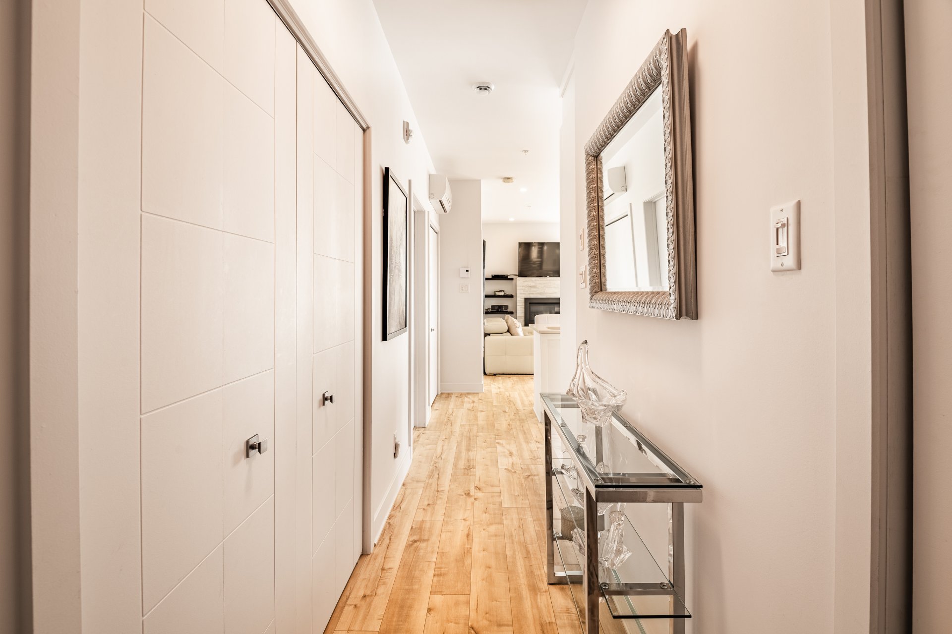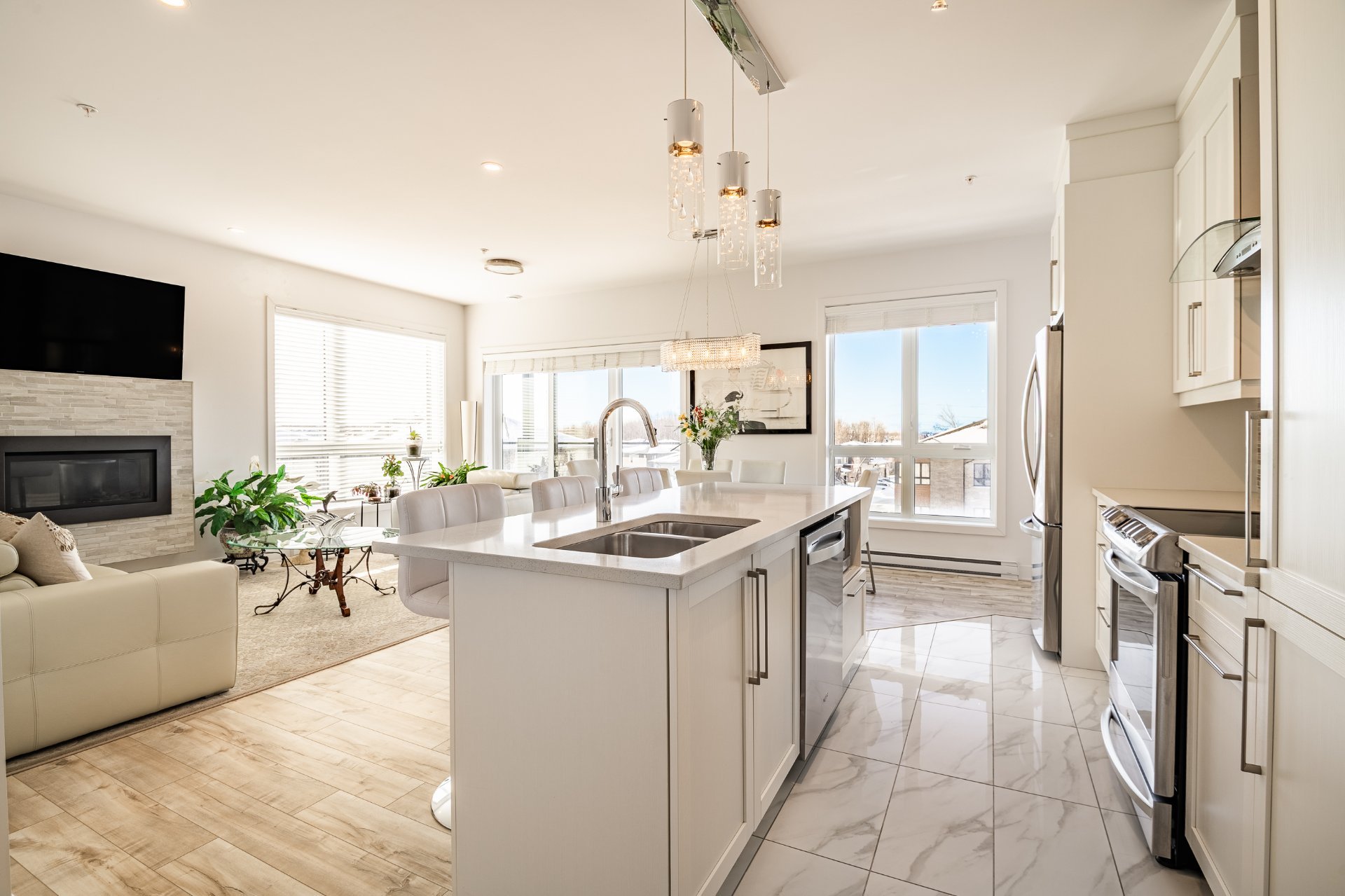 Nestled on the 4th floor, this unit stands out for its refined design and bright atmosphere. It offers two spacious bedrooms, a bathroom, and a shower room adjoining the master bedroom, harmoniously combining aesthetics and functionality. The open-concept living space is enhanced by a contemporary kitchen with quartz countertops, a large island that seats three guests, and optimized storage. The private balcony, with its unobstructed view of the city, is the perfect place to relax. Indoor parking and a meticulously maintained condominium ensure a carefree quality of life.