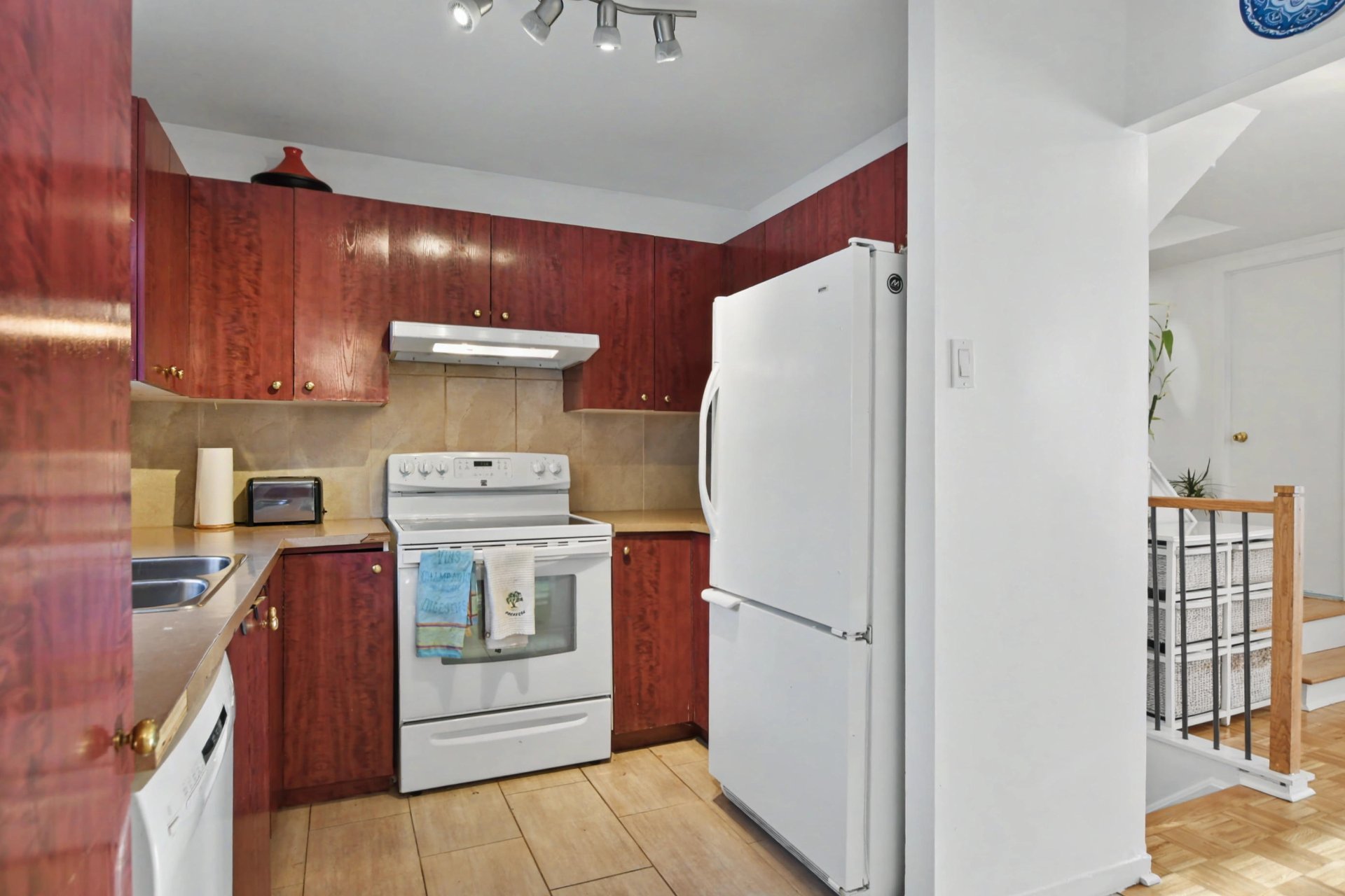 As you enter, you are welcomed by a practical entry closet leading to a spacious and bright living room filled with natural light. The kitchen features a functional layout with a built-in oven and microwave. The well-sized dining room provides access to the rear patio, and a powder room completes the main floor.