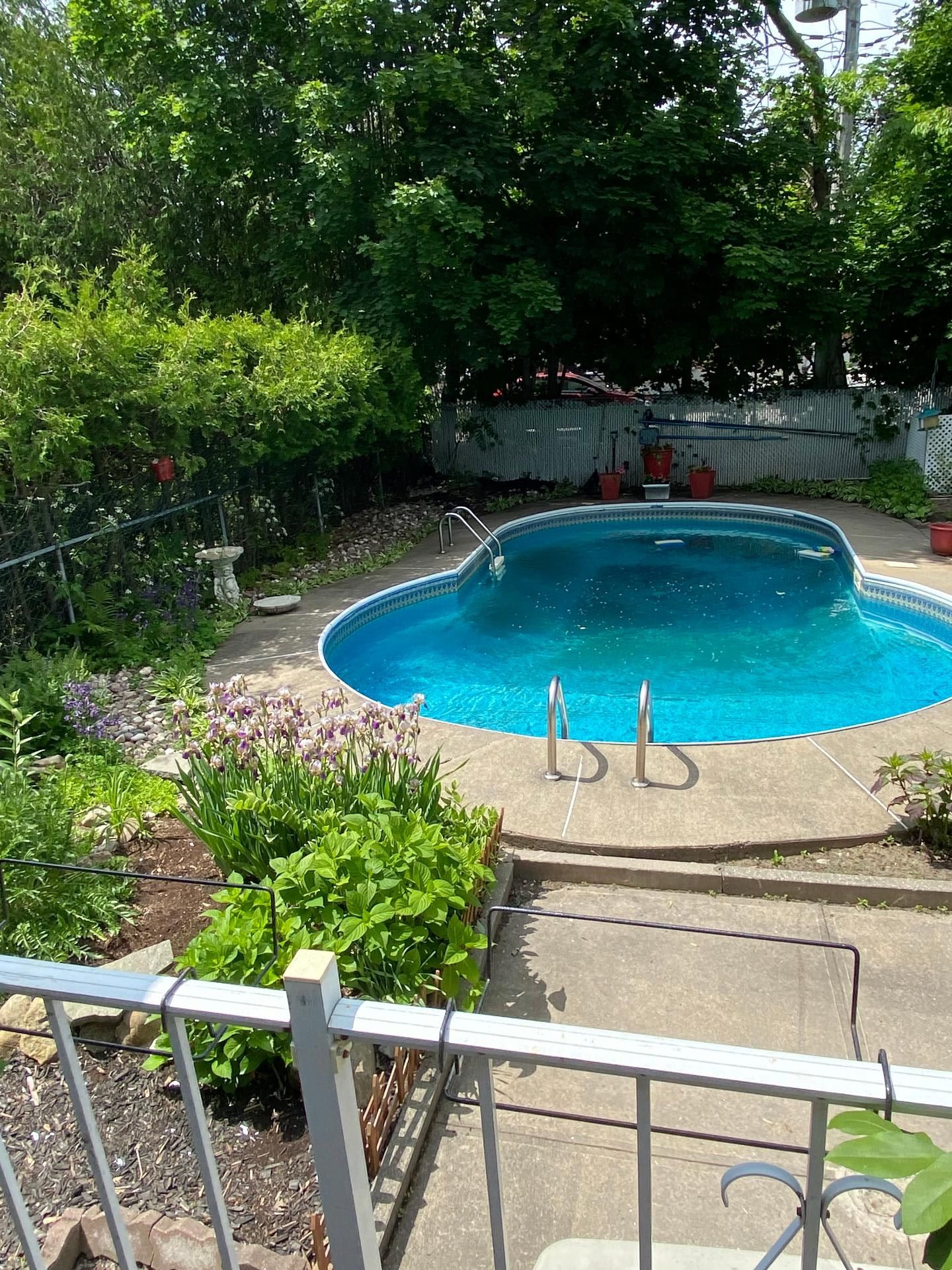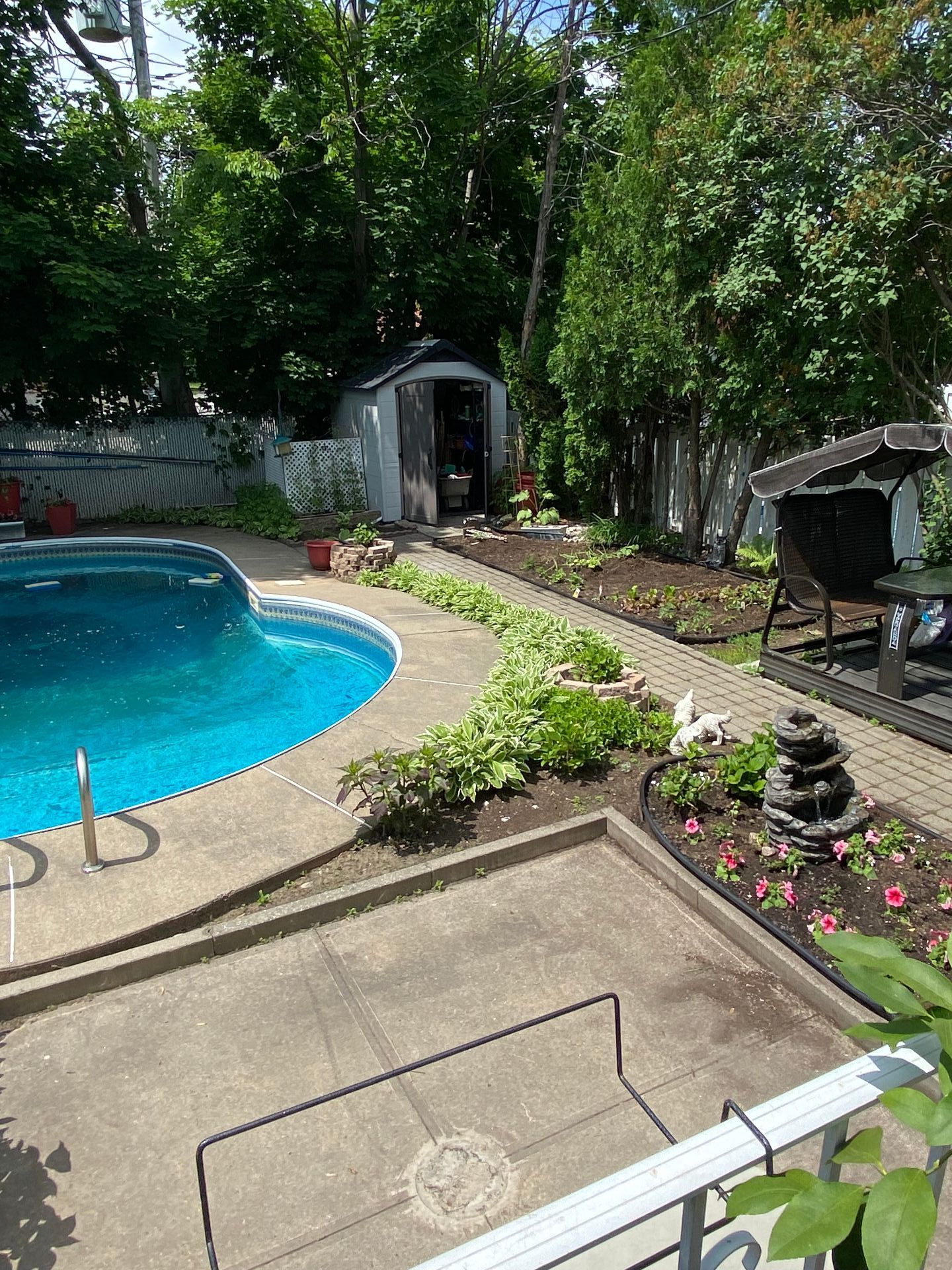 The backyard is spacious and well designed, featuring a large concrete patio, an in-ground pool, and a lovely outdoor area perfect for enjoying the warmer months.