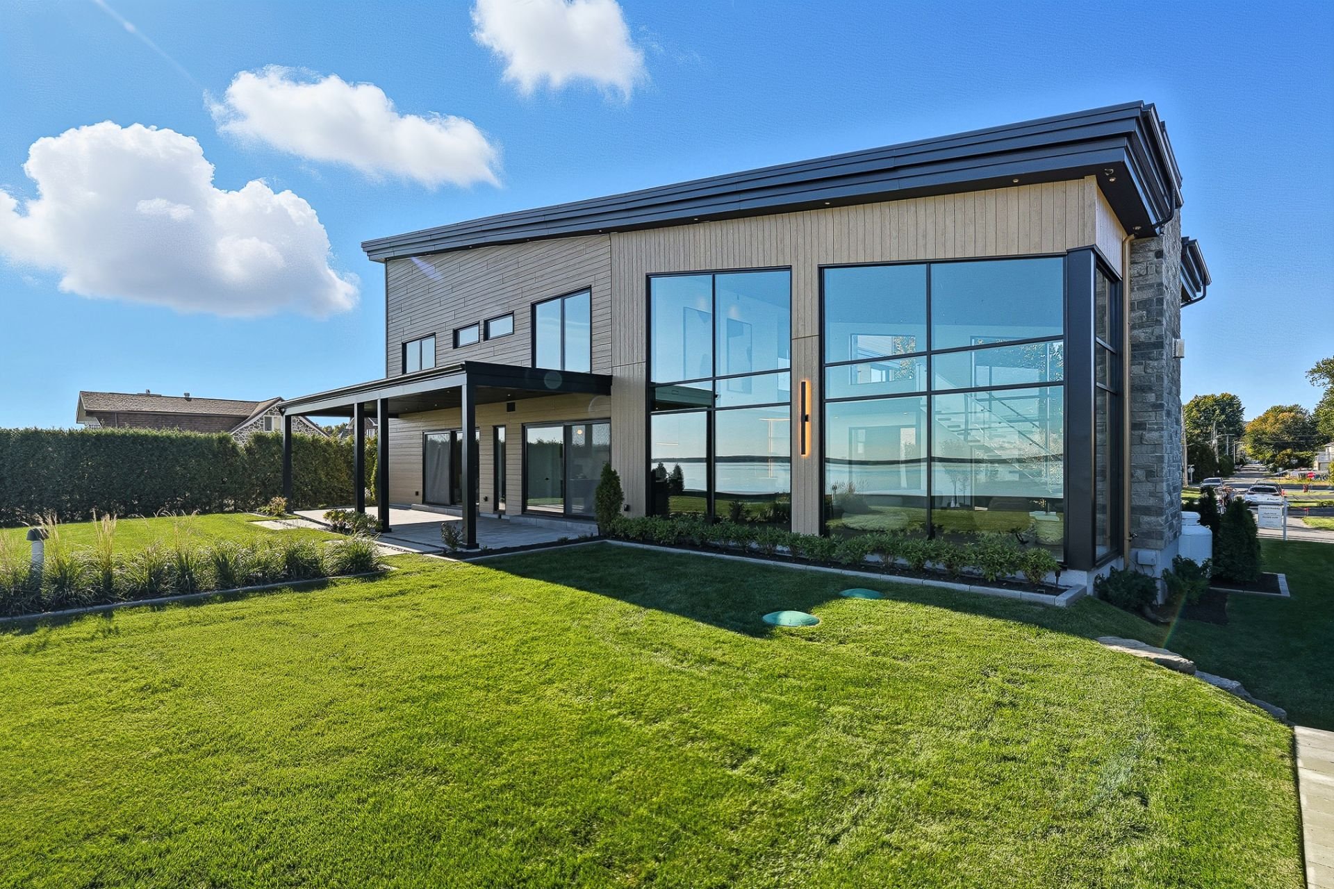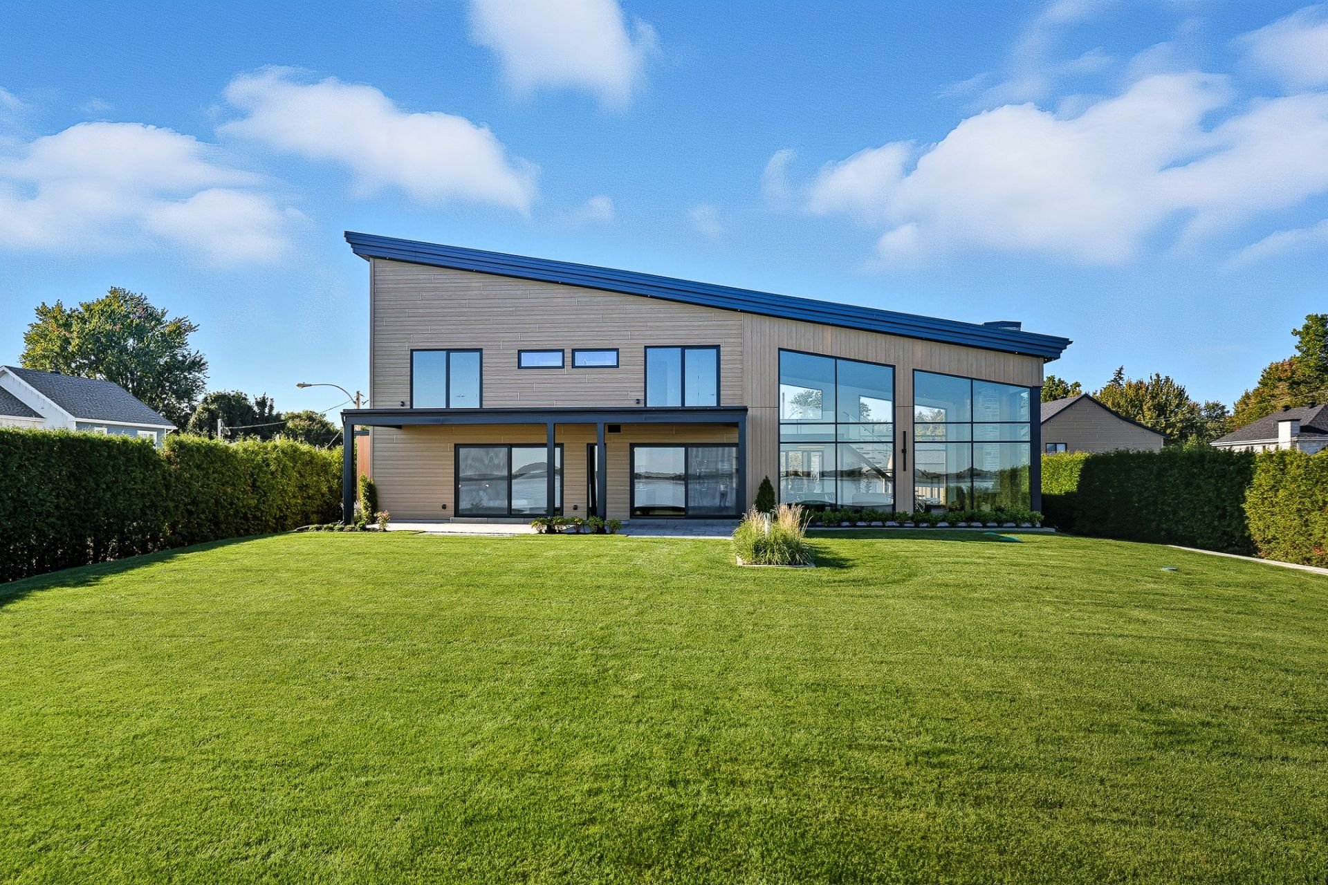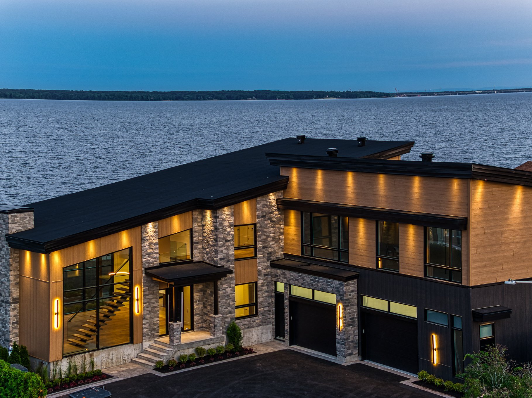 Elegance. Refinement. Waterfront. This brand-new contemporary residence delivers luxury living on the shores of Lake of Two Mountains. Over 5,400 sq.ft. of refined space: a quadruple ceramic-finished garage, two private terraces, and full-height windows framing breathtaking water views. A gourmet kitchen with built-in appliances, wine cellar, prep kitchen, and pot-filler faucet. Striking 22-ft cathedral living room with gas fireplace. Landscaped grounds, direct lake access and option for a private dock. Second civic address suitable for a private office or an independent living space.
