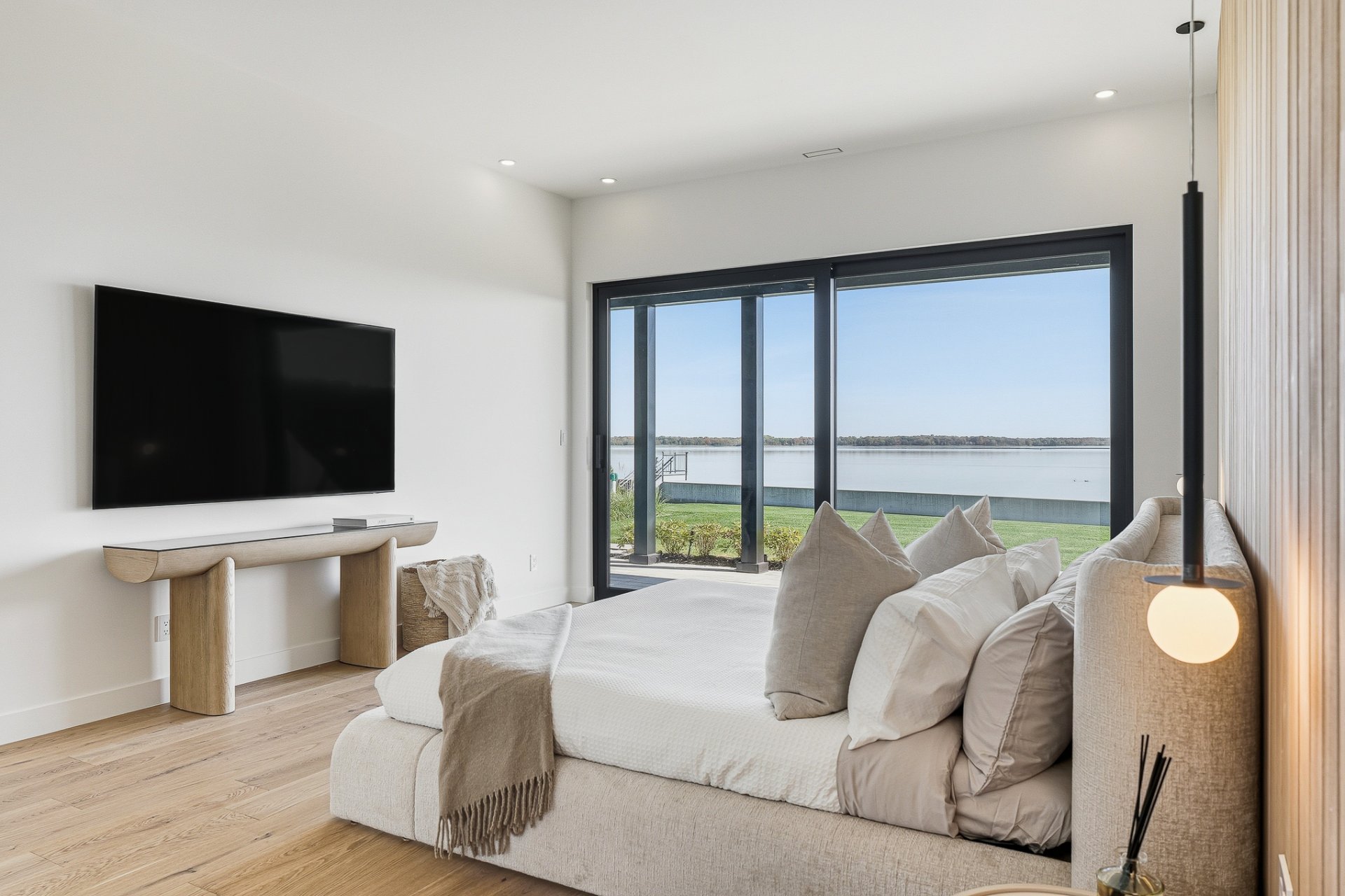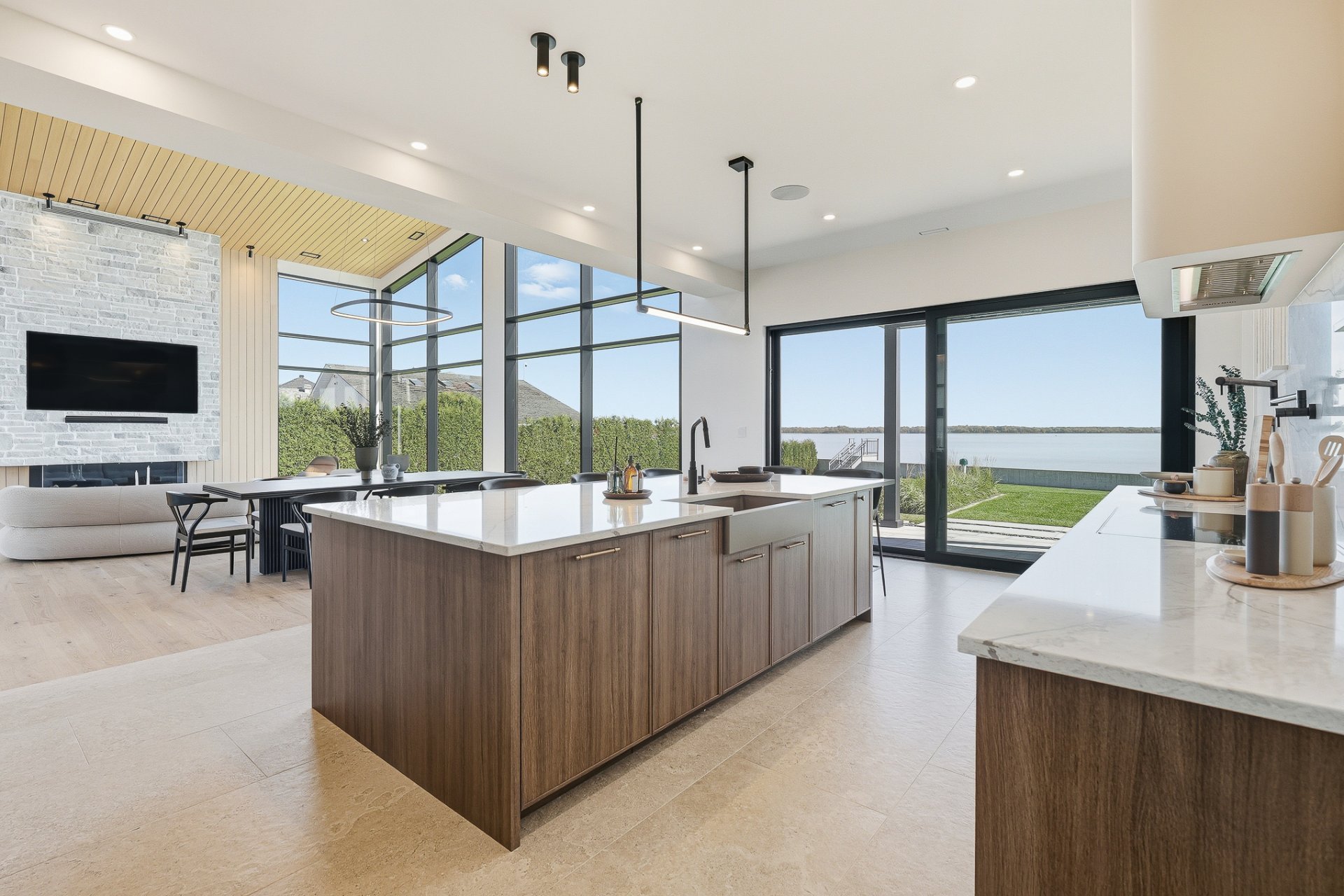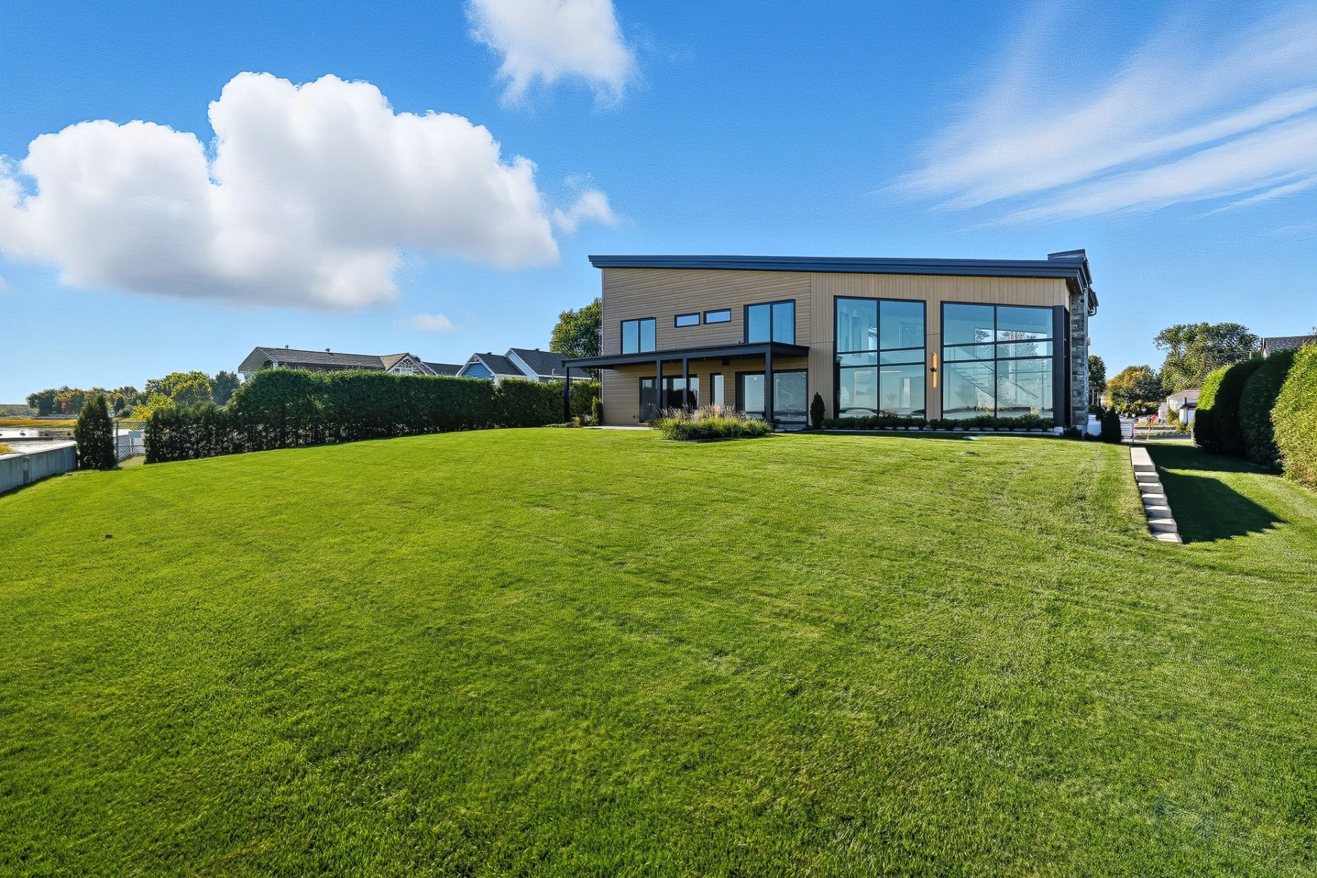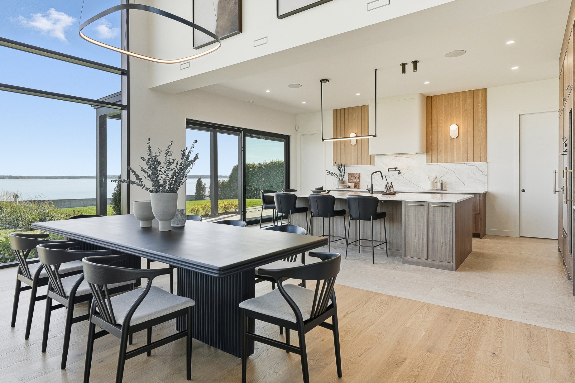Elegance. Refinement. Waterfront. This brand-new contemporary residence delivers luxury living on the shores of Lake of Two Mountains. Over 5,400 sq.ft. of refined space: a quadruple ceramic-finished garage, two private terraces, and full-height windows framing breathtaking water views. A gourmet kitchen with built-in appliances, wine cellar, prep kitchen, and pot-filler faucet. Striking 22-ft cathedral living room with gas fireplace. Landscaped grounds, direct lake access and option for a private dock. Second civic address suitable for a private office or an independent living space.