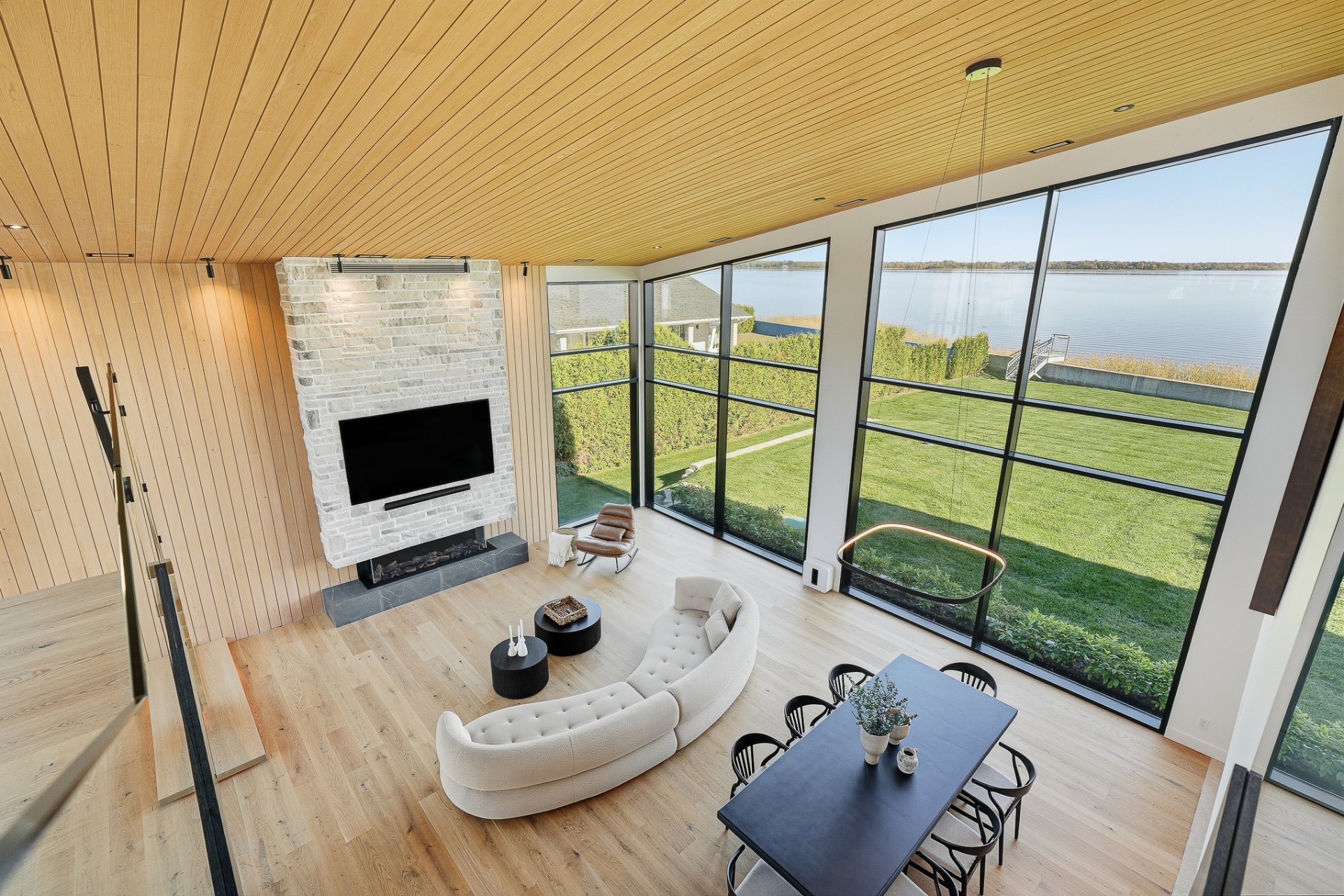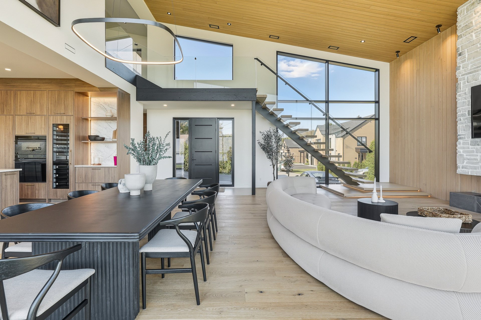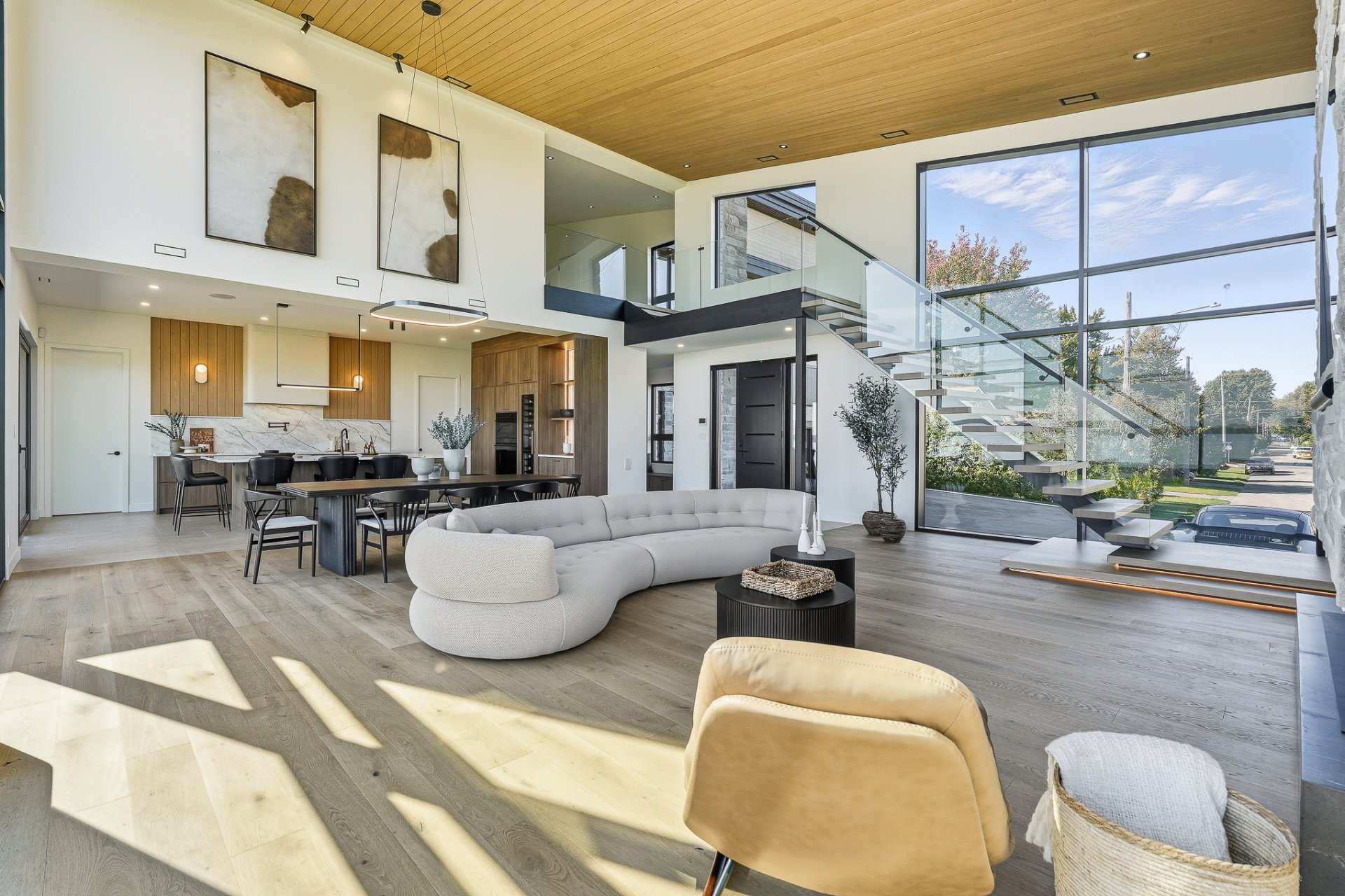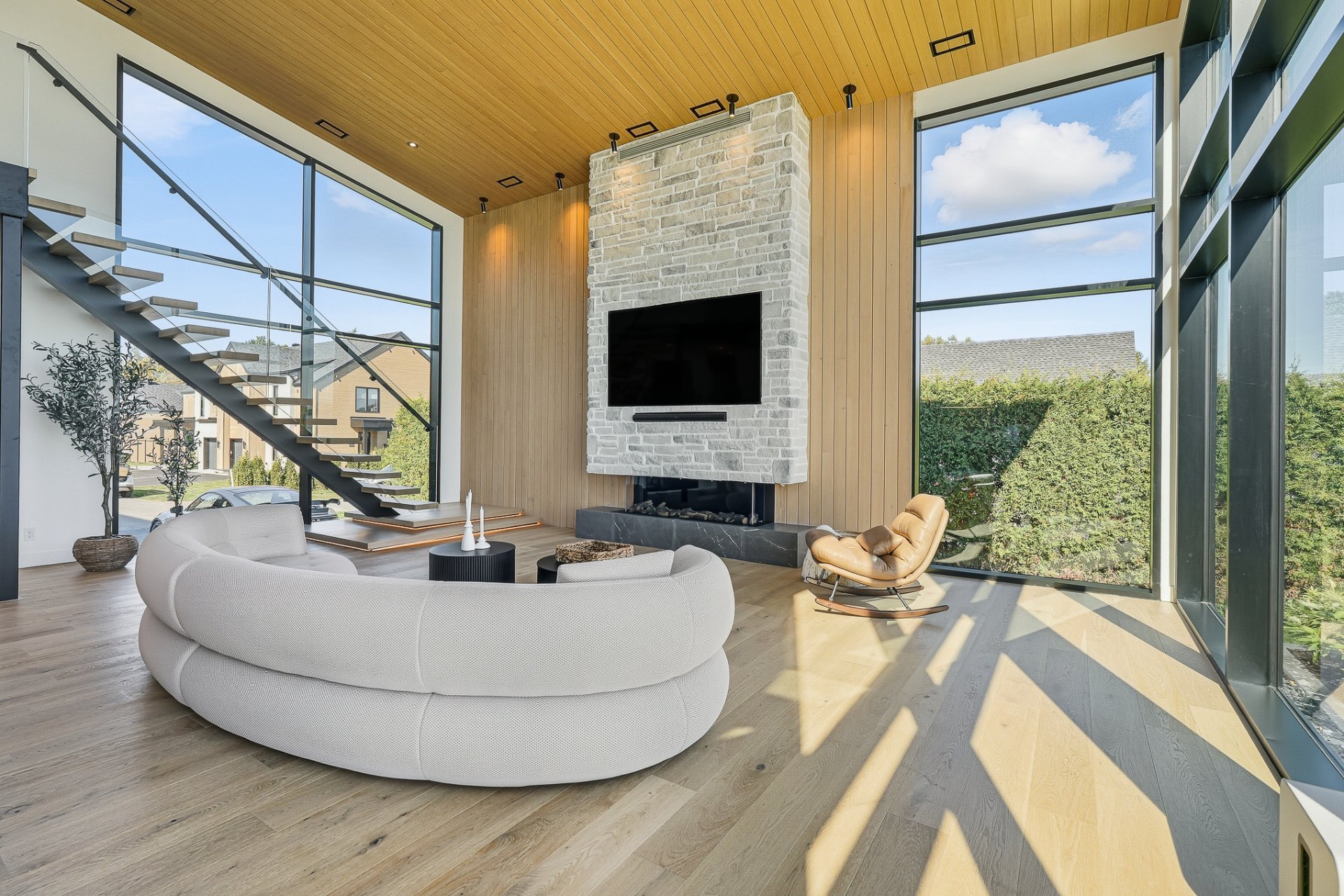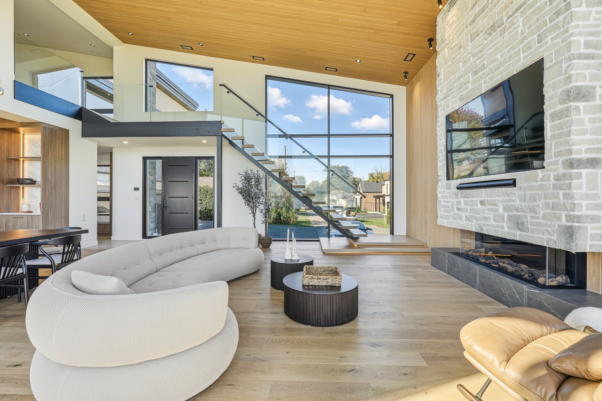 The 22-ft cathedral living room, framed by a gas fireplace and a spectacular glass wall, embodies contemporary grandeur.