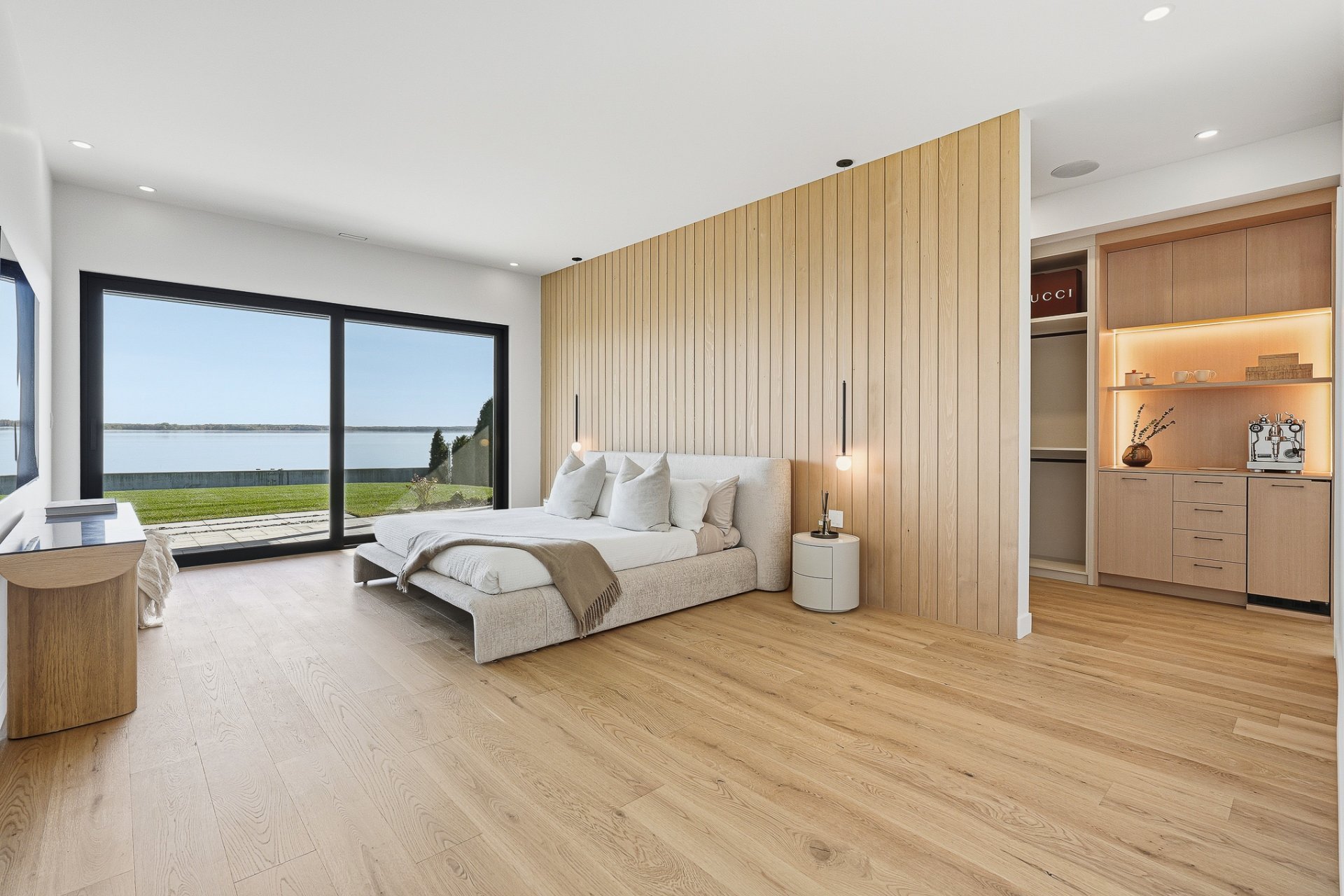 The primary suite, worthy of a Four Seasons retreat, features a custom walk-in closet, a luxurious ensuite bathroom, and a private coffee nook--the perfect spot to start your morning with lake views.