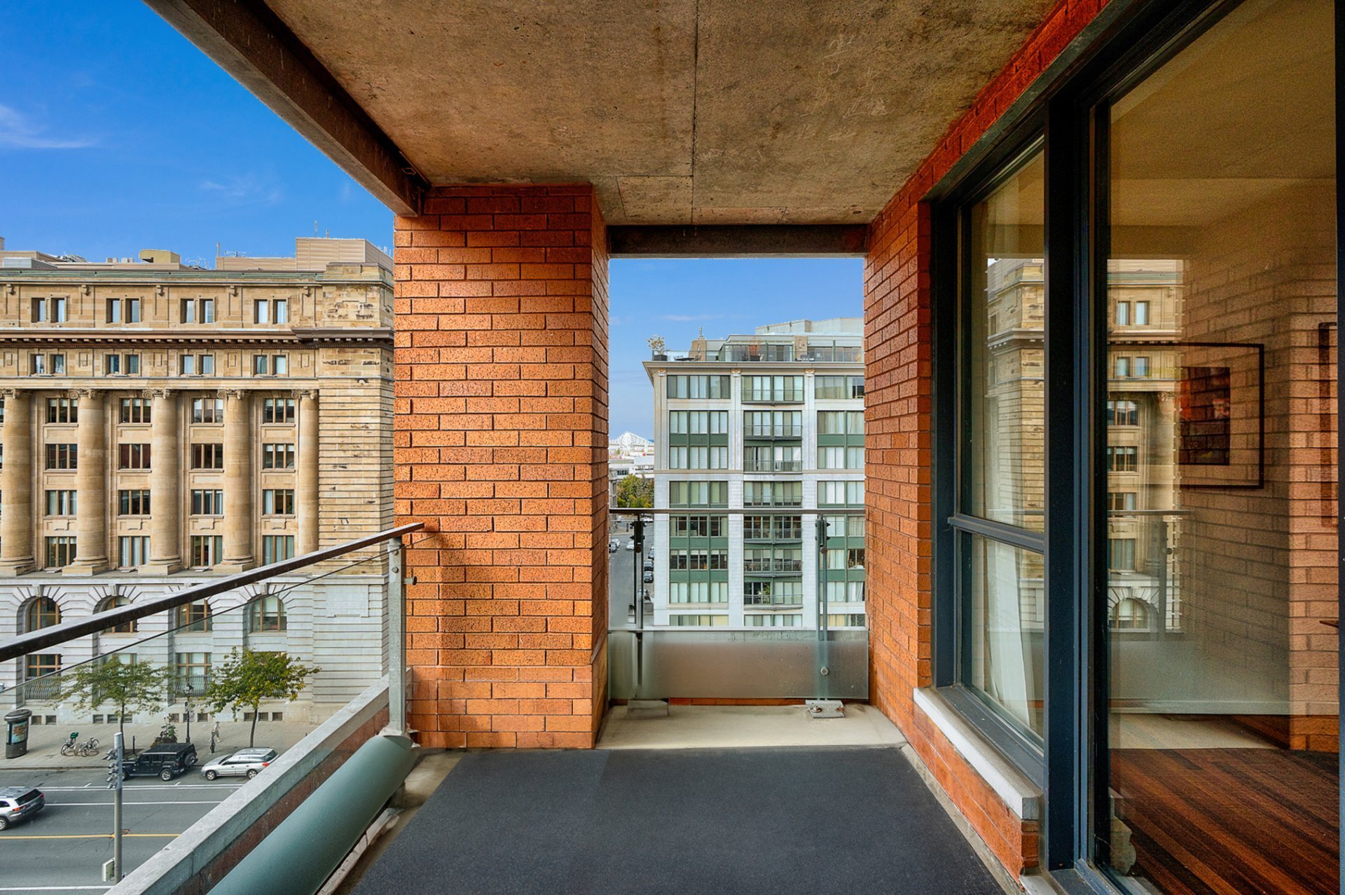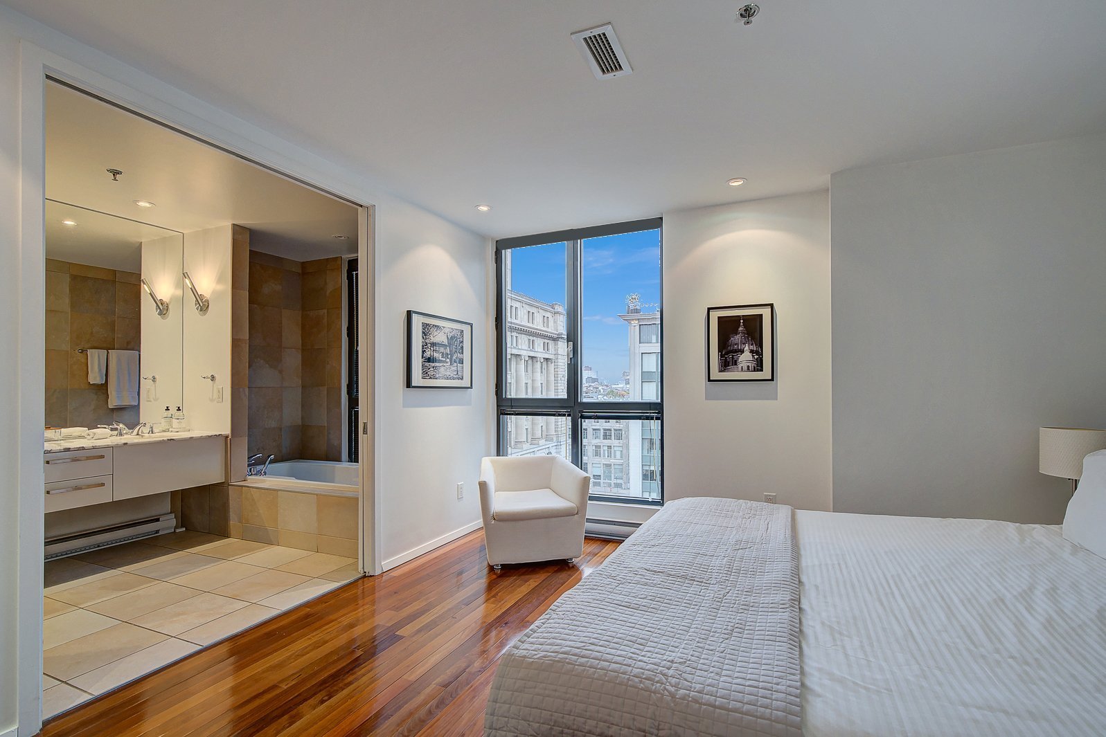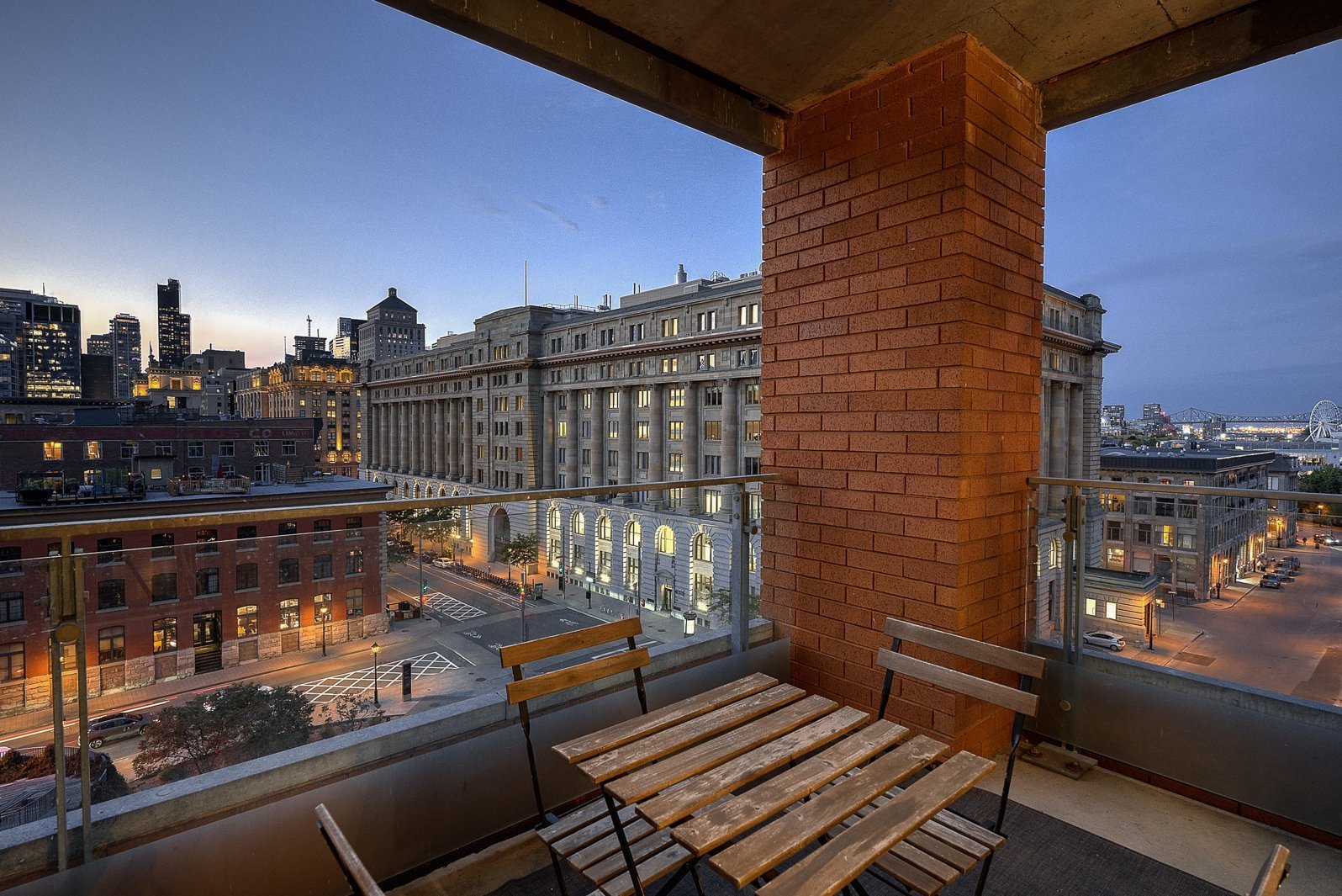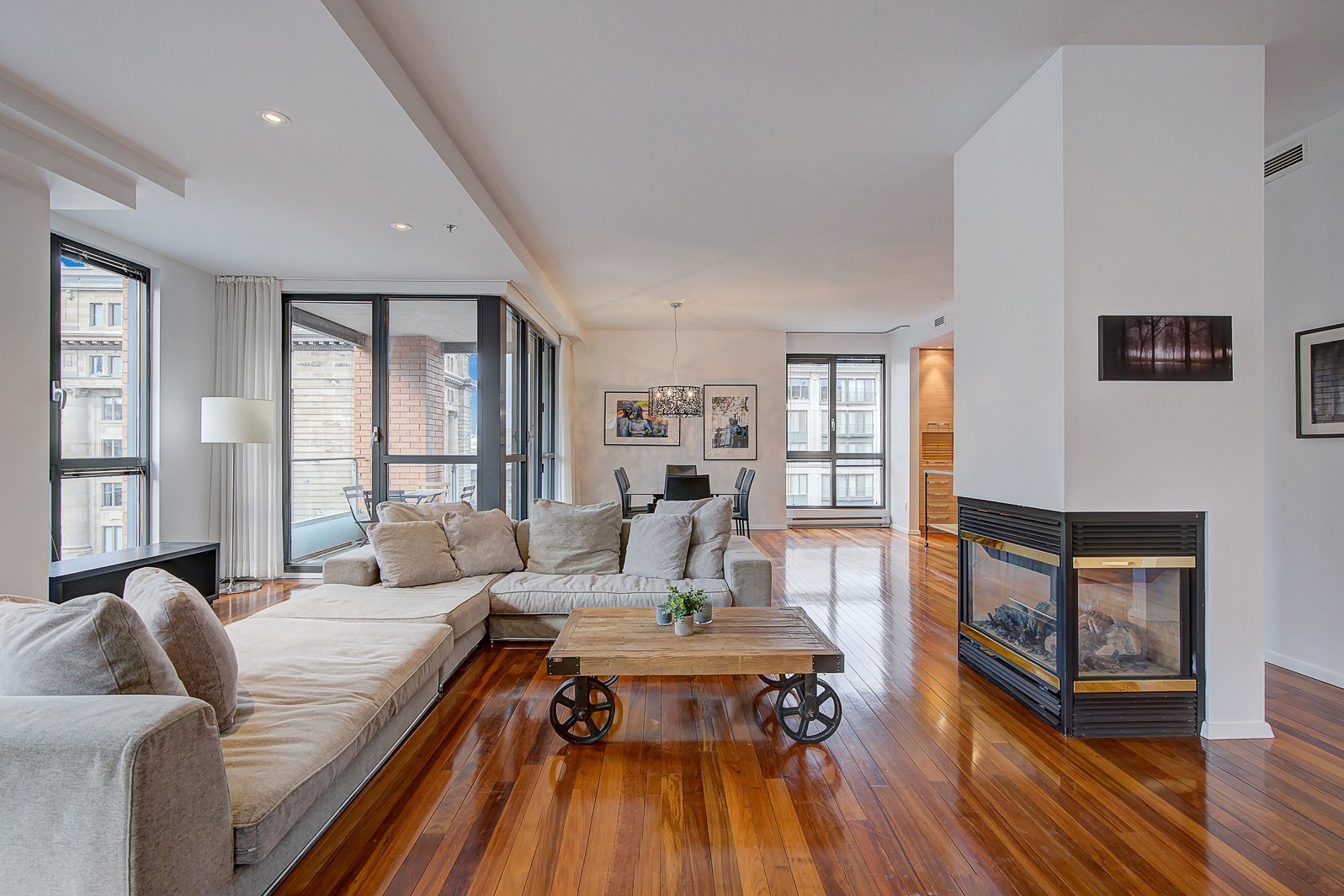 Discover a rare opportunity in the heart of vibrant Old Montreal with this stunning 3-bedroom condo. Boasting breathtaking, unobstructed downtown views from the open-concept living, dining, den, and kitchen areas, this home is perfect for entertaining. Two private terraces and exposure on three sides create a welcoming, house-like ambiance. The highly sought-after cross-hall layout ensures seamless flow, while the principal bedroom features a luxurious ensuite. Complete with two garages, this property offers exceptional living in a prime location. Simply outstanding real estate.