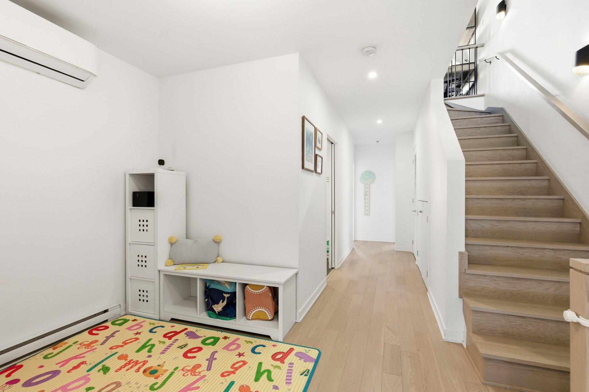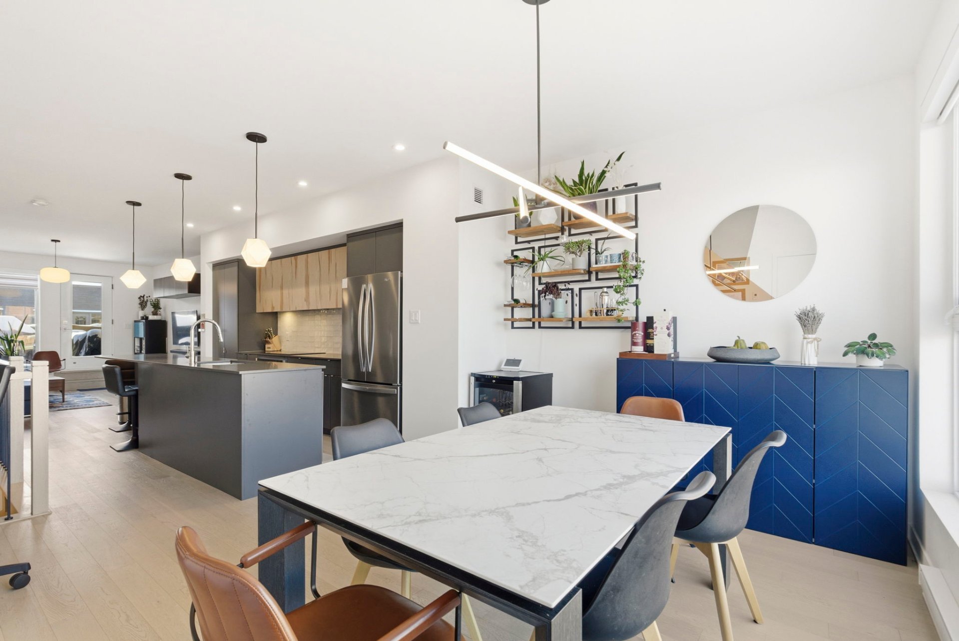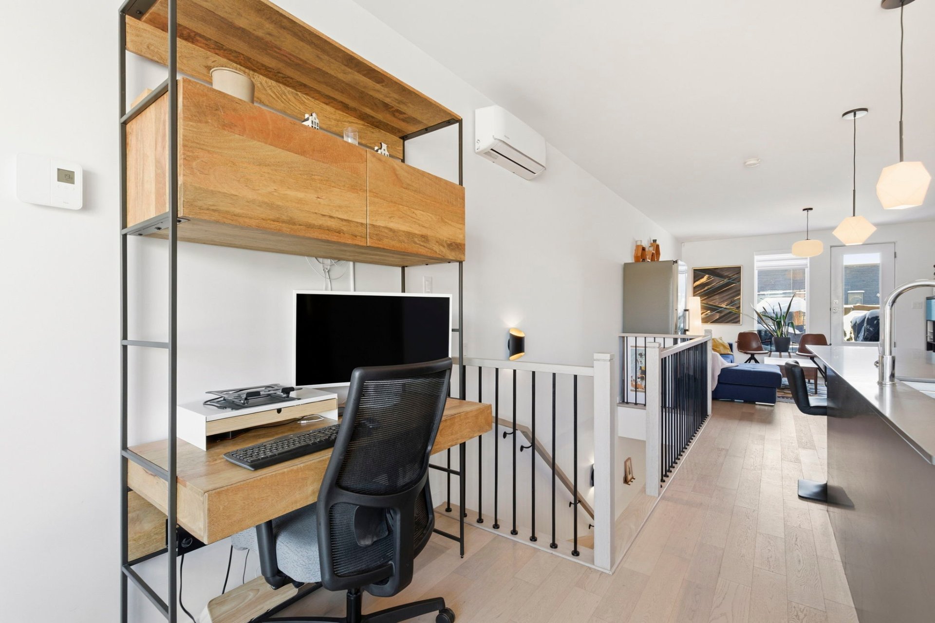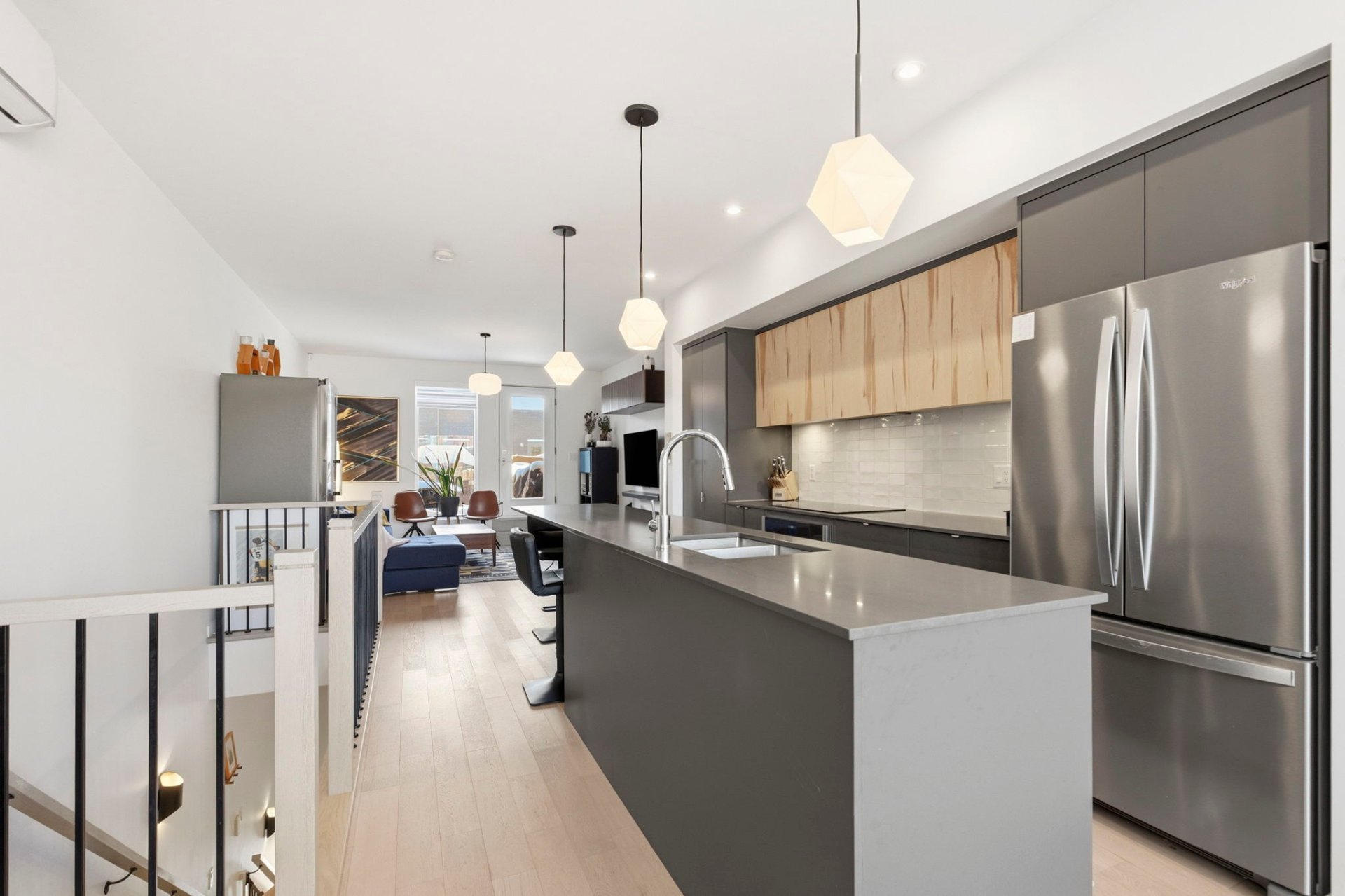 Stunning two-level apartment, built in 2022 in the TAK Village real estate project, in the heart of the vibrant Shop Angus district. Spanning nearly 1200 sq ft, it features three bedrooms, one with a walk-in closet, and a dedicated workspace. The main floor, located on the third level, boasts a light-filled living area with approximately 9-foot ceilings. The living room, dining room, and kitchen flow seamlessly together in a contemporary and functional layout. A charming terrace extends the living space, and a garage and storage space are included. Immediate occupancy is possible!