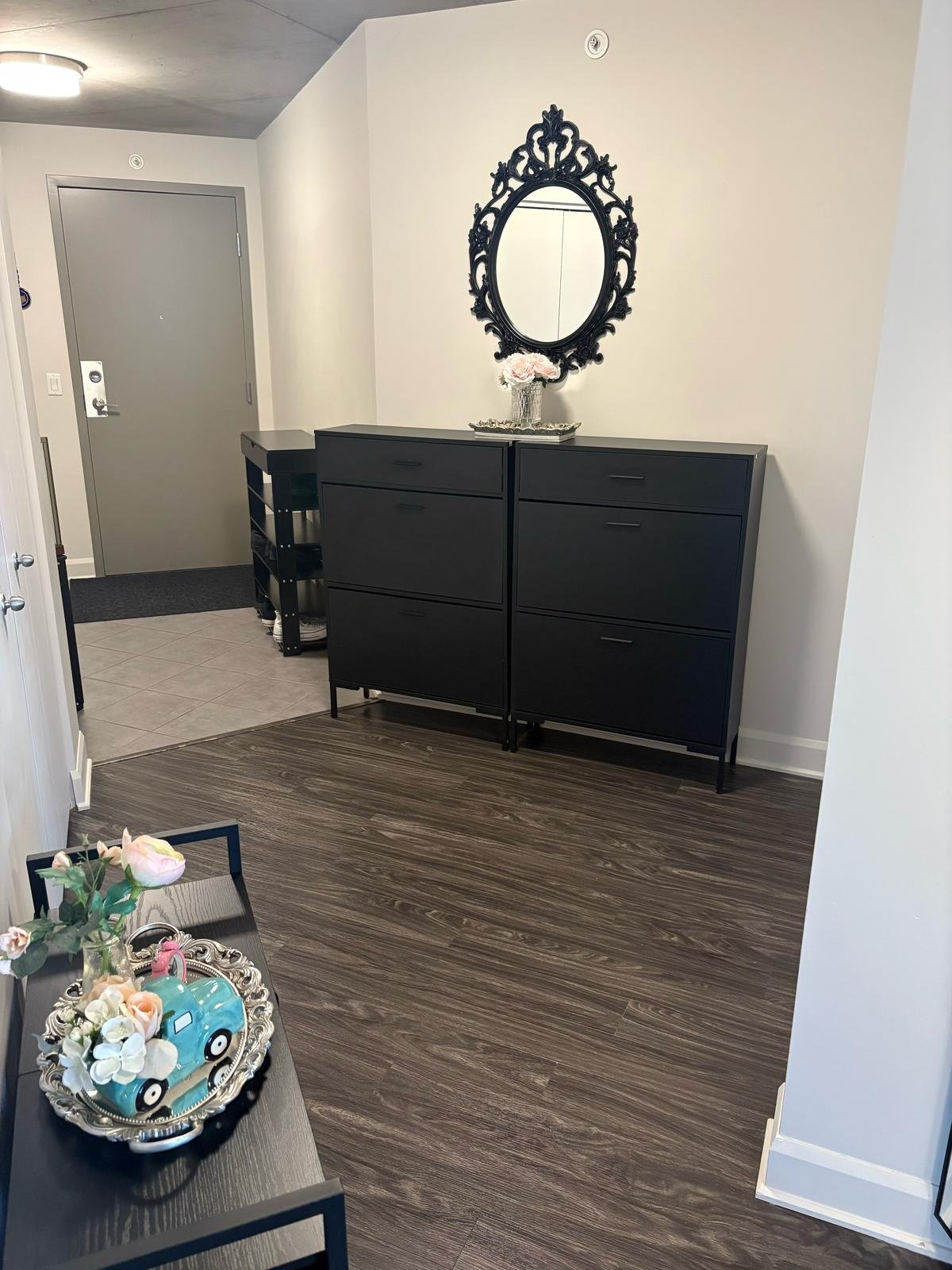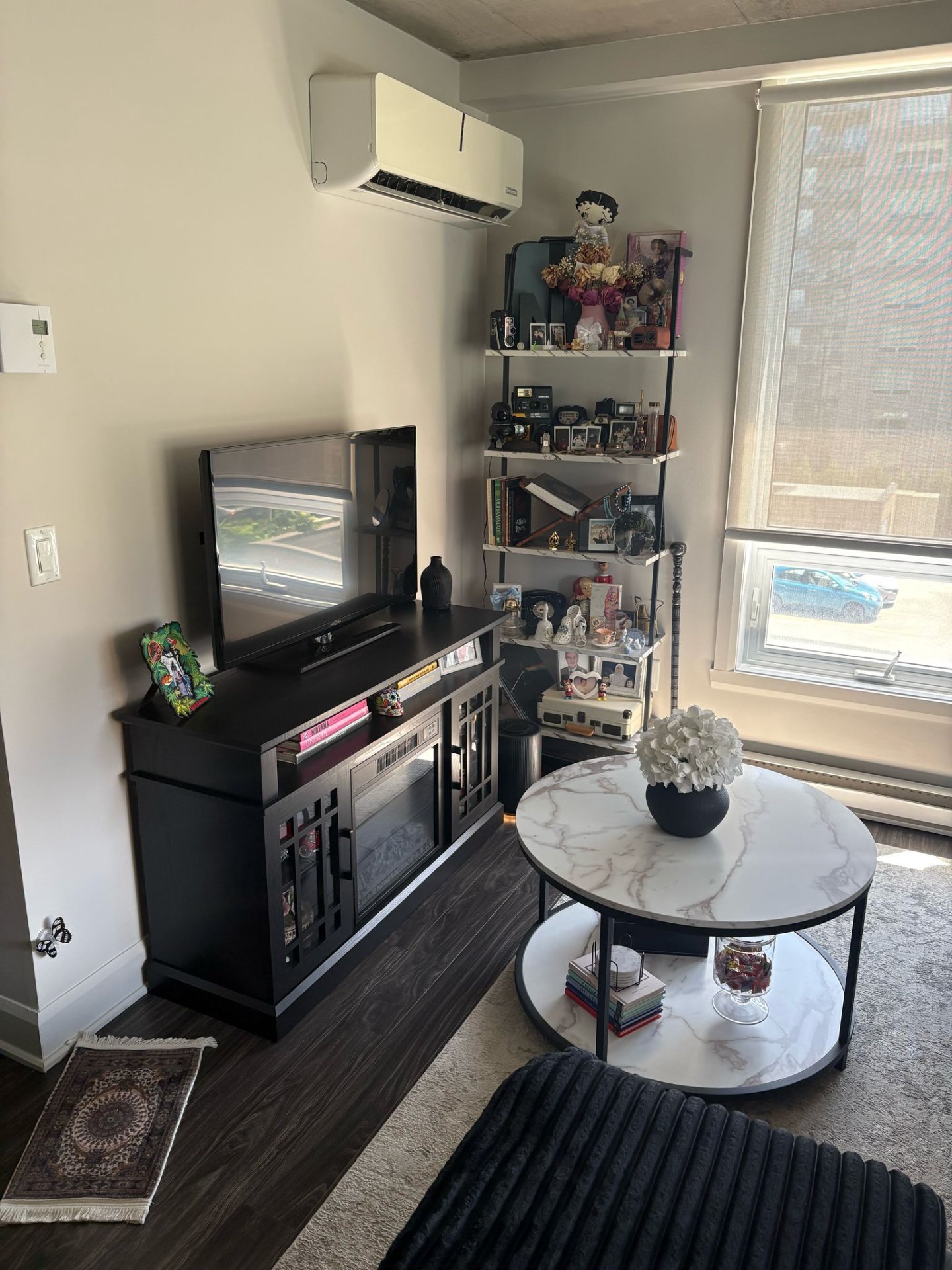 Modern, well-maintained, and secure building offering a peaceful and comfortable living environment. This 3rd-floor unit enjoys abundant natural light through large windows and features a spacious private balcony, perfect for relaxing or entertaining. Curtains are included for added comfort and privacy. Elevator access, secure entry system, and easy parking for residents and visitors.