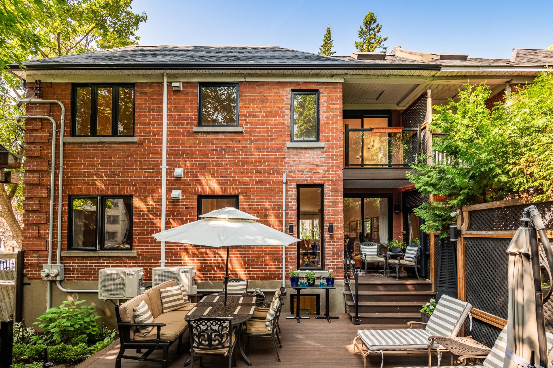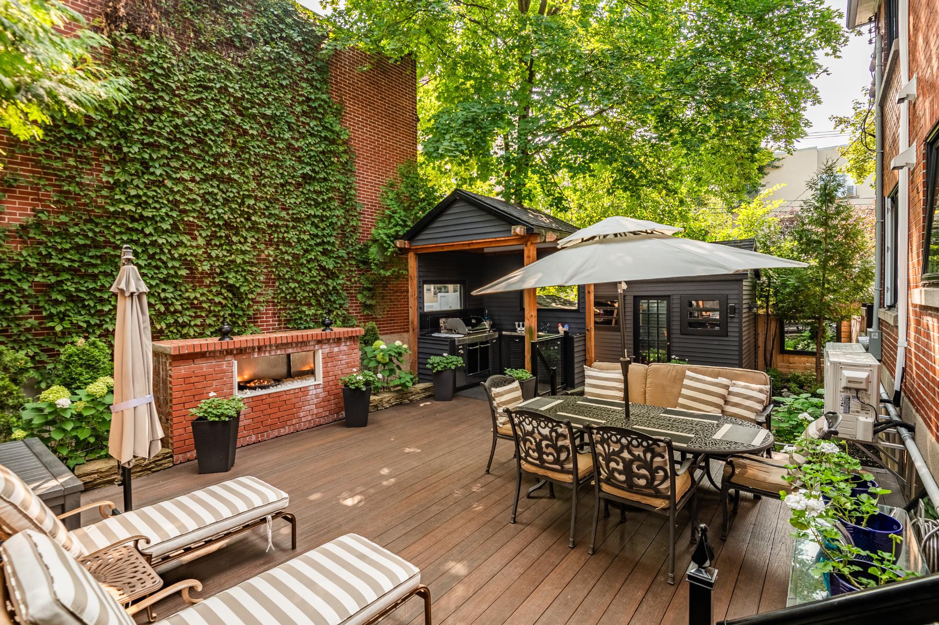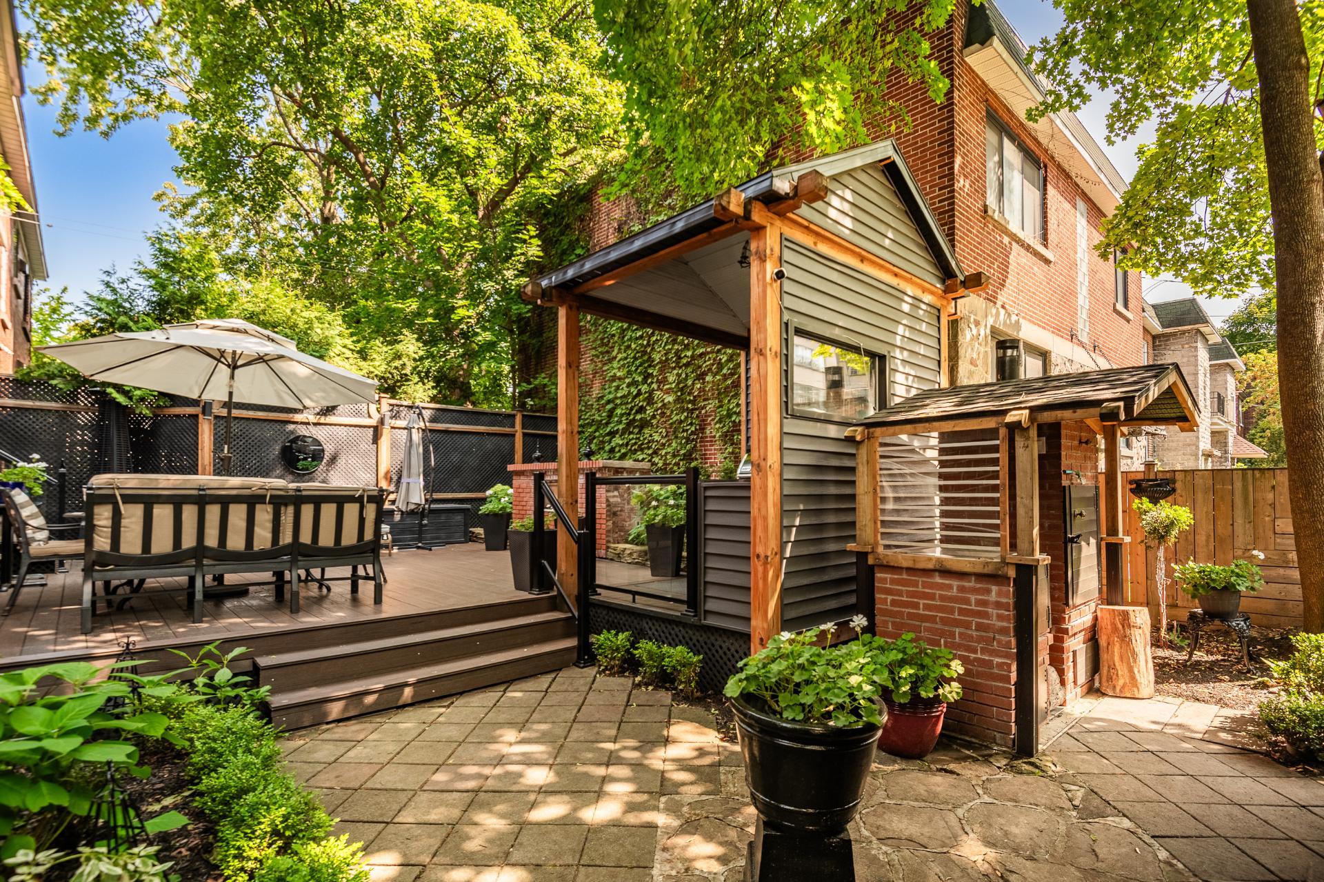 Prestigious building available for double occupancy offering a 2-storey main dwelling with 3 bedrooms, 3 refined bathrooms, ethanol fireplace, 7' basement, double garage and 2 outdoor parking spaces. Beautifully landscaped backyard with dining area, outdoor kitchen and relaxation area. Upstairs offers a magnificent 5 ½ with 2 bathrooms, large open area with electric fireplace, laundry room and 2 private balconies. Composite balconies/terraces, heat pumps in each unit. Sought-after area near Snowdon metro, private schools and parks.