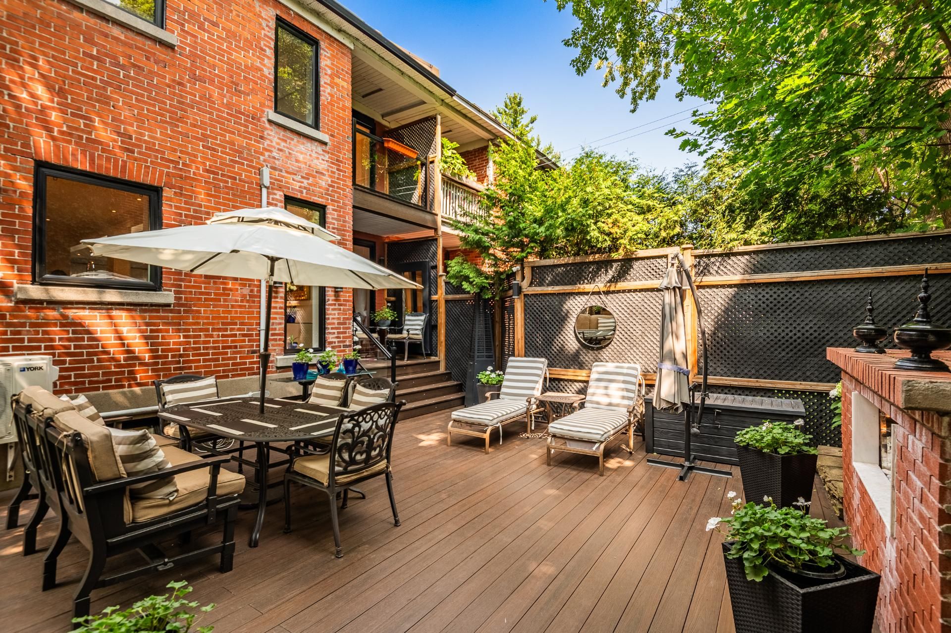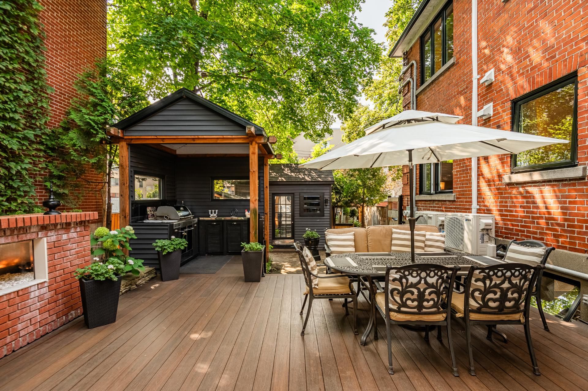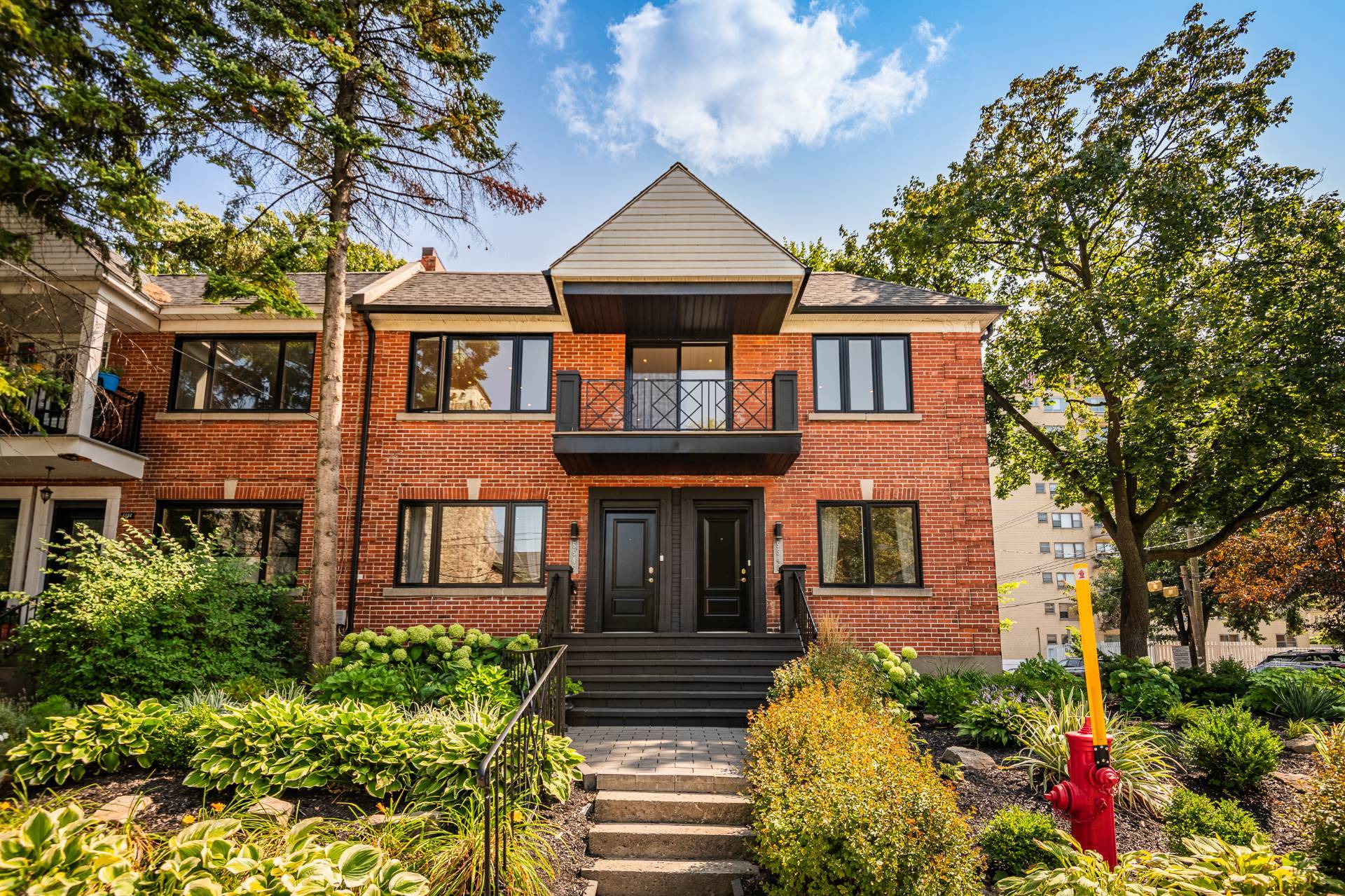 Prestigious building available for double occupancy offering a 2-storey main dwelling with 3 bedrooms, 3 refined bathrooms, ethanol fireplace, 7' basement, double garage and 2 outdoor parking spaces. Beautifully landscaped backyard with dining area, outdoor kitchen and relaxation area. Upstairs offers a magnificent 5 ½ with 2 bathrooms, large open area with electric fireplace, laundry room and 2 private balconies. Composite balconies/terraces, heat pumps in each unit. Sought-after area near Snowdon metro, private schools and parks.