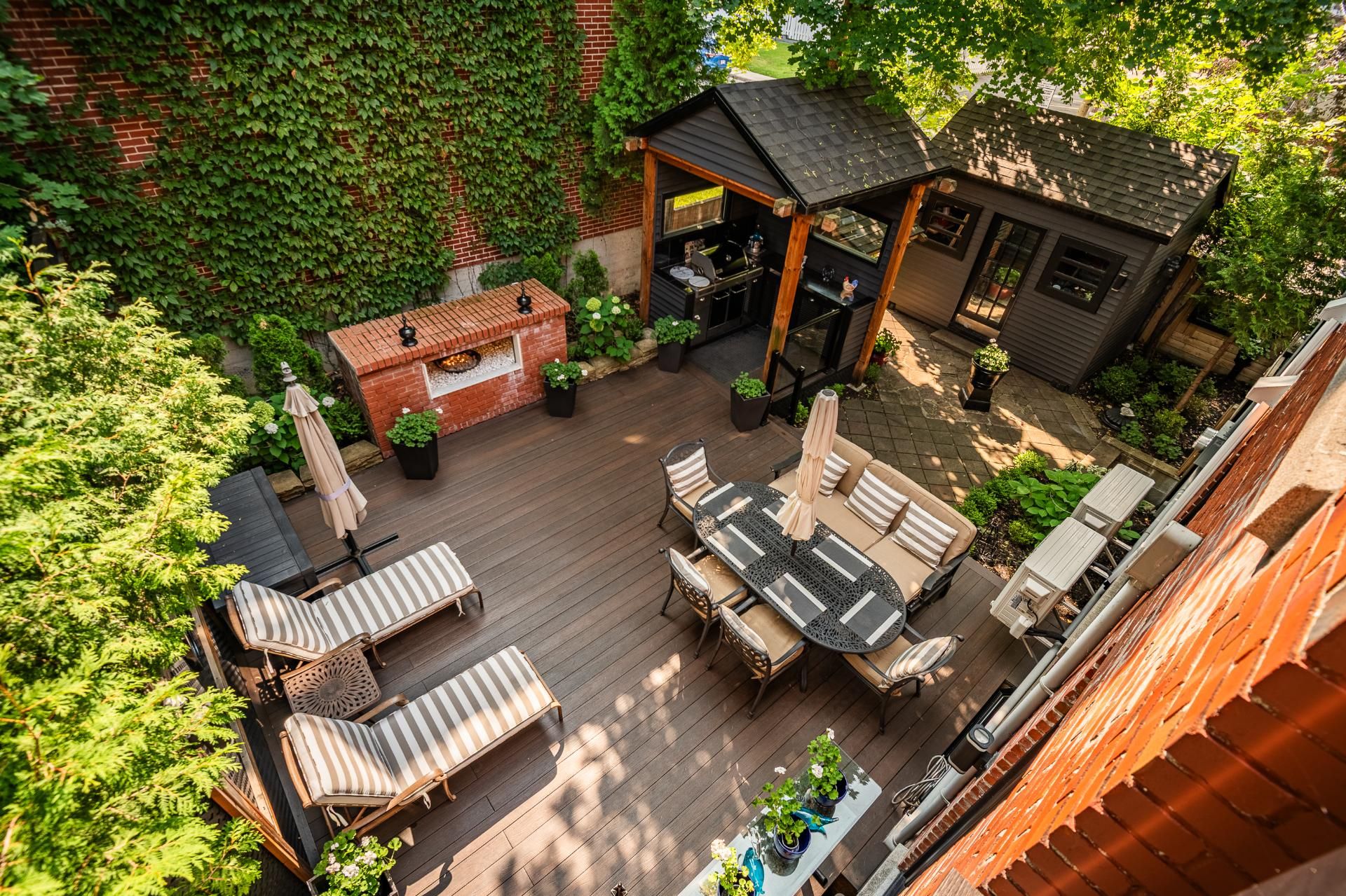 Landscaped backyard with outdoor kitchen, perfect for entertaining