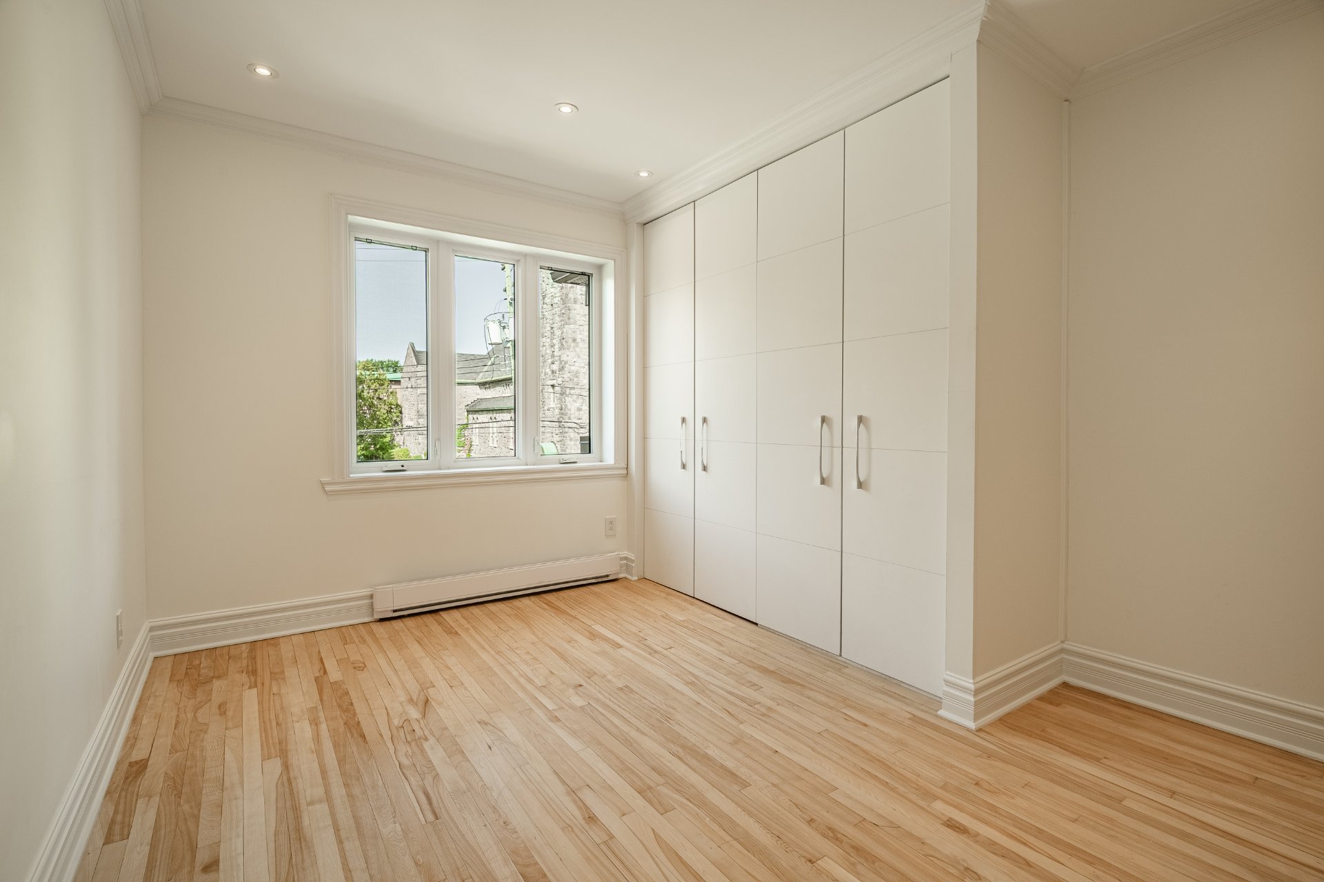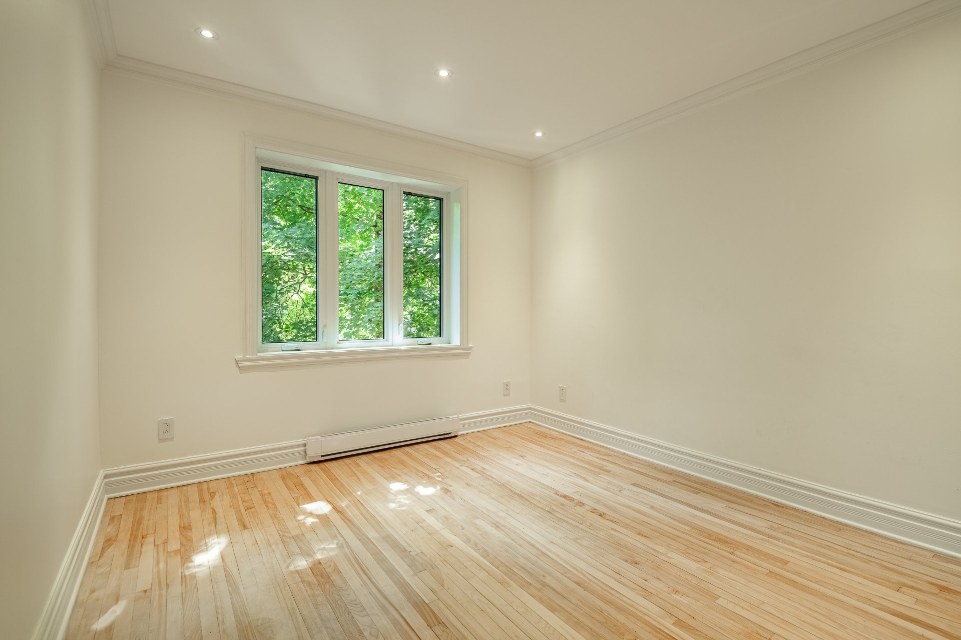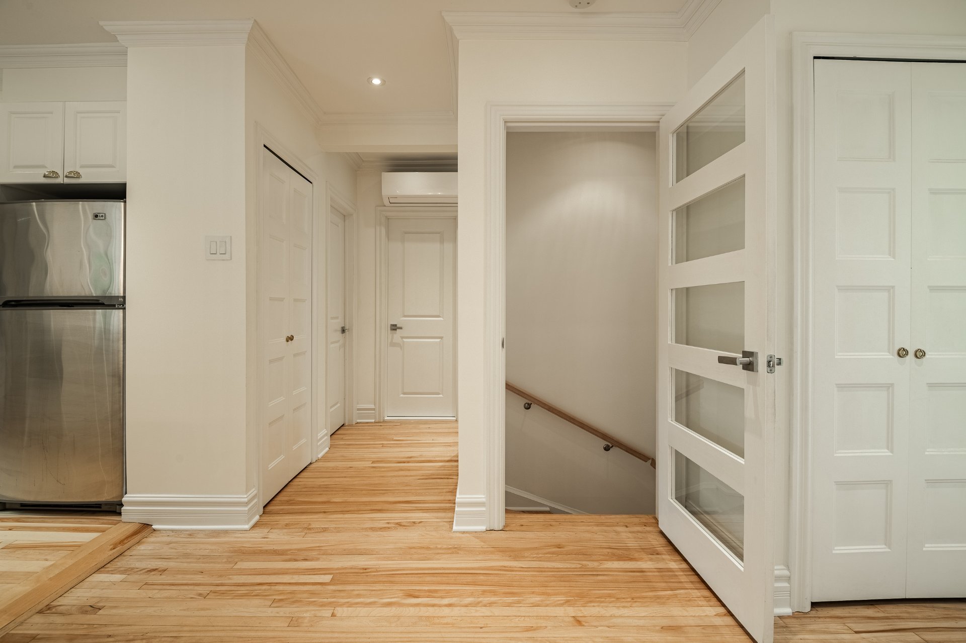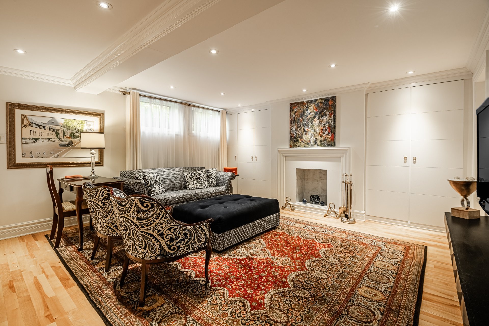 Warm, 7-foot-high basement with wood flooring and elegant finishes