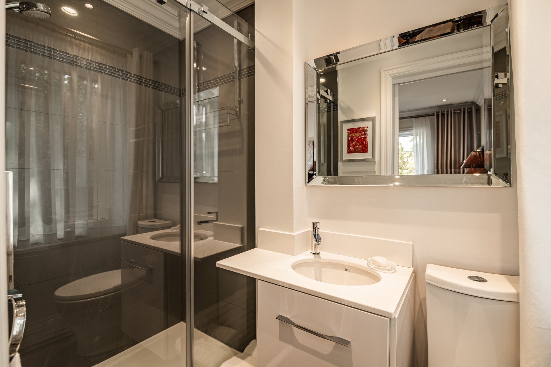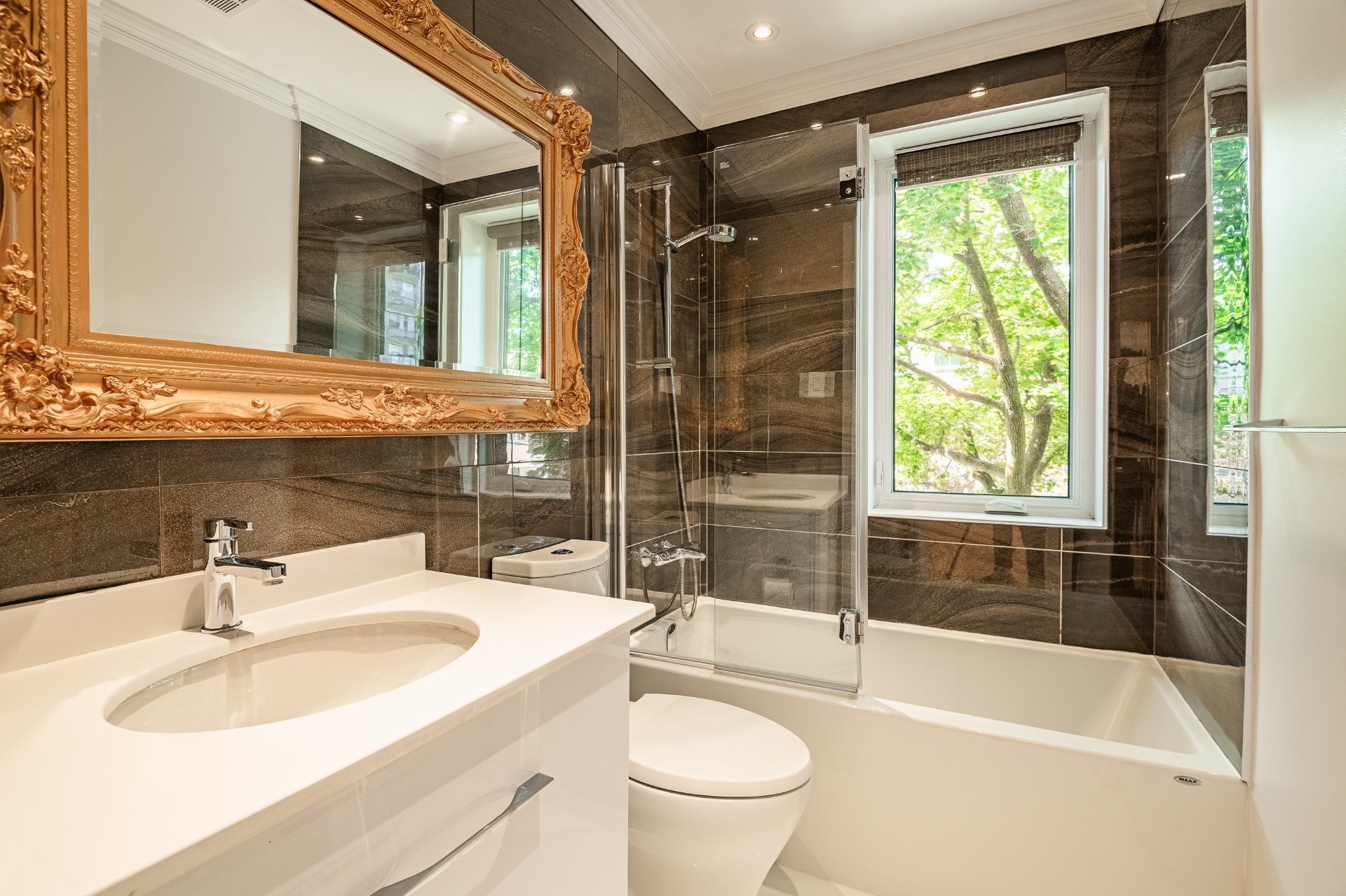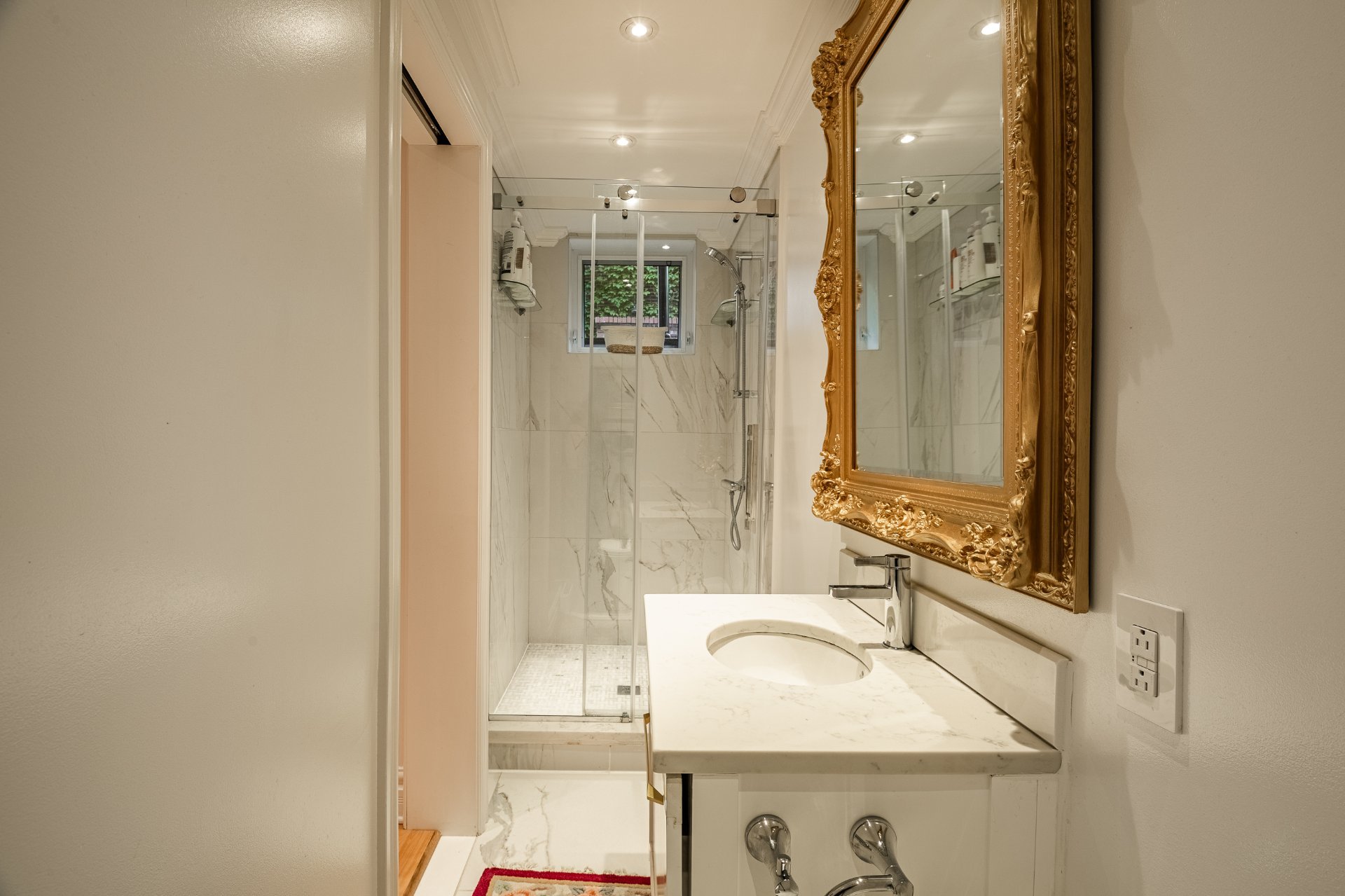 Three elegantly designed bathrooms, including a basement bathroom with marble-effect ceramic tiles