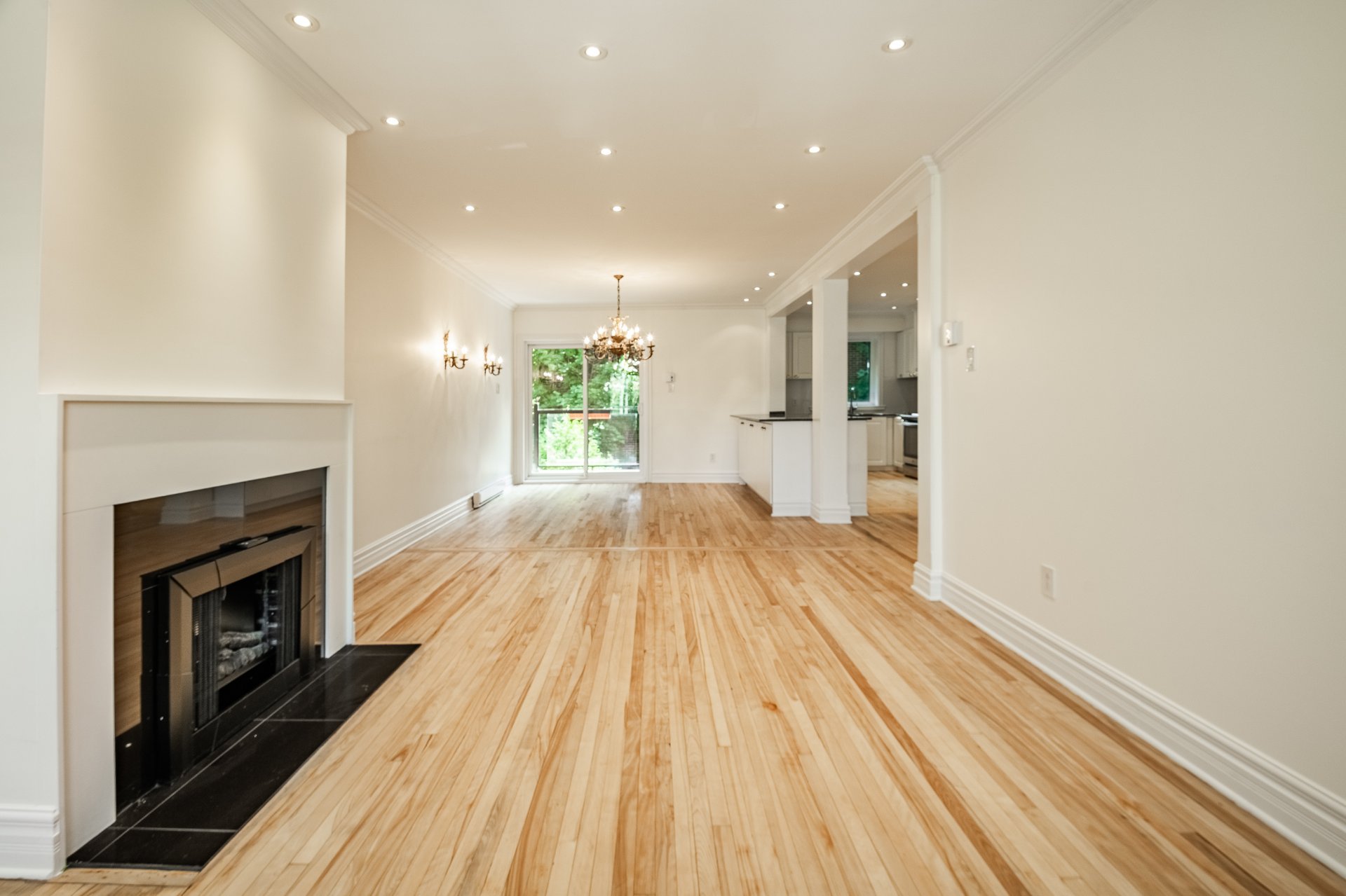 Large open-plan living area with modern kitchen, dining room and living room with electric fireplace