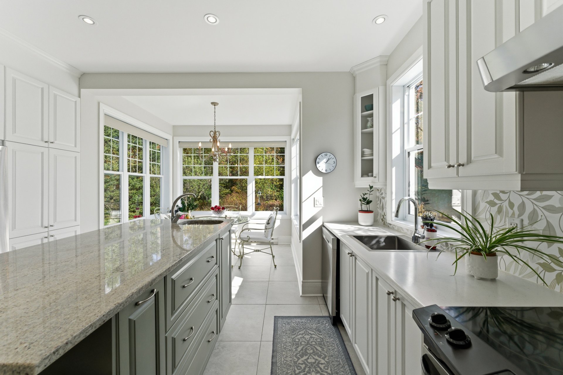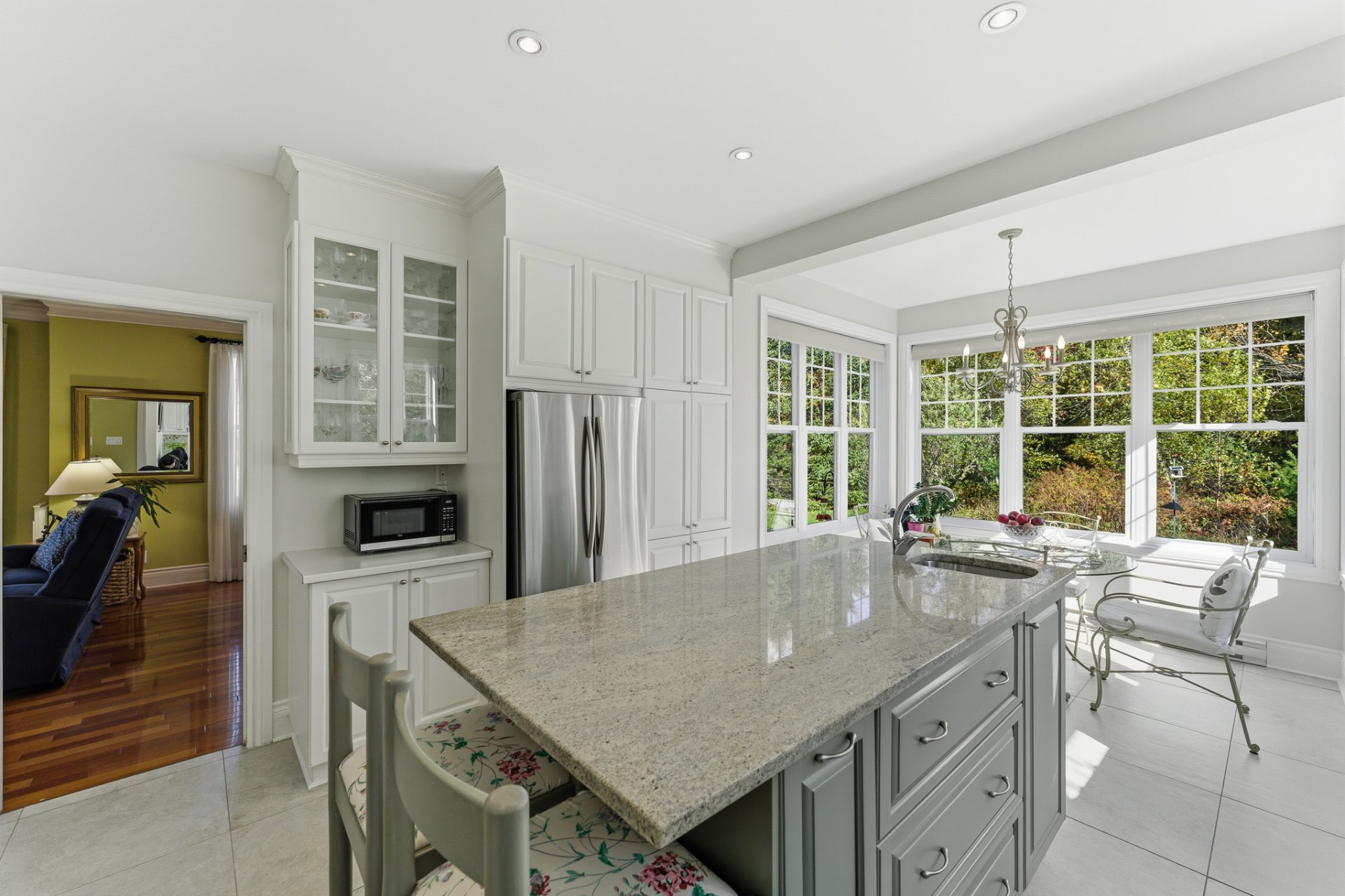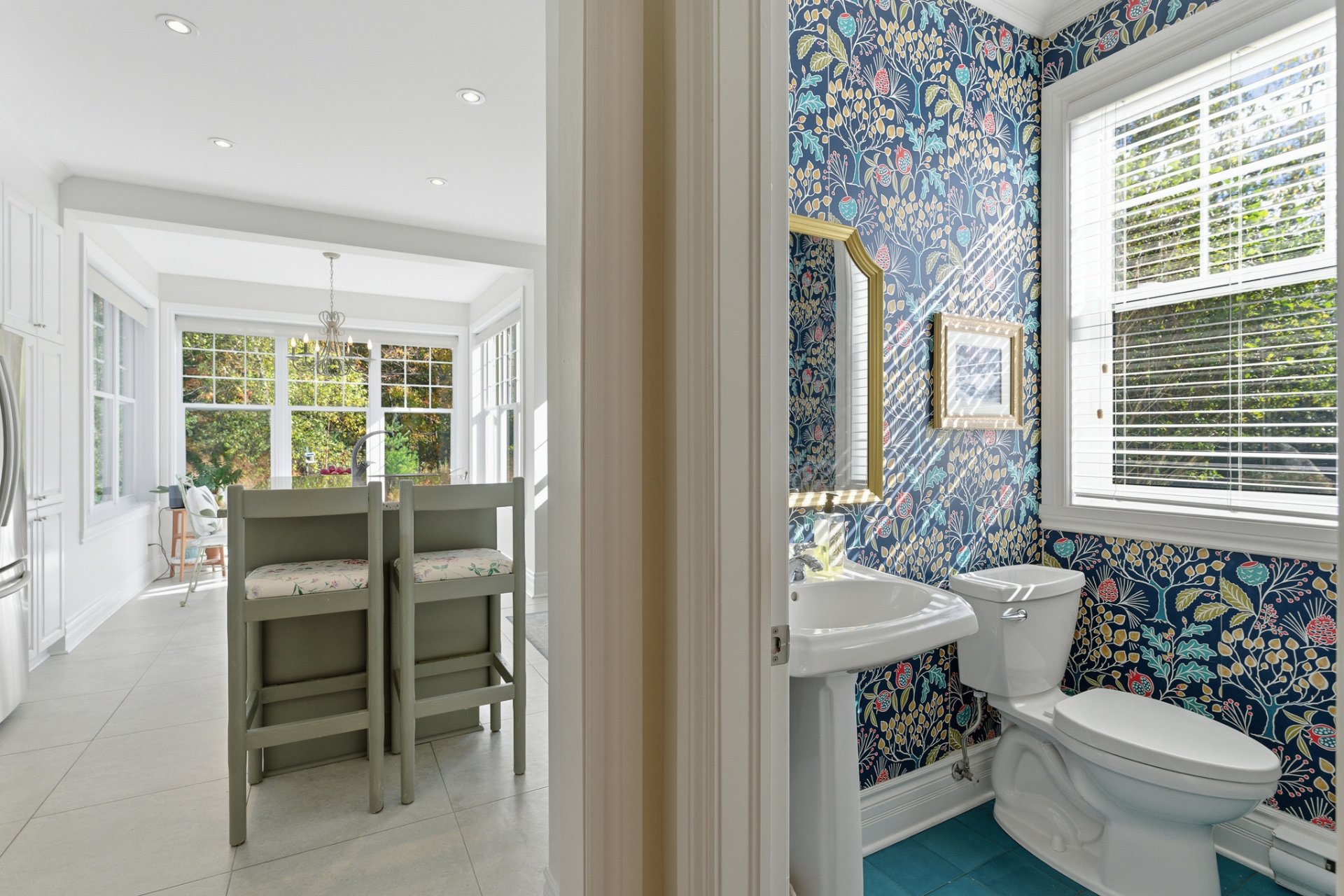 Designed to blend beauty and functionality, the kitchen charms with its wooden cabinetry, spacious island with prep sink, and granite countertops. The breakfast nook, surrounded by windows on three sides, invites you to enjoy the view of nature. Nearby, a distinctive powder room adds a touch of personality to the space.