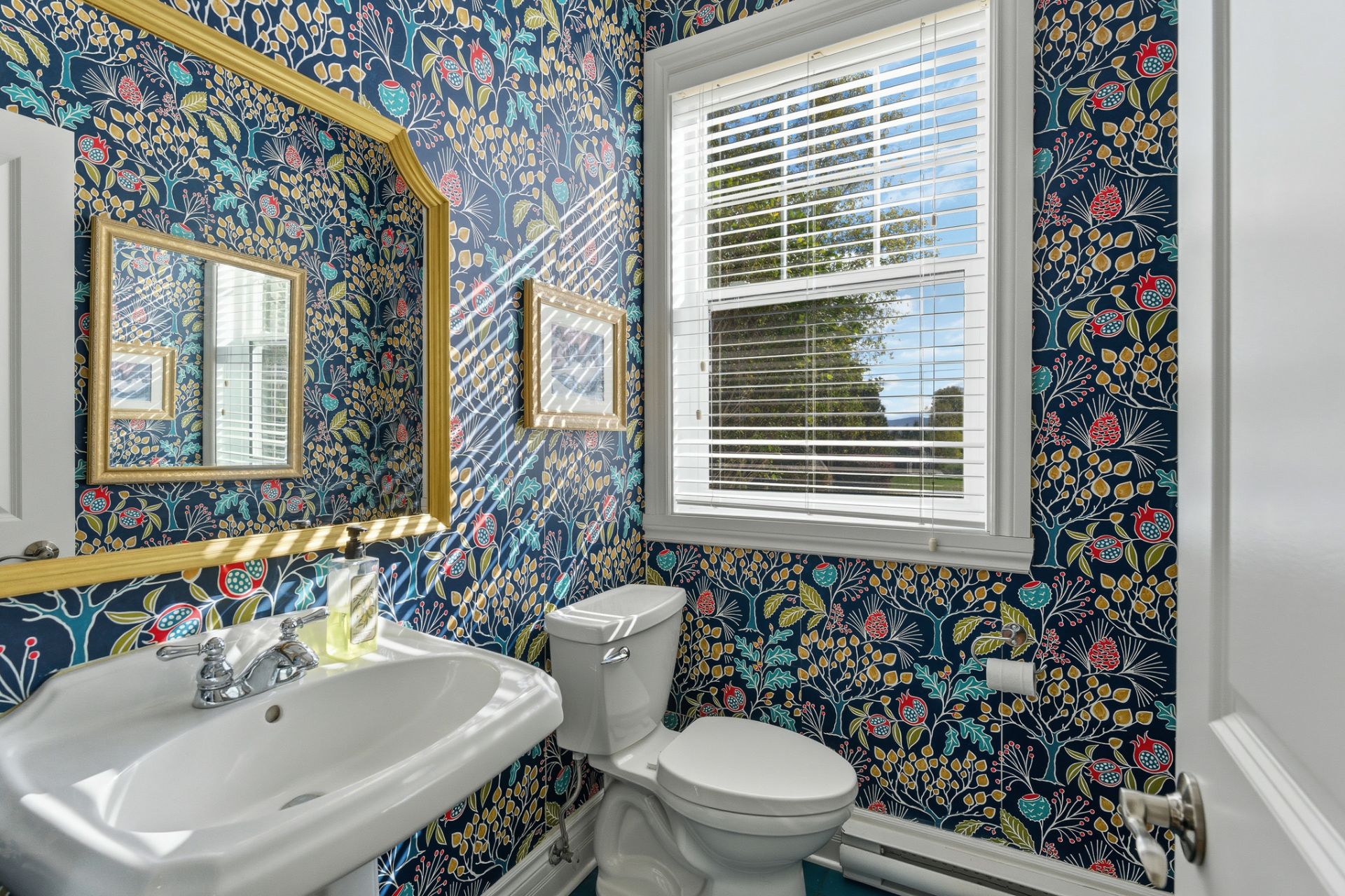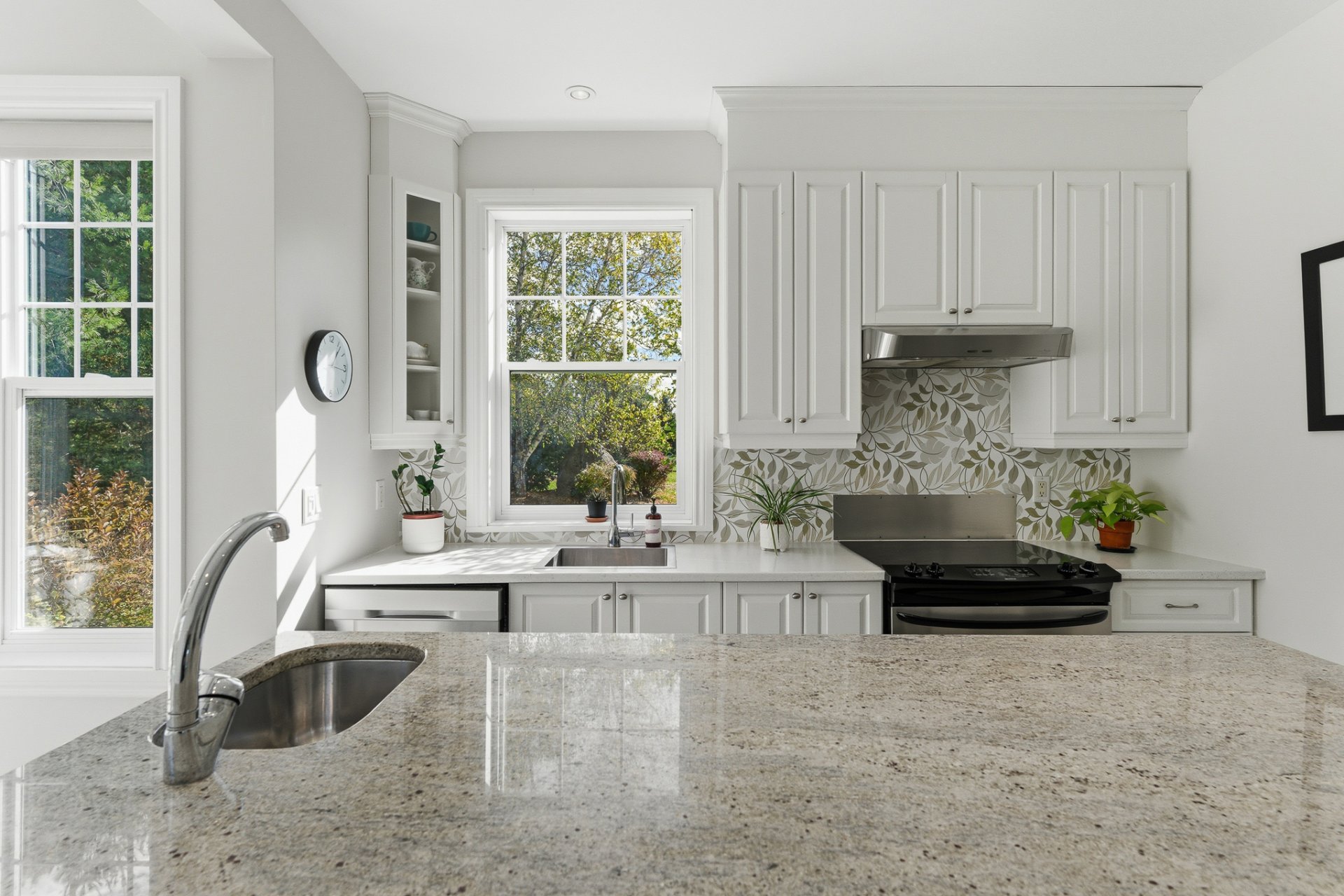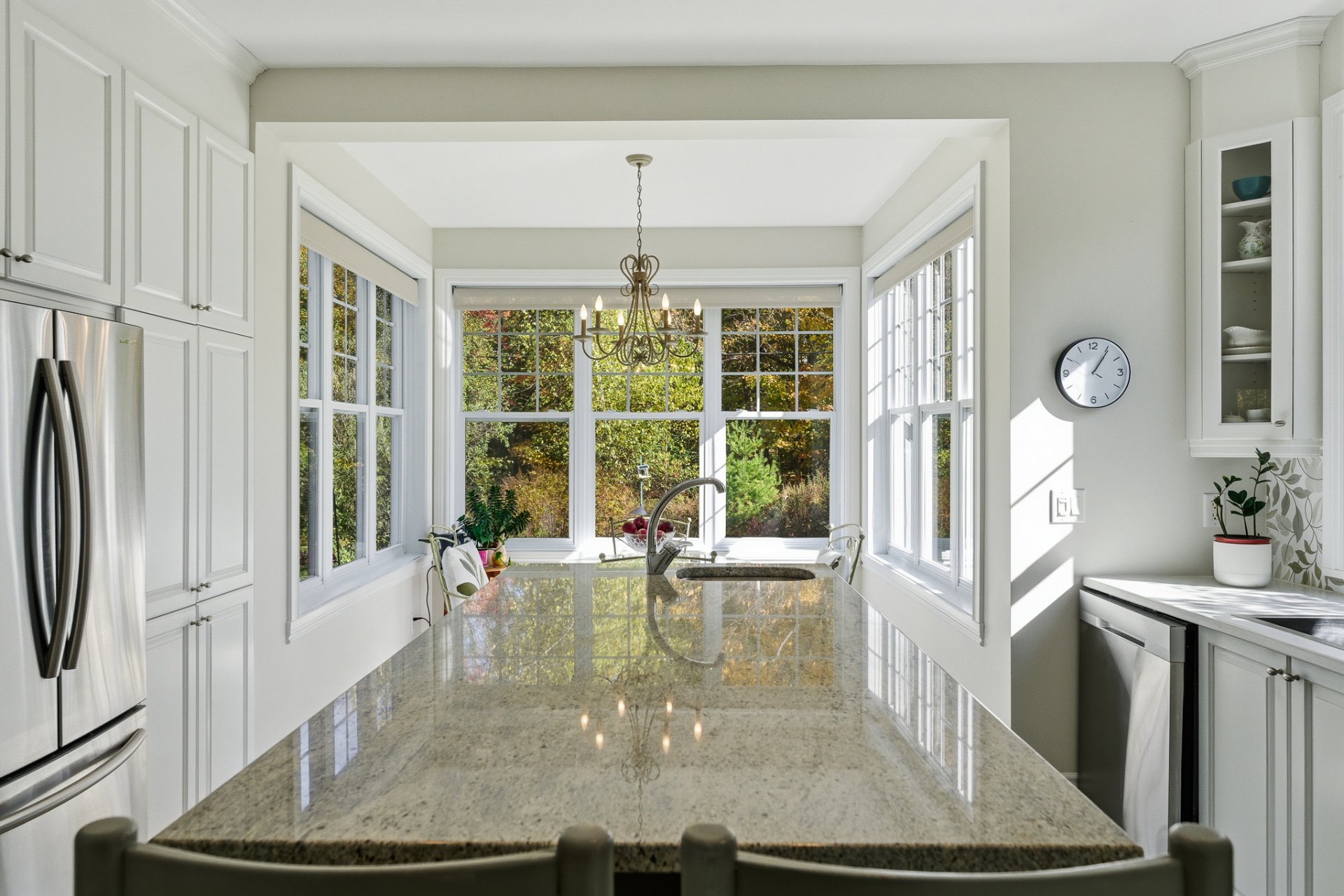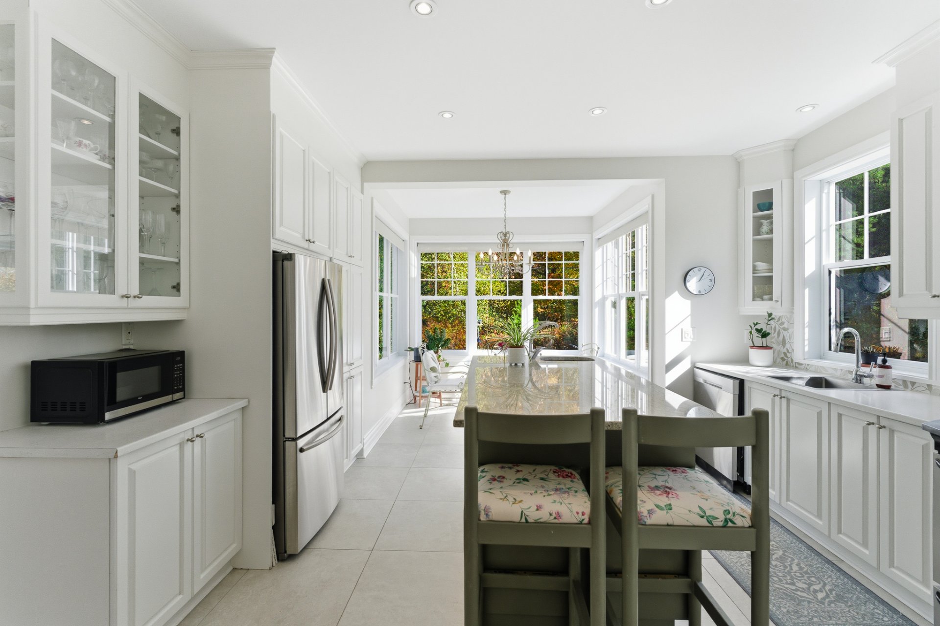 Designed to blend beauty and functionality, the kitchen charms with its wooden cabinetry, spacious island with prep sink, and granite countertops. The breakfast nook, surrounded by windows on three sides, invites you to enjoy the view of nature. Nearby, a distinctive powder room adds a touch of personality to the space.