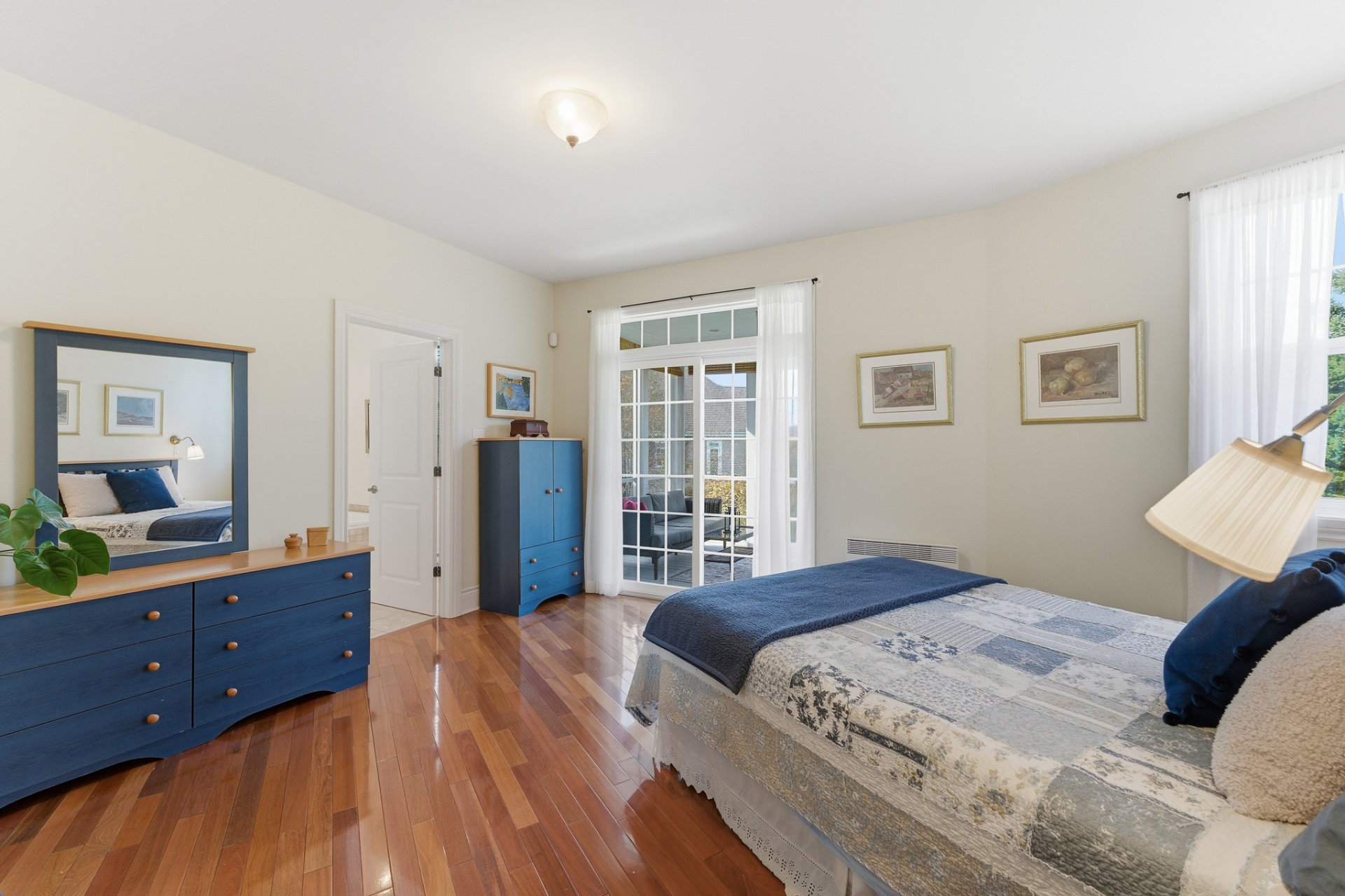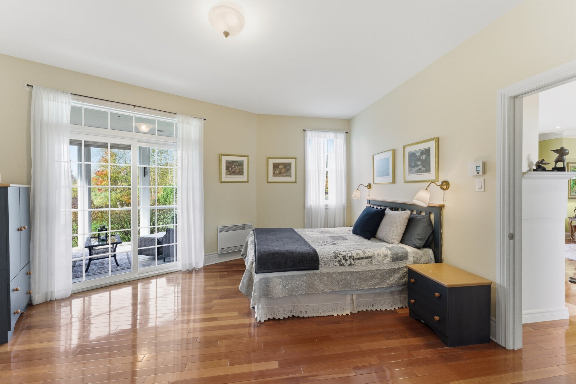 The main-floor suite features direct access to the screened three-season veranda, a walk-in closet, and an ensuite bathroom with a large soaking tub and glass shower.
