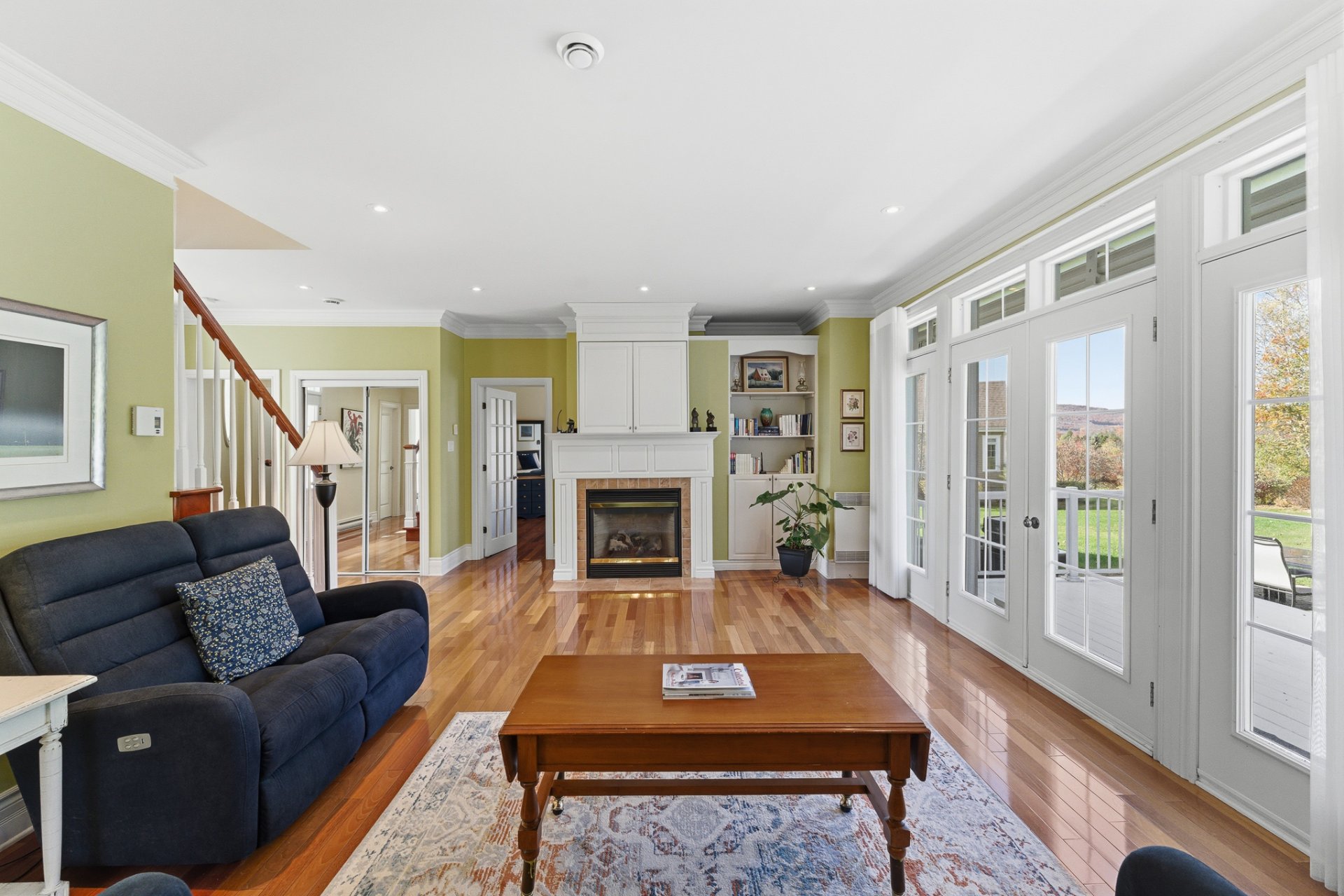 The living room, adjoining the dining area and bathed in natural light, opens onto the terrace through large French doors framed by side windows. Centered around a gas fireplace, it offers an inviting atmosphere for peaceful evenings.