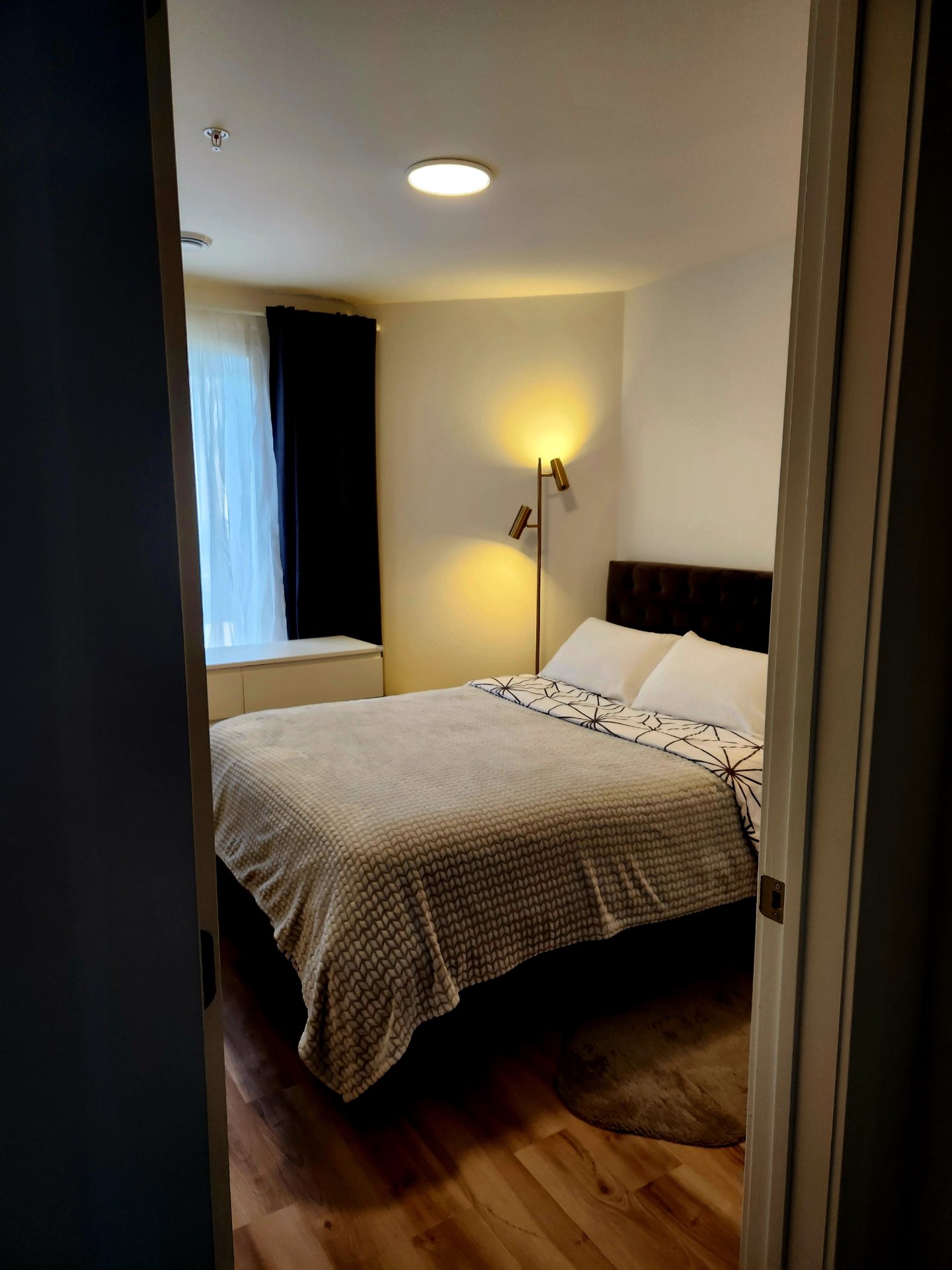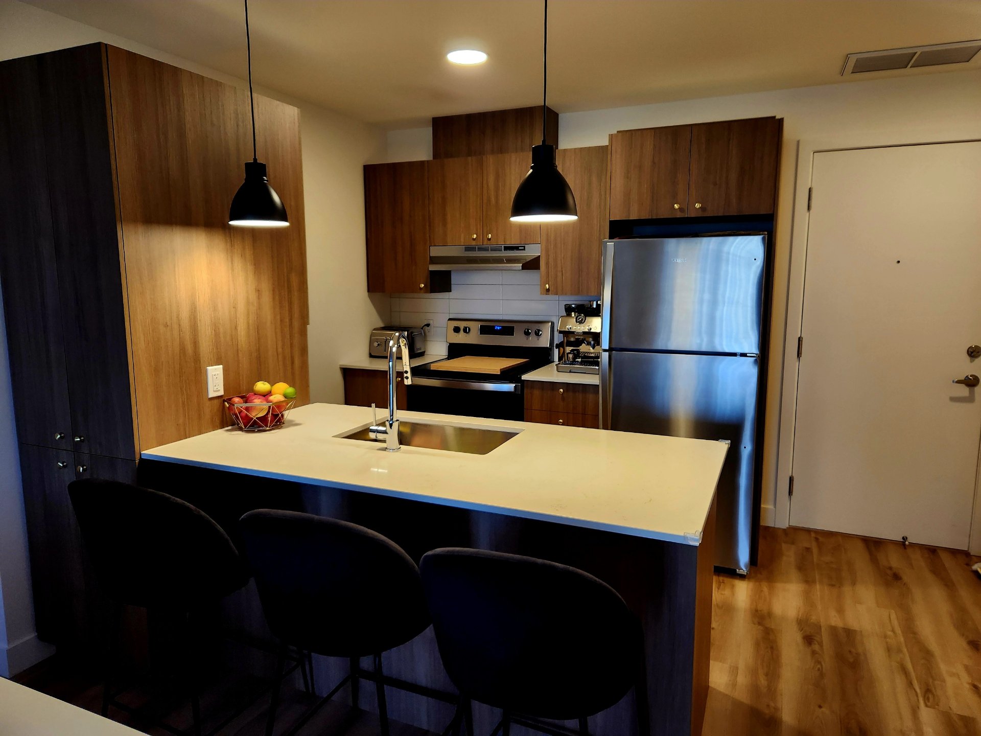 Lease transfer. Stunning 5th-floor condo with elevator, offering 2 bedrooms and a large office. All included: electricity, heating, hot water, cable, internet and 5 appliances. Outdoor pool, billiard room, coworking space, and two common rooms with kitchen and dining area available by reservation. Basement locker $65/month and same-level parking $100/month. Dogs and cats accepted with conditions.