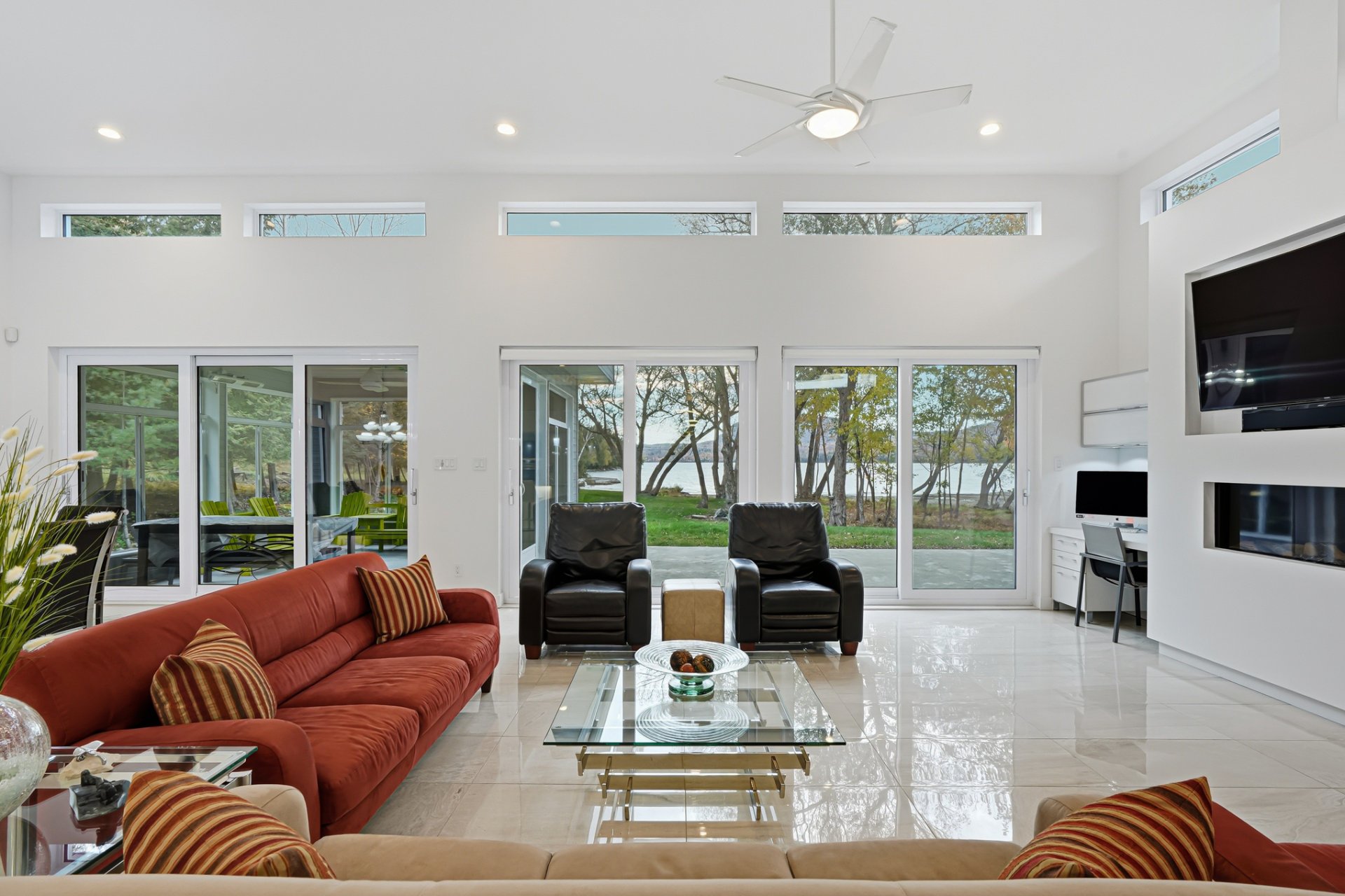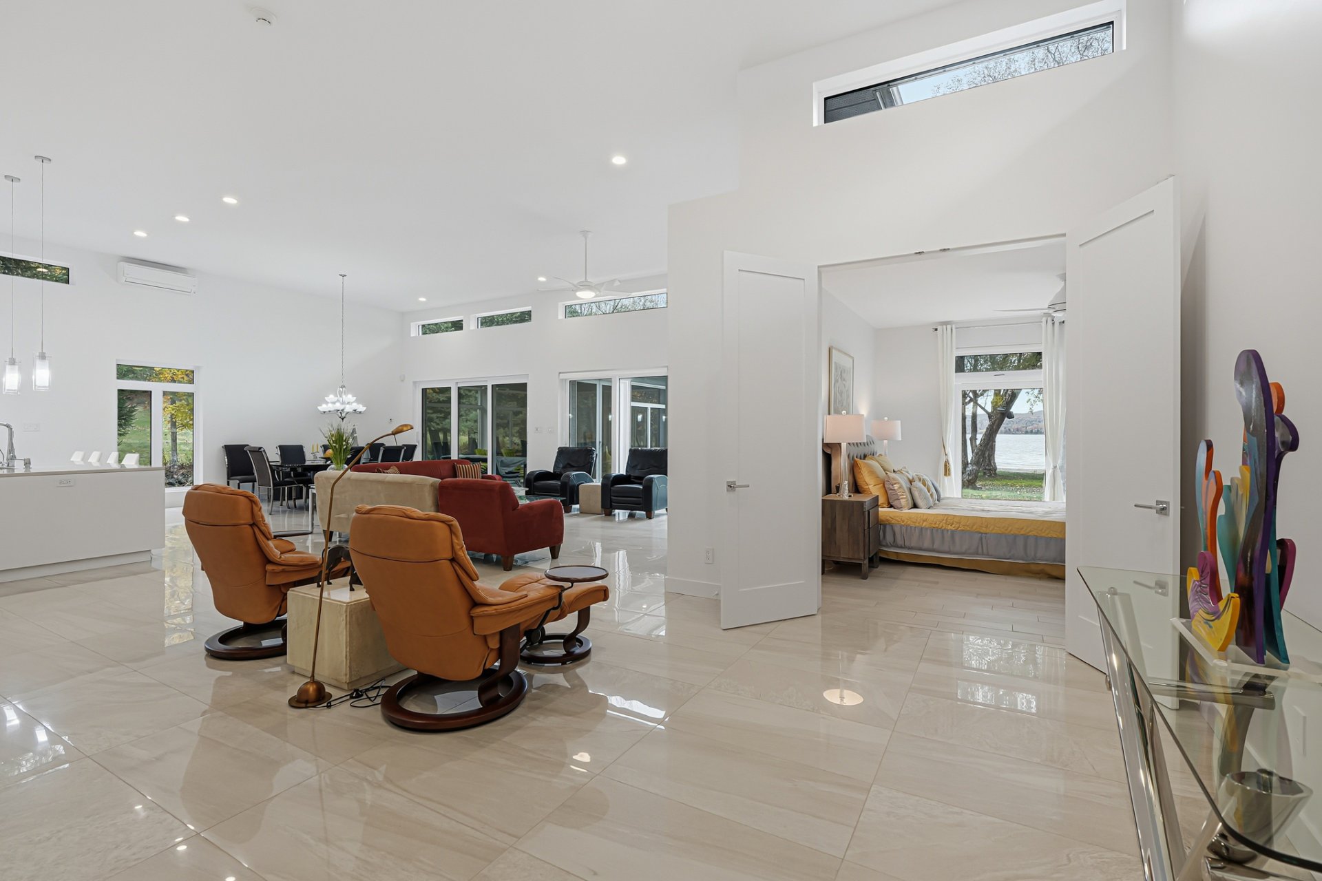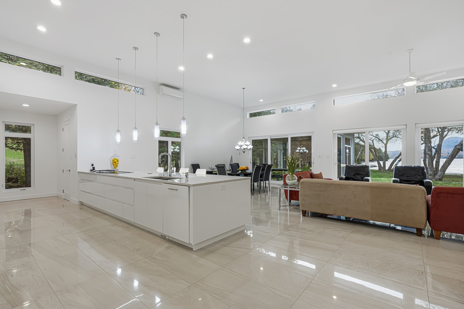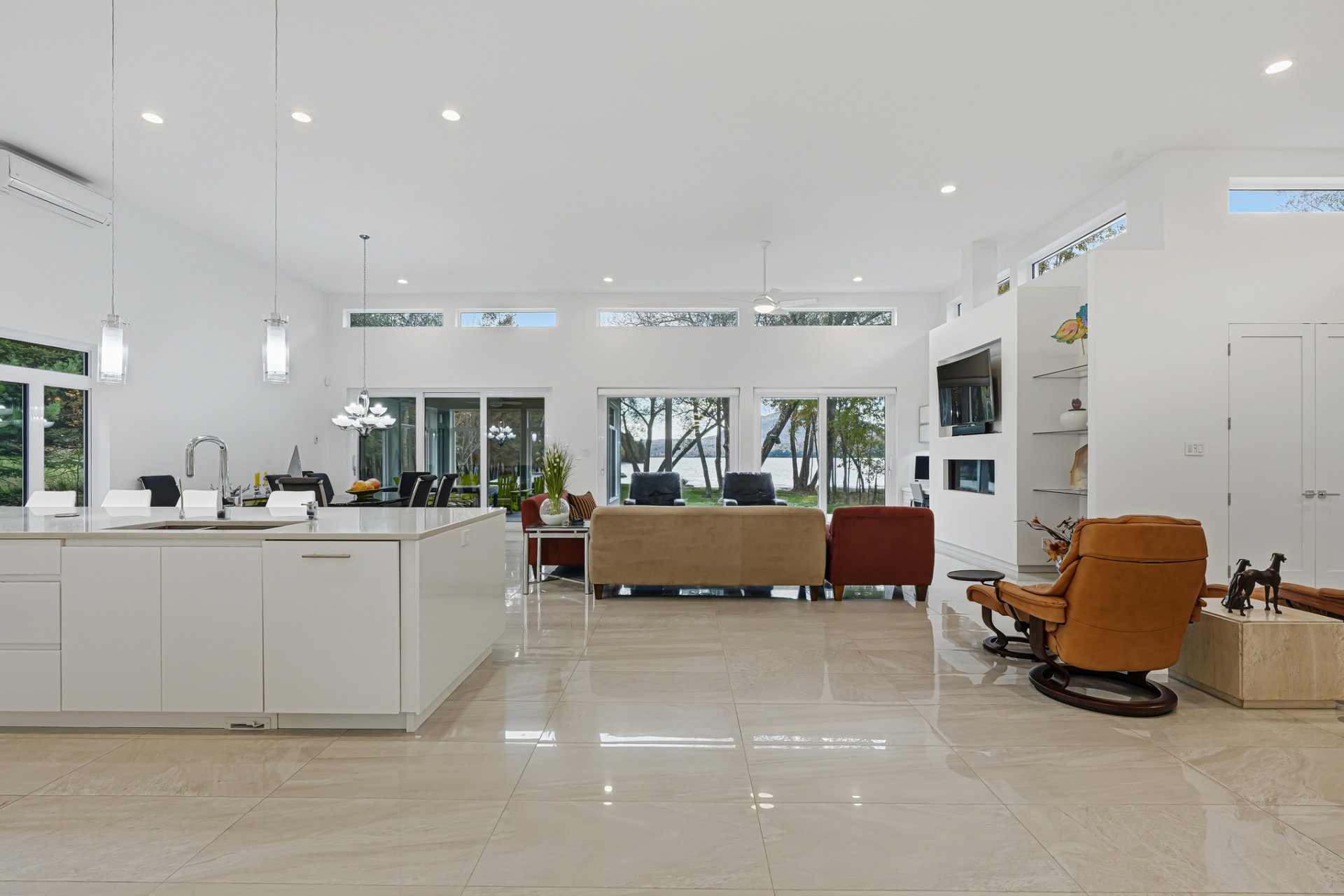 Inside, the living spaces captivate with exceptional natural light and a timeless design. The open-concept layout features generous volumes enhanced by high ceilings and abundant upper-level fenestration, creating a fluid and constant connection with nature. The living room, anchored by a contemporary fireplace, invites relaxation in an atmosphere that is warm, elegant, and sophisticated.