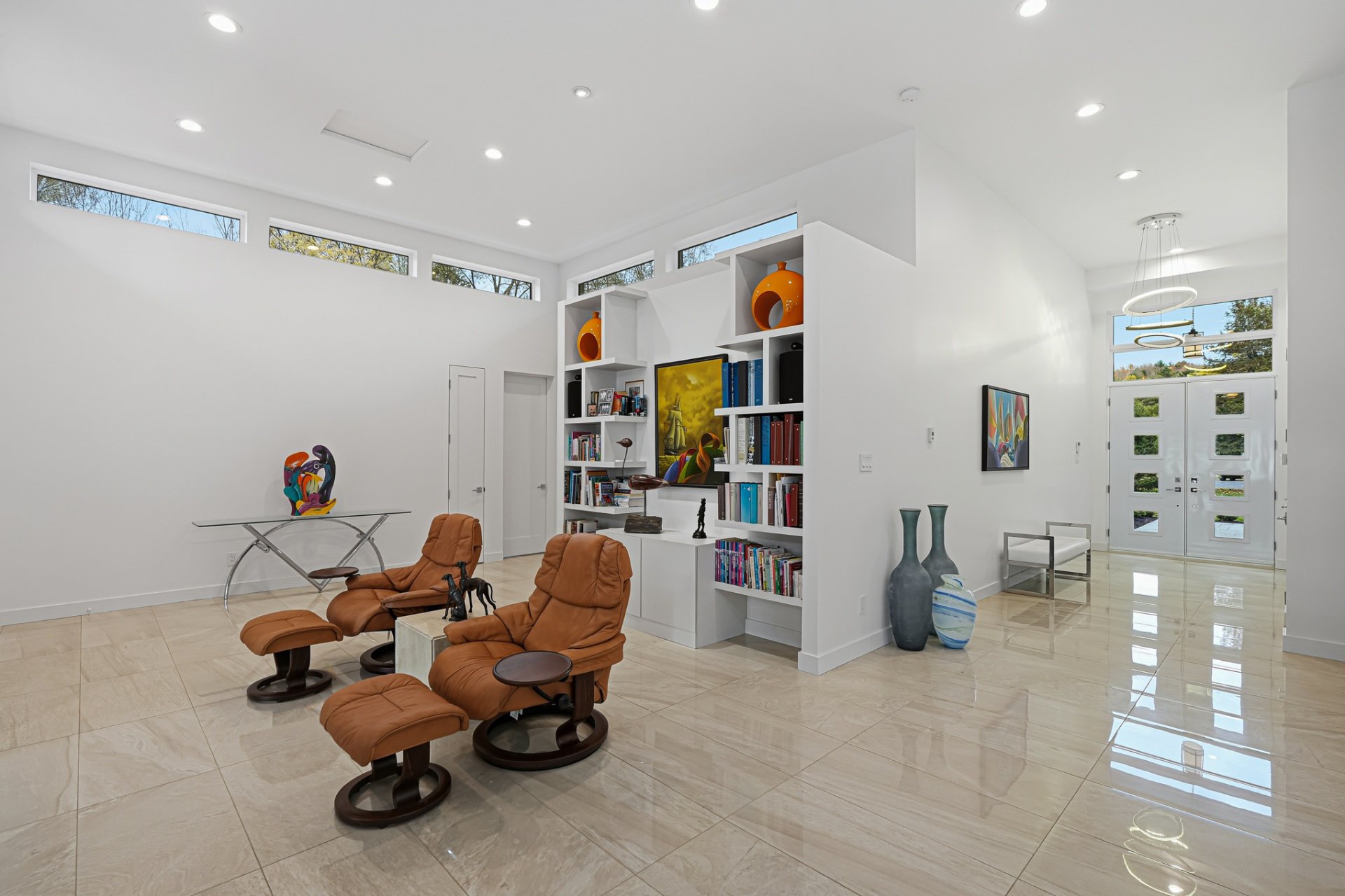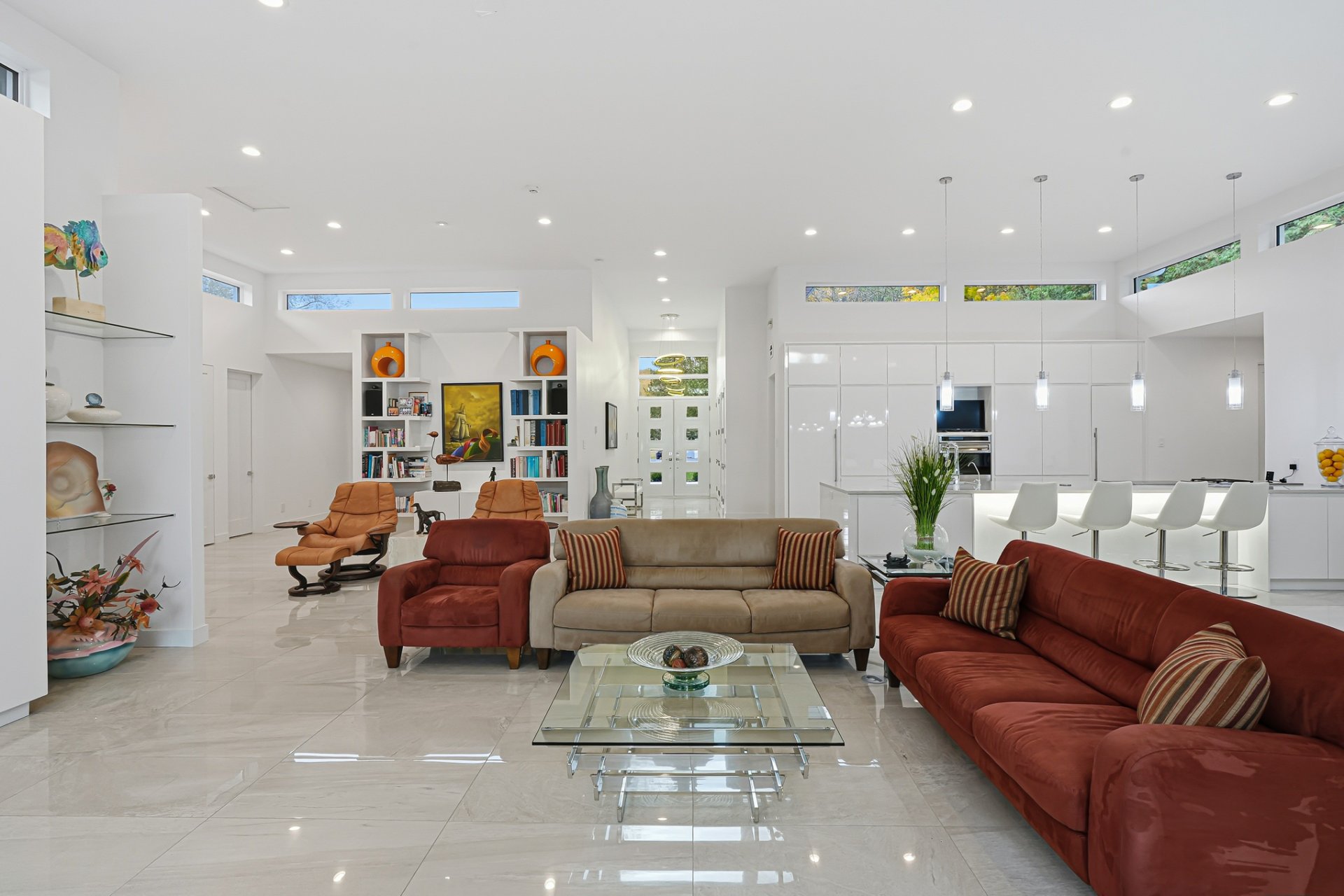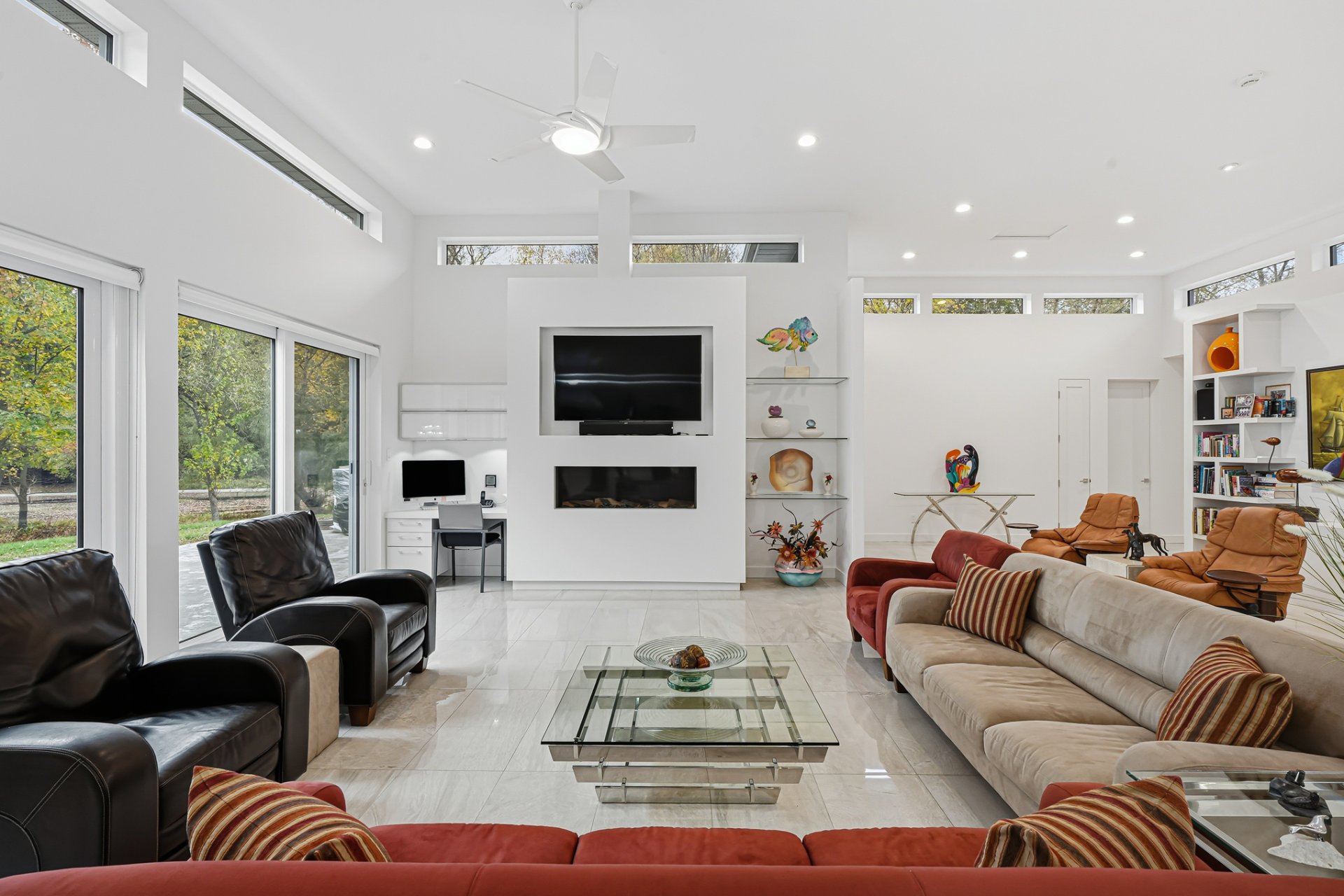 Inside, the living spaces captivate with exceptional natural light and a timeless design. The open-concept layout features generous volumes enhanced by high ceilings and abundant upper-level fenestration, creating a fluid and constant connection with nature. The living room, anchored by a contemporary fireplace, invites relaxation in an atmosphere that is warm, elegant, and sophisticated.