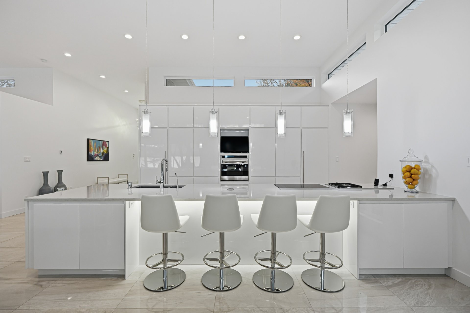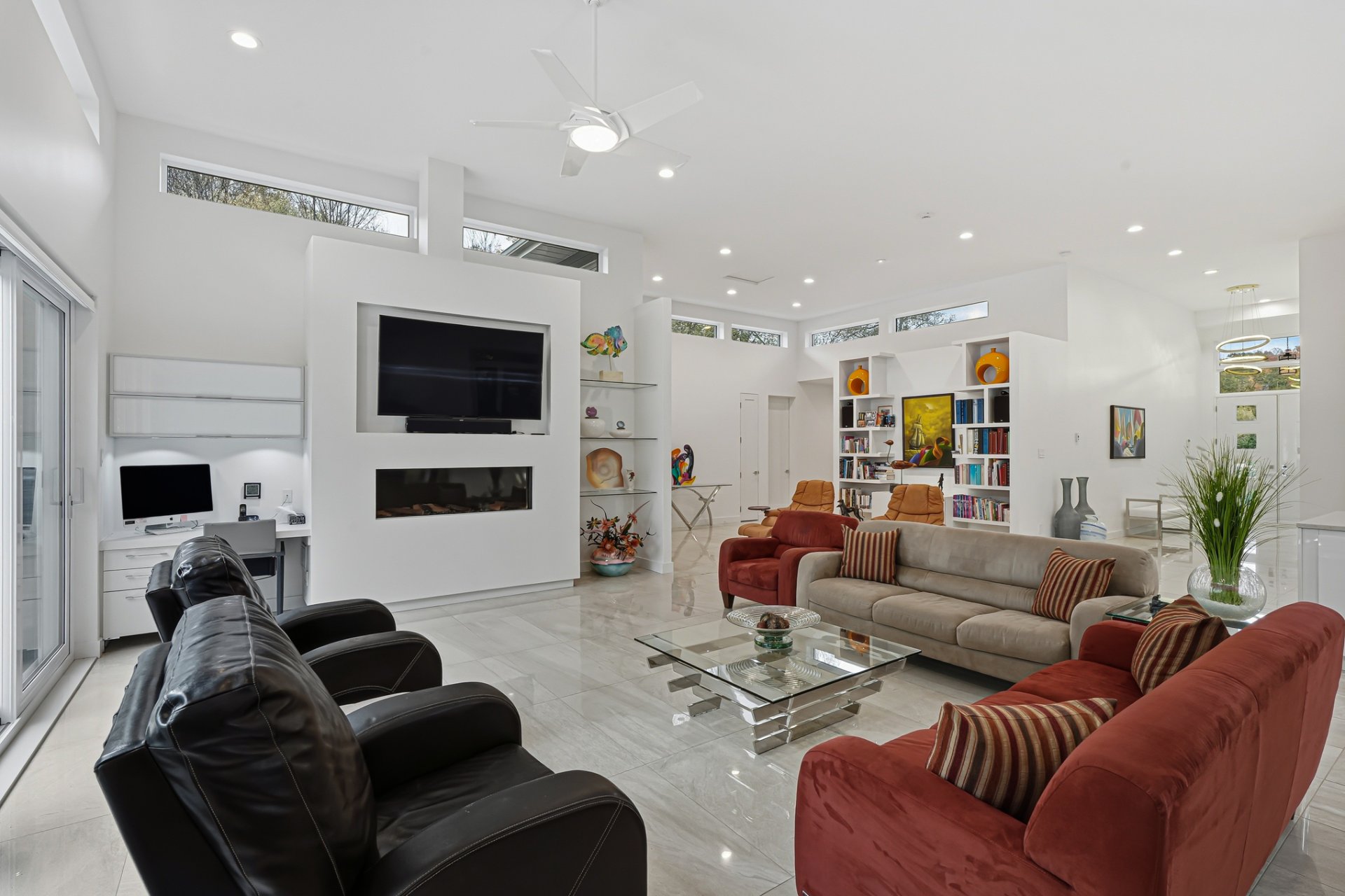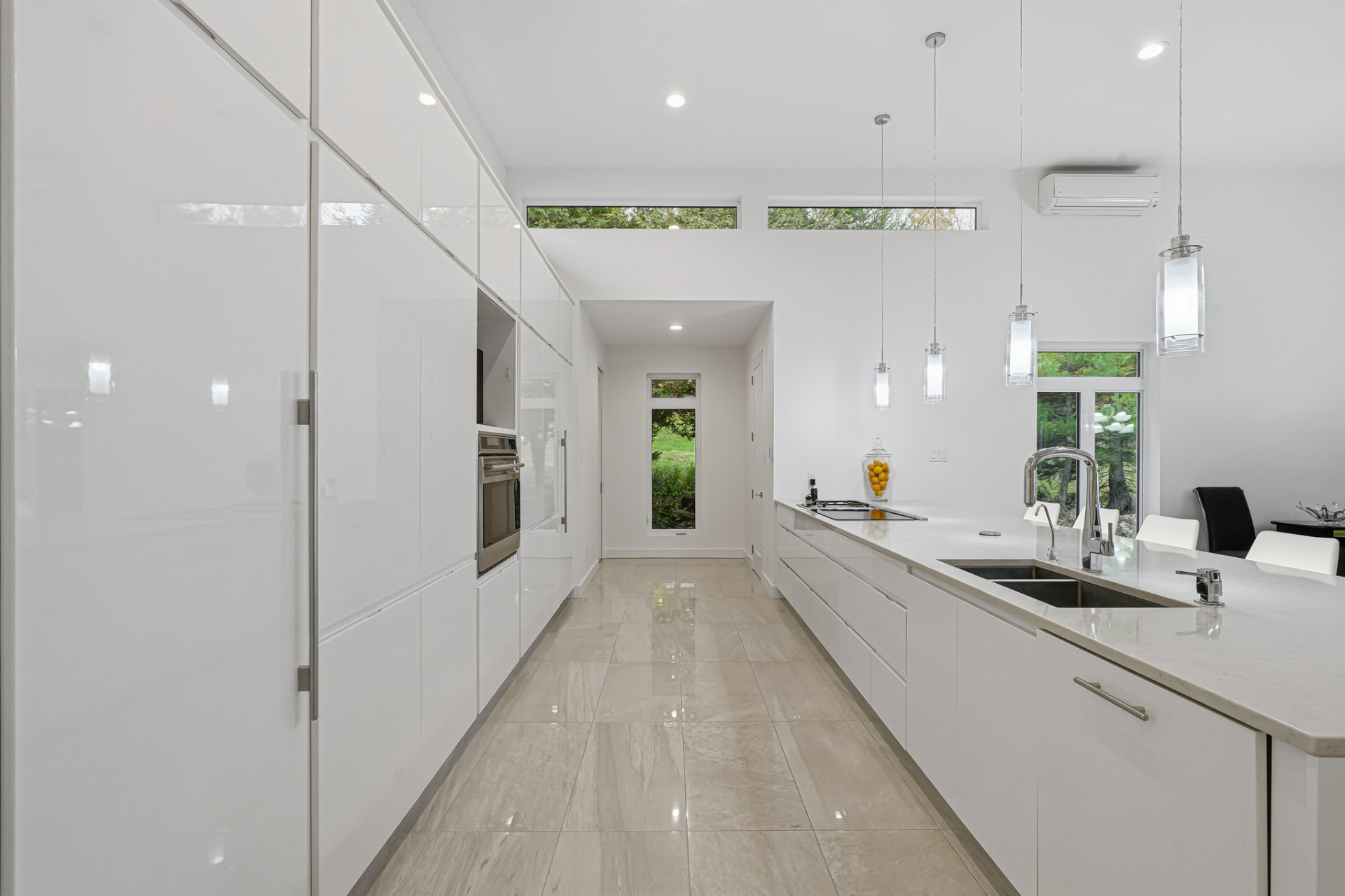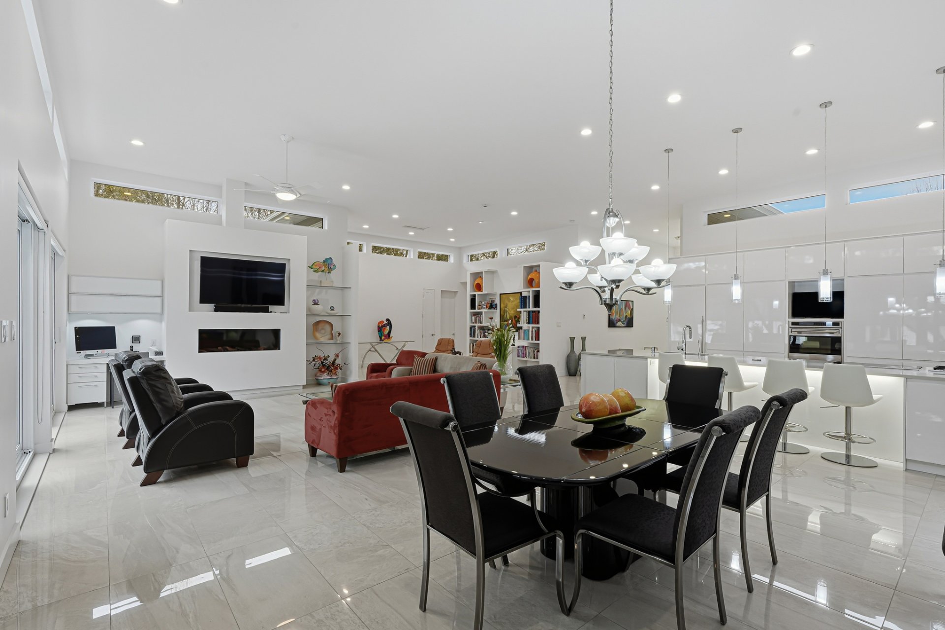 Inside, the living spaces captivate with exceptional natural light and a timeless design. The open-concept layout features generous volumes enhanced by high ceilings and abundant upper-level fenestration, creating a fluid and constant connection with nature. The living room, anchored by a contemporary fireplace, invites relaxation in an atmosphere that is warm, elegant, and sophisticated.