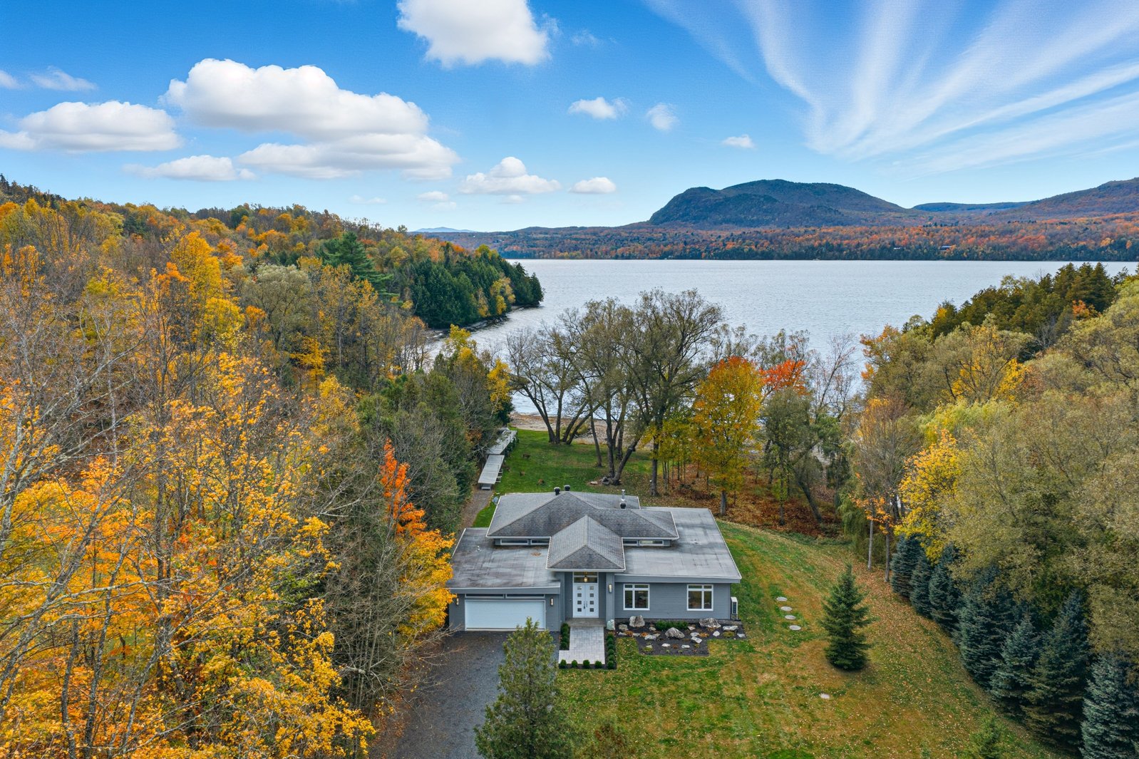 Located in Georgeville, in one of the most sought-after areas of the Eastern Townships, this elegant single-level residence offers an exceptional lifestyle on the shores of Lake Memphremagog. Set on a private lot of over 112,000 sq. ft., it stands out for its preserved natural surroundings, privacy, and spectacular views of the lake and surrounding mountains. The bright, open-concept living area features generous volumes, abundant fenestration, and a contemporary fireplace. The residence includes four bedrooms, including a refined primary suite. A rare setting combining nature, comfort, and elevated living.