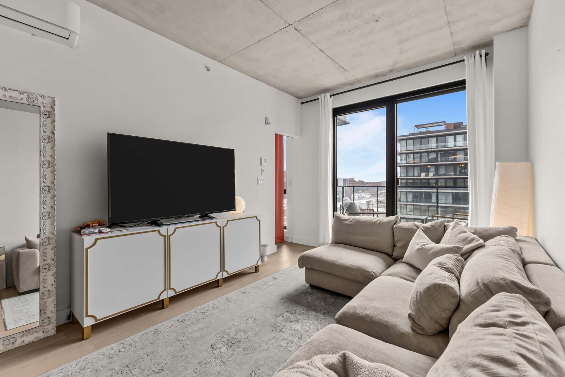 Beige Upholstered Bed, Sealy Mattress, Table with Marble Countertop from Maison Corbeil, Grey L-Shape Couch from Maison Corbeil, West Elm Gold and Marble Floor Mirror, SONY TV, 65", White TV Stand with Gold Embellishment, Mercer41 White Desk with Gold Legs, Mercer41 Pink Tufted Office Chair, IKEA Malm with 3-Drawers Chest, IKEA Alex 5 Drawers, All sold without legal warranty.