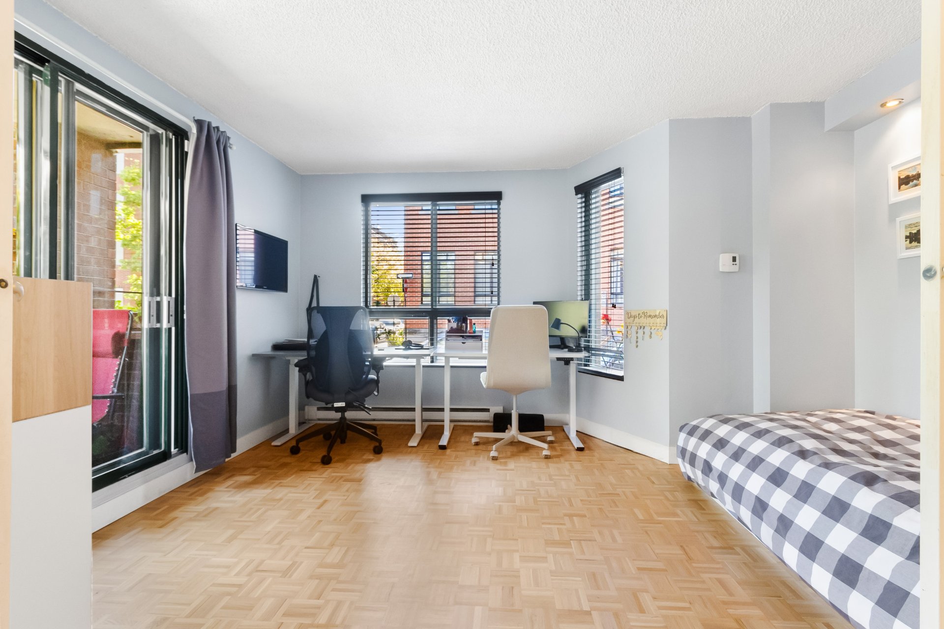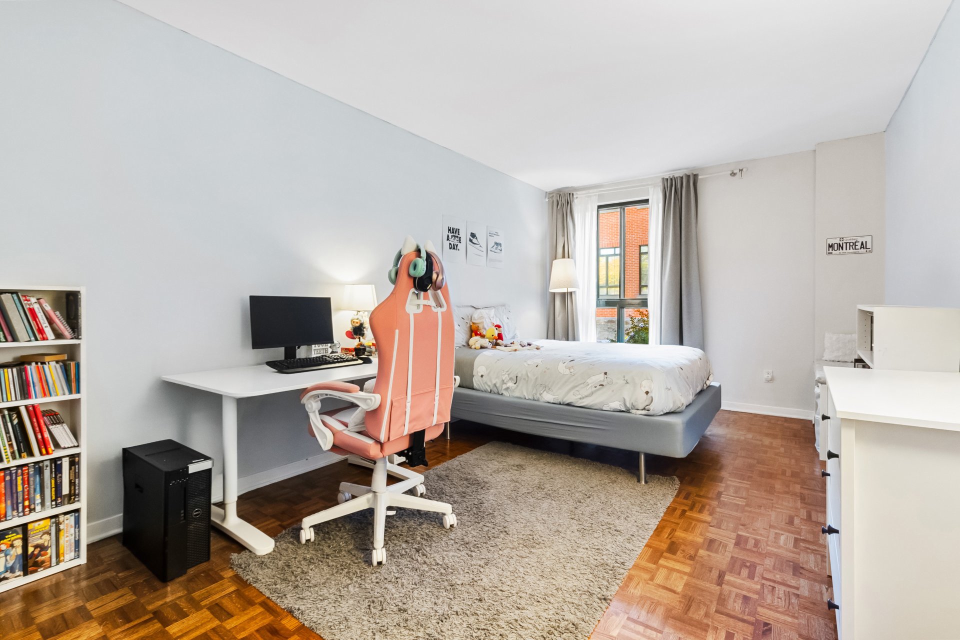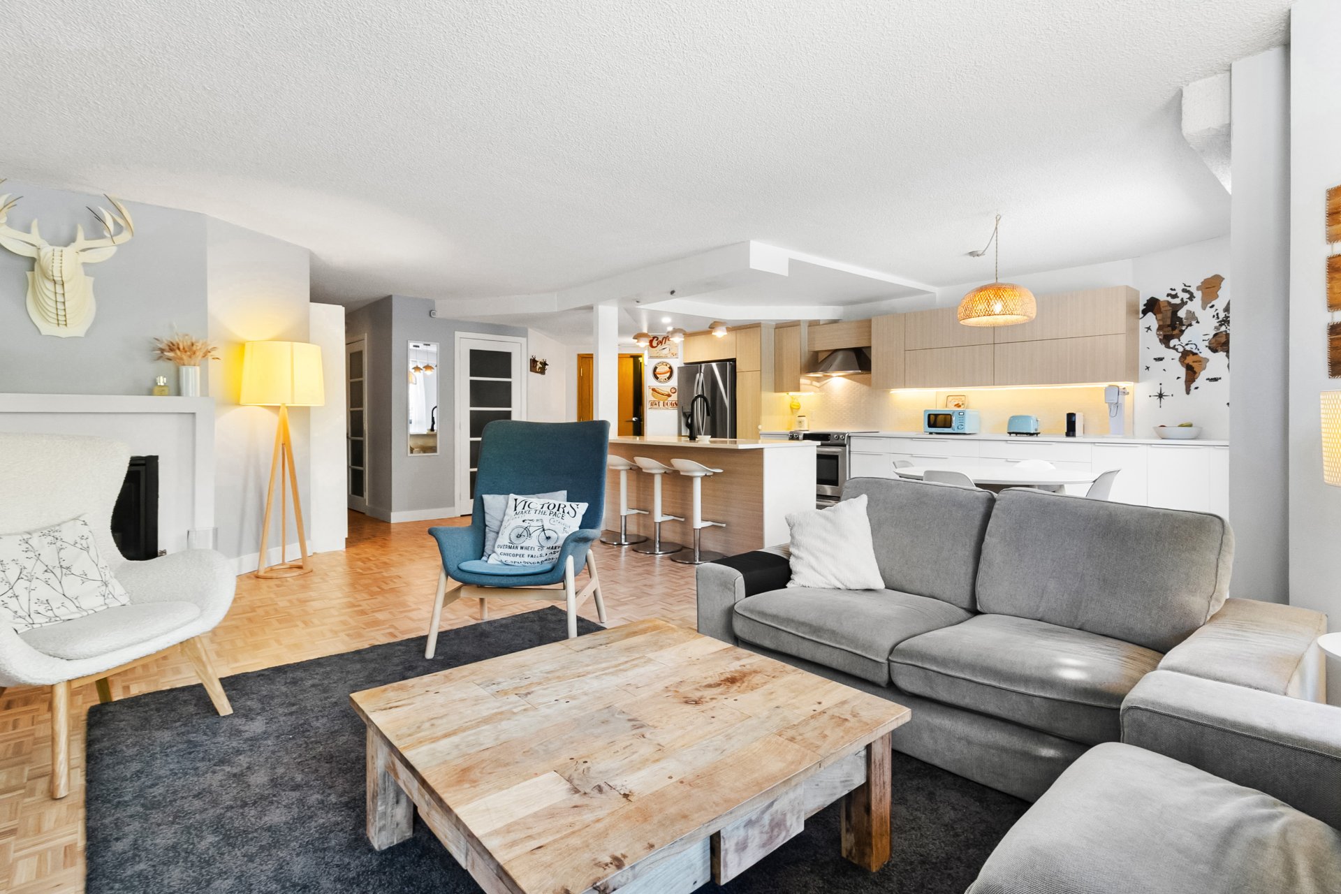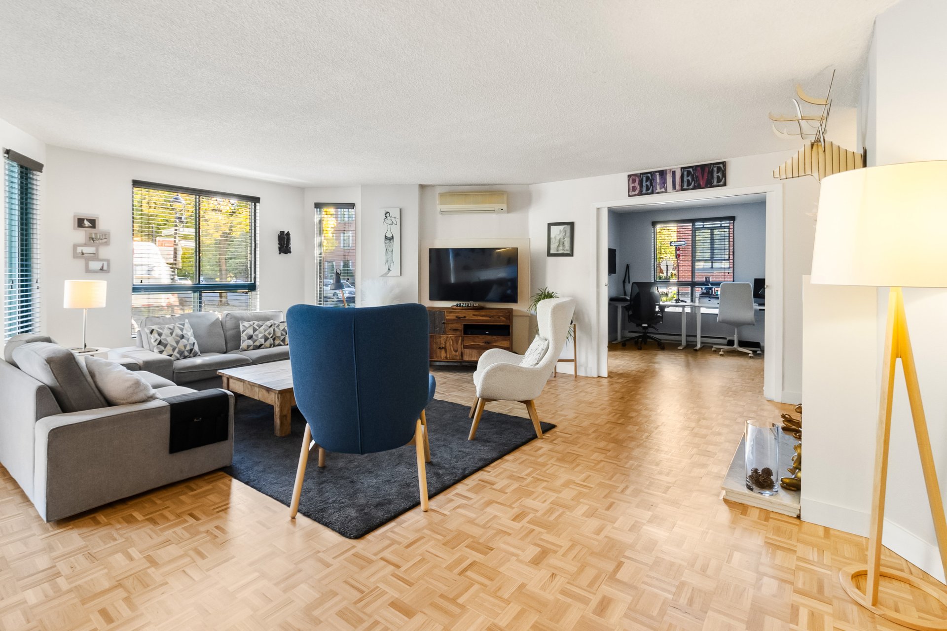 Spacious corner unit facing Stelco Park, in the heart of the sought-after Atwater Market area. Open living space with renovated kitchen, living and dining areas. Two bedrooms plus a den/office off the living room. Updated bathroom with separate bath and shower. Wall-mounted A/C, gas fireplace, balcony with park view, storage and garage ready for EV charger. Steps from the Lachine Canal, Atwater Market, trendy restaurants, metro and major roadways.