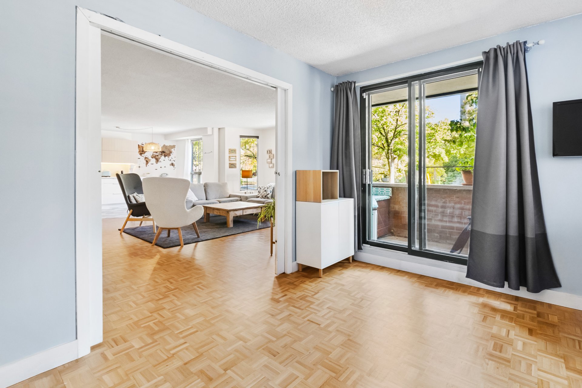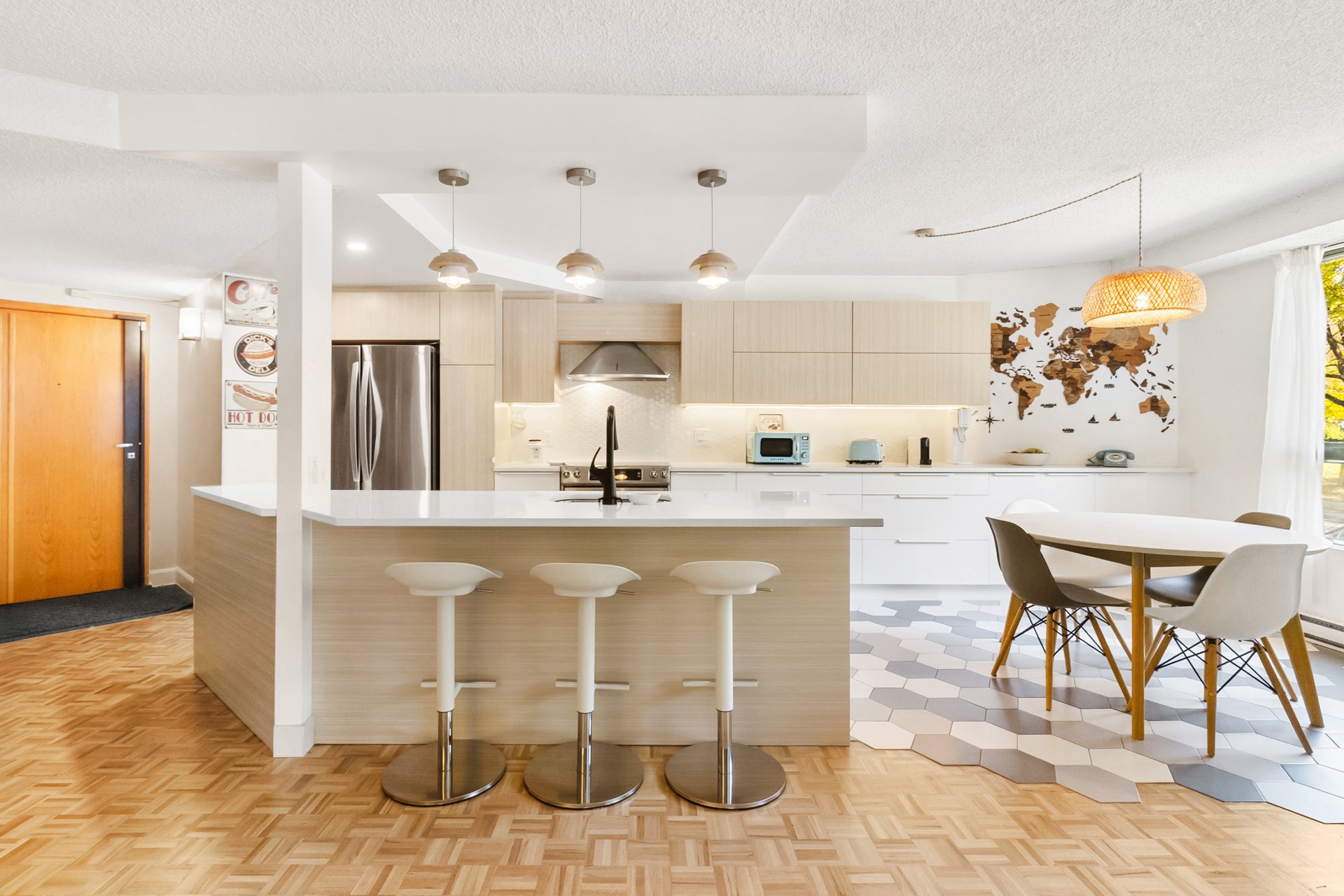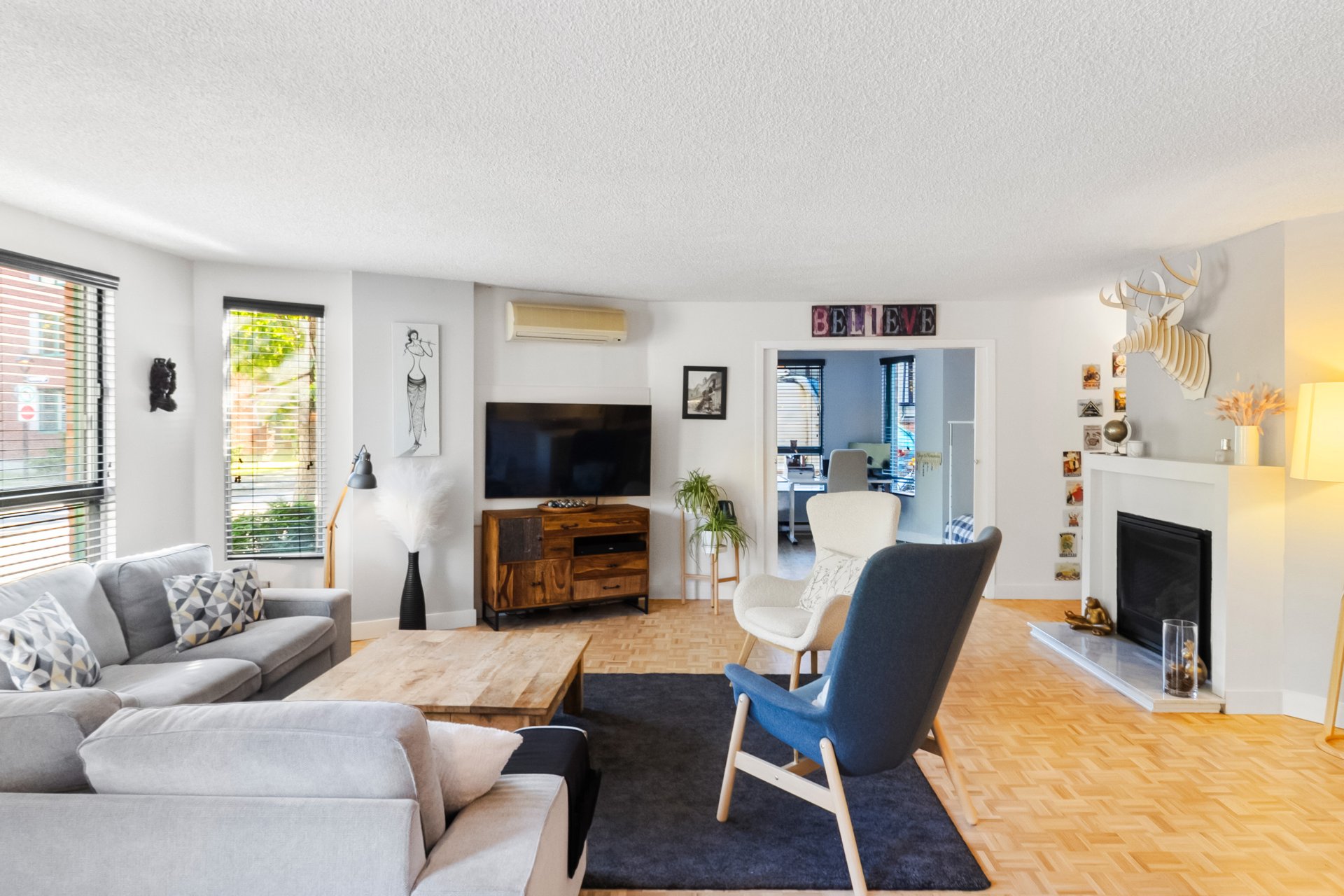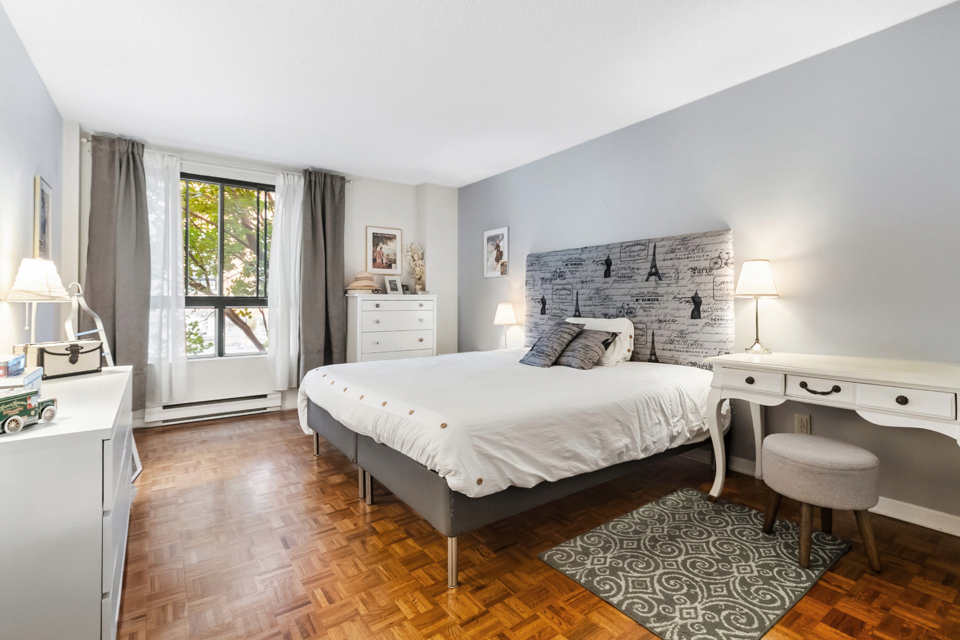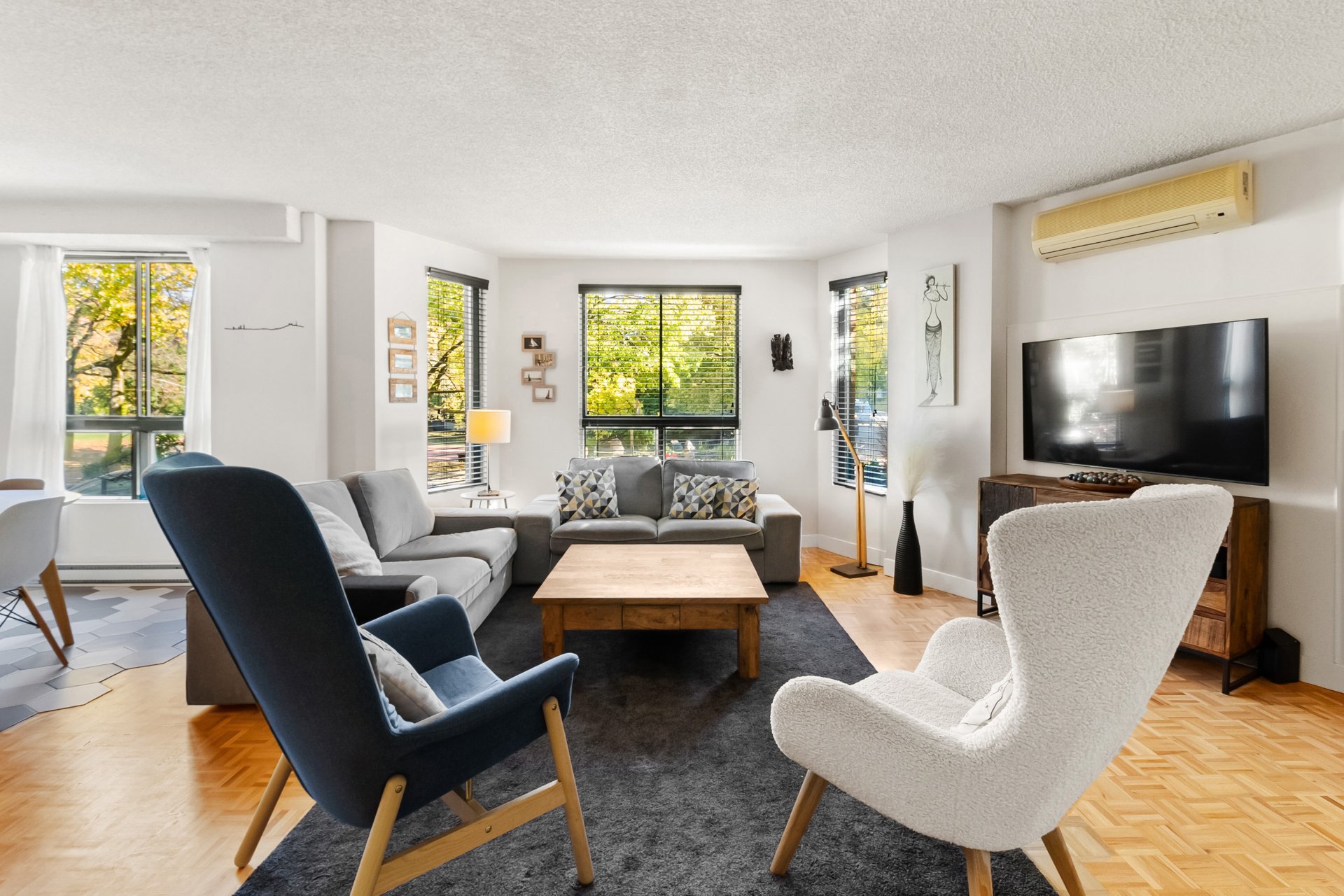 Spacious corner unit facing Stelco Park, in the heart of the sought-after Atwater Market area. Open living space with renovated kitchen, living and dining areas. Two bedrooms plus a den/office off the living room. Updated bathroom with separate bath and shower. Wall-mounted A/C, gas fireplace, balcony with park view, storage and garage ready for EV charger. Steps from the Lachine Canal, Atwater Market, trendy restaurants, metro and major roadways.