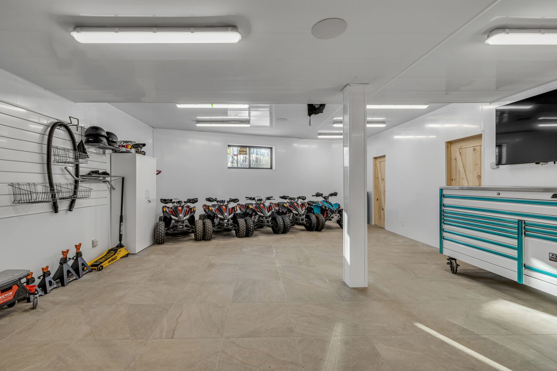 - Main bedroom & console entrance panel, all the bronzes by Frederic Remington, library books, Jura coffee machine, globe, living room floral wood chandeliers, lion sculpture, guest bedroom canvas by Élise Genest, Snap-On chest & garage tools. Polaris RZR pink, John Deere Gator, motocross KTM350, four-wheeled BRP Can-Am110, balcony pizza oven, Kubota KX80 mechanical excavator, tractors, John Deere 4720 & 3038, grader scraper, Métavic wood loader, 10 International wheels.