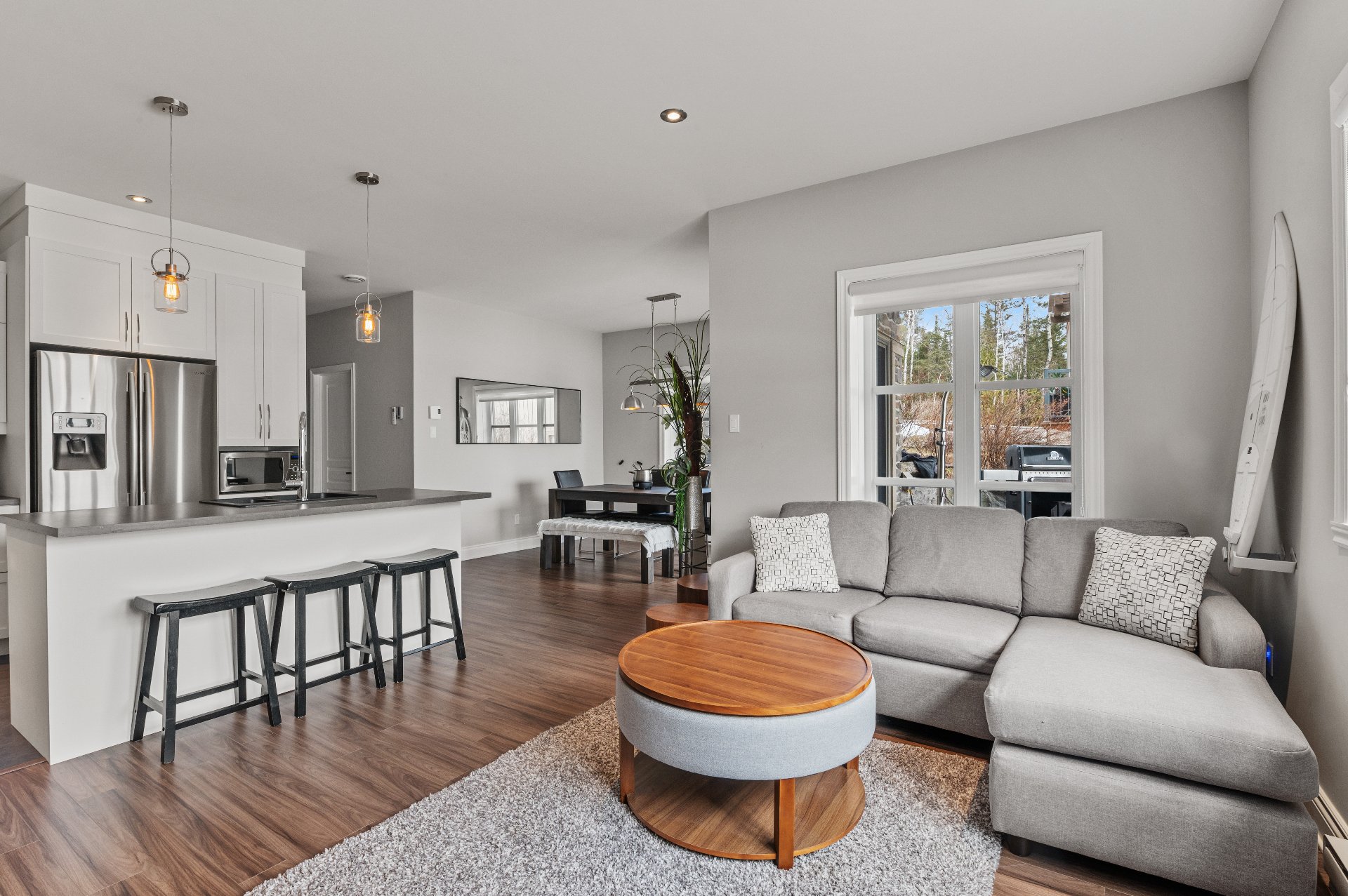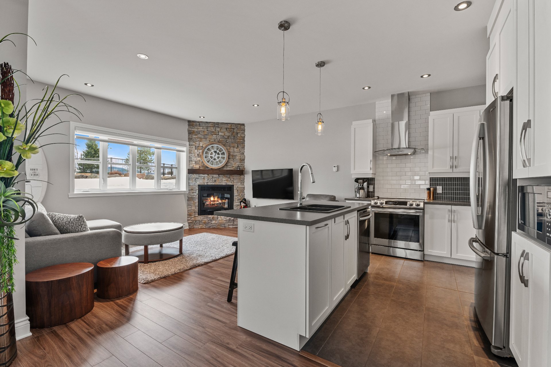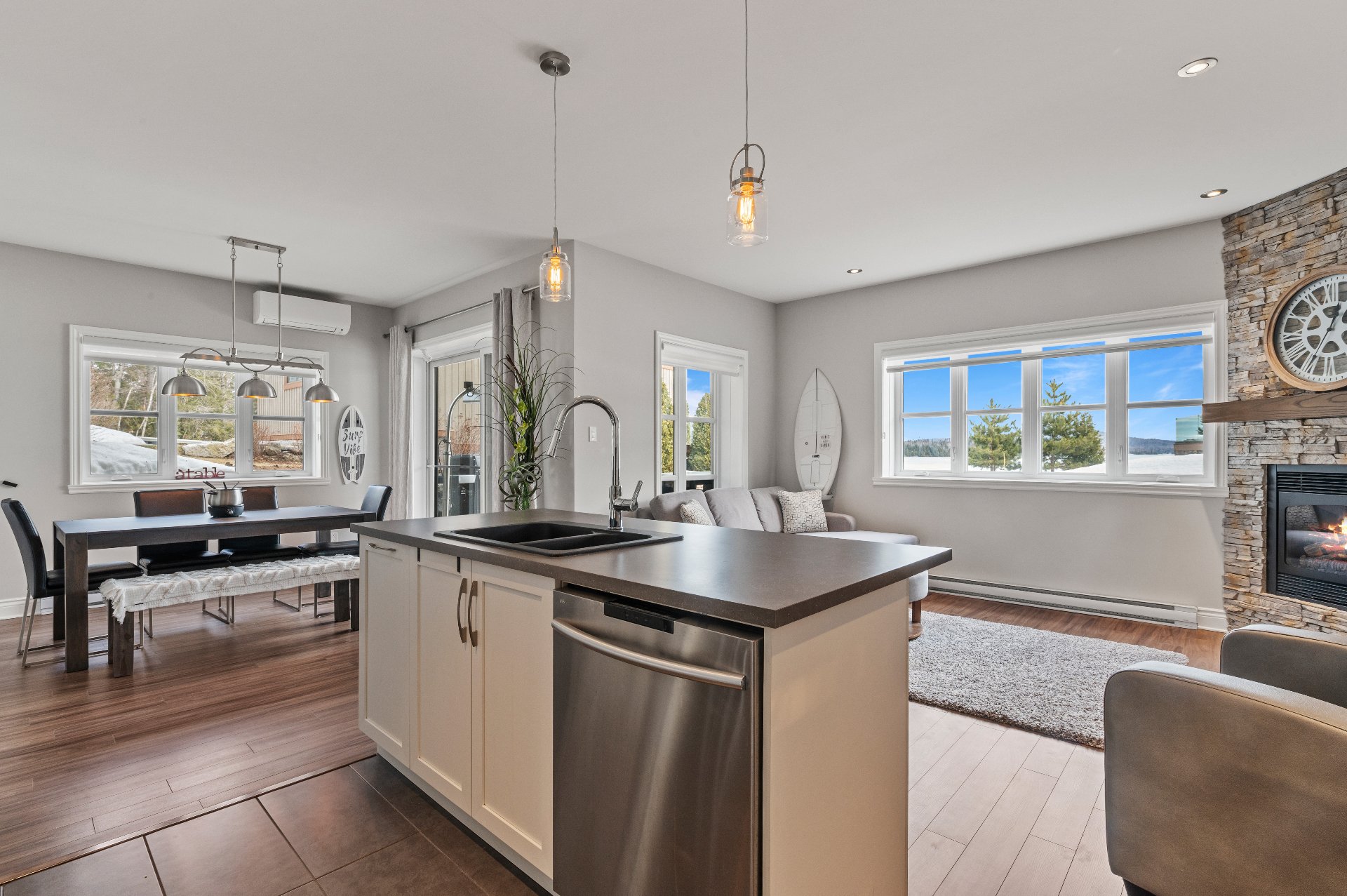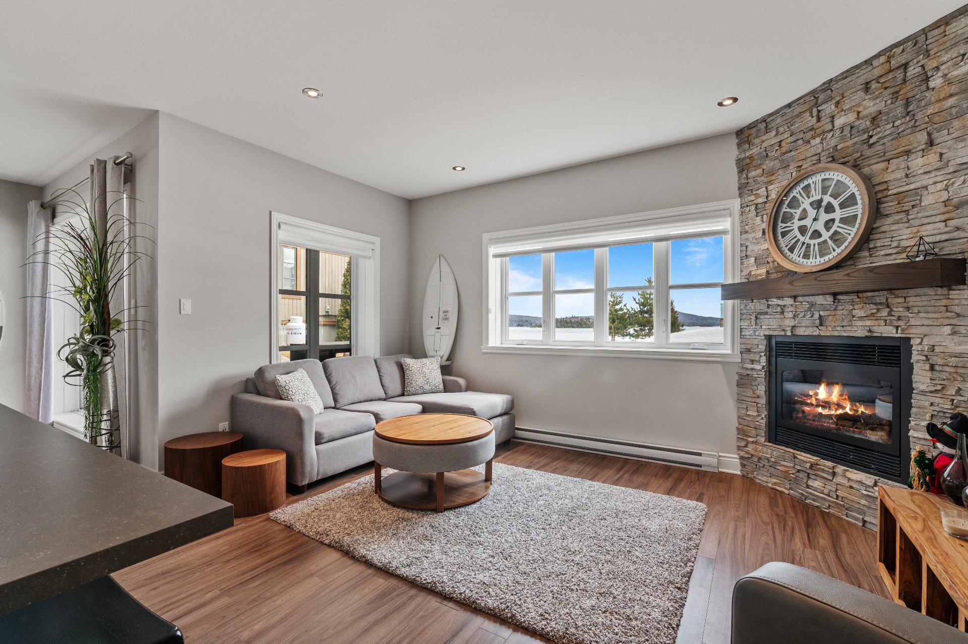 Located in the beautiful Domaine Rive-Gauche, this modern two-bedroom condo enjoys an exceptional location directly facing the majestic Lac Ouareau, one of the largest navigable lakes in the region with over 14 km² of water surface.