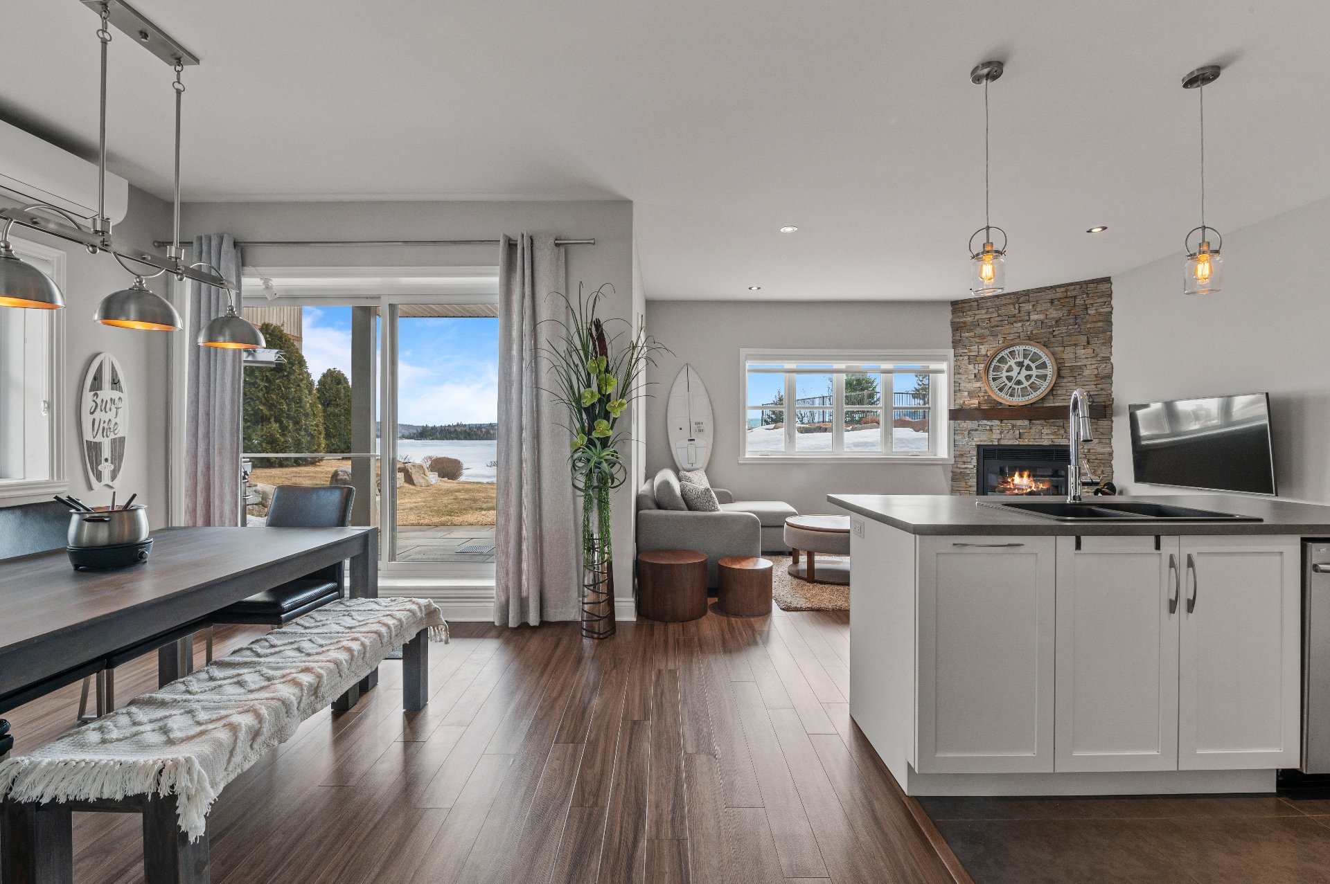 Inside, the property features bright and welcoming living spaces with approximately 9-foot ceilings, a propane gas fireplace in the living room, and a functional layout perfect for relaxing stays at the lake.