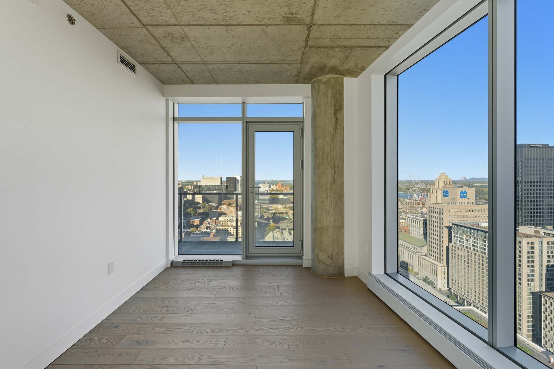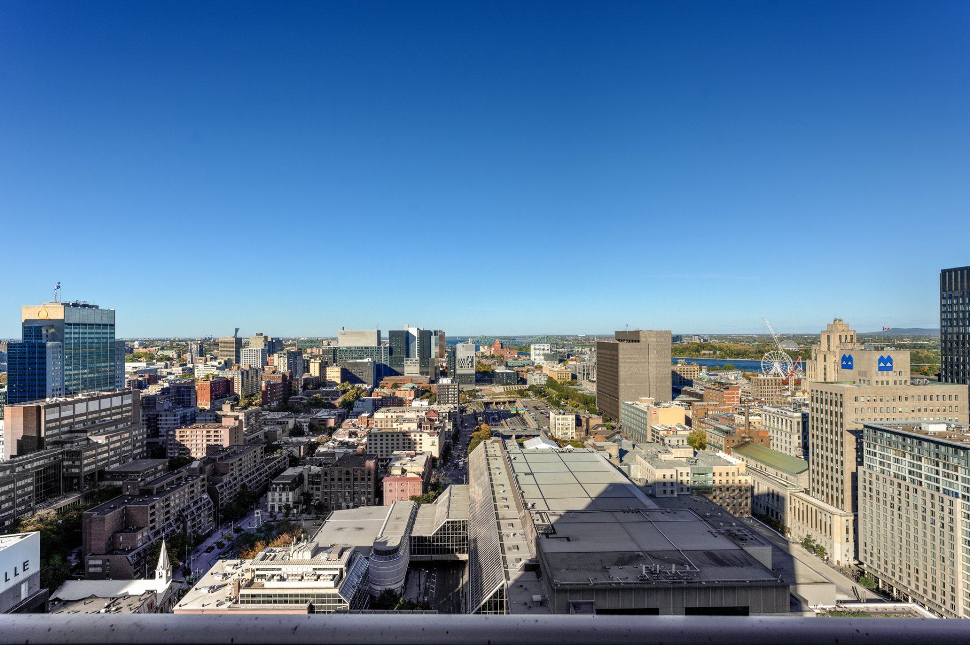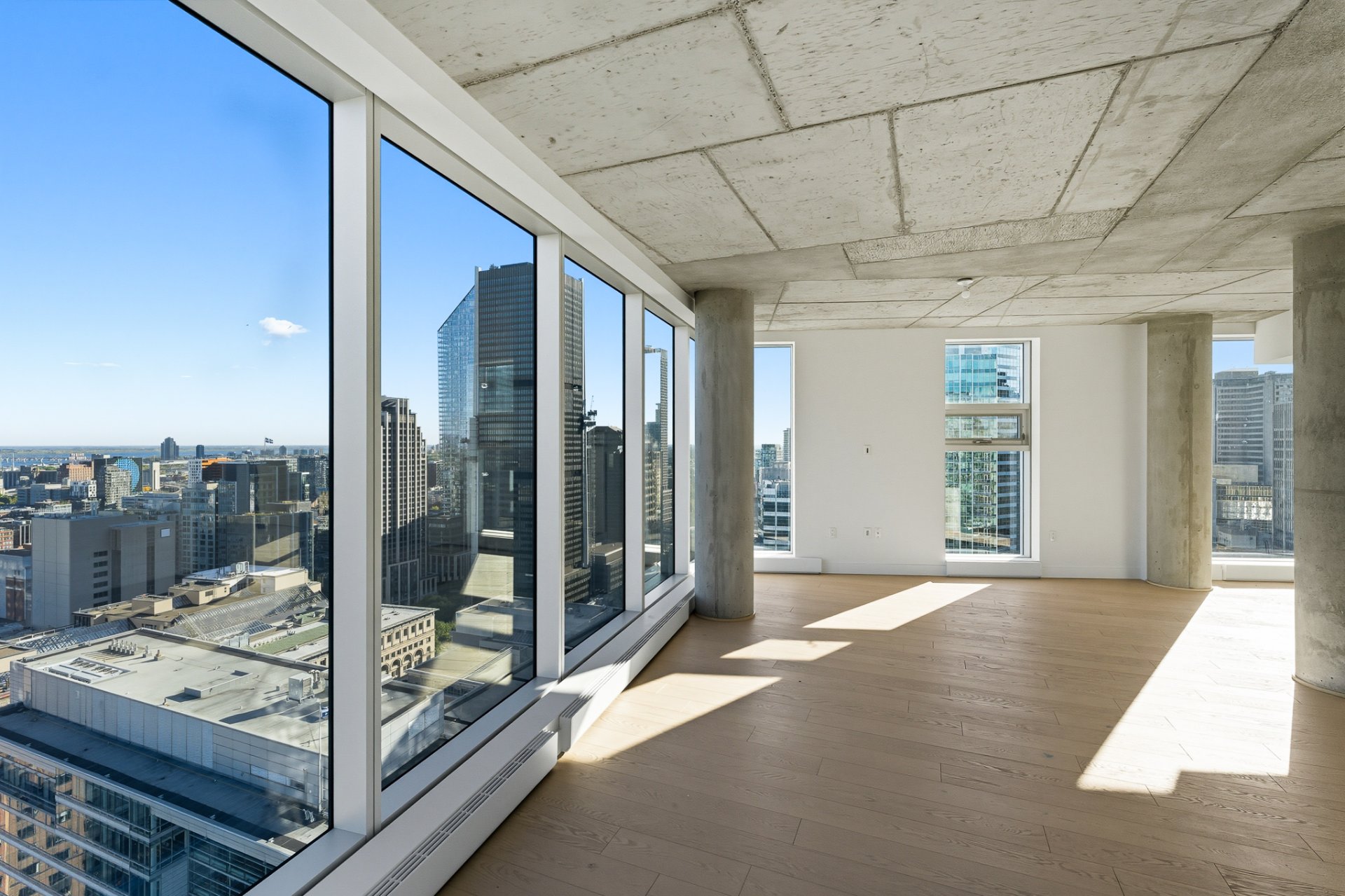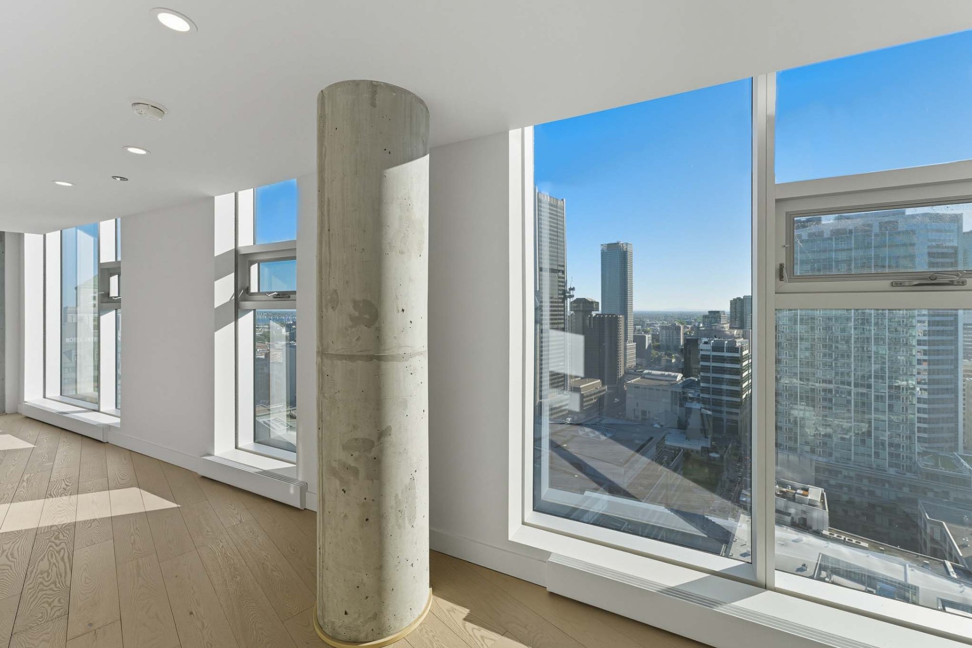 On the 32nd floor of the iconic Humaniti, this condo offers breathtaking panoramic views on three sides--east, south, and west--an ever-changing spectacle as magical by day as it is at dusk, with the city at your feet. Built in 2020 and barely lived in as a pied-à-terre, the unit feels virtually new. Open-concept living, contemporary kitchen and bathrooms, expansive windows flooding the space with natural light, balcony and garage. Exceptional building with hotel-style services, pool, terrace, and even the Avril health-food market steps away. A refined urban haven for those seeking comfort and sophistication.