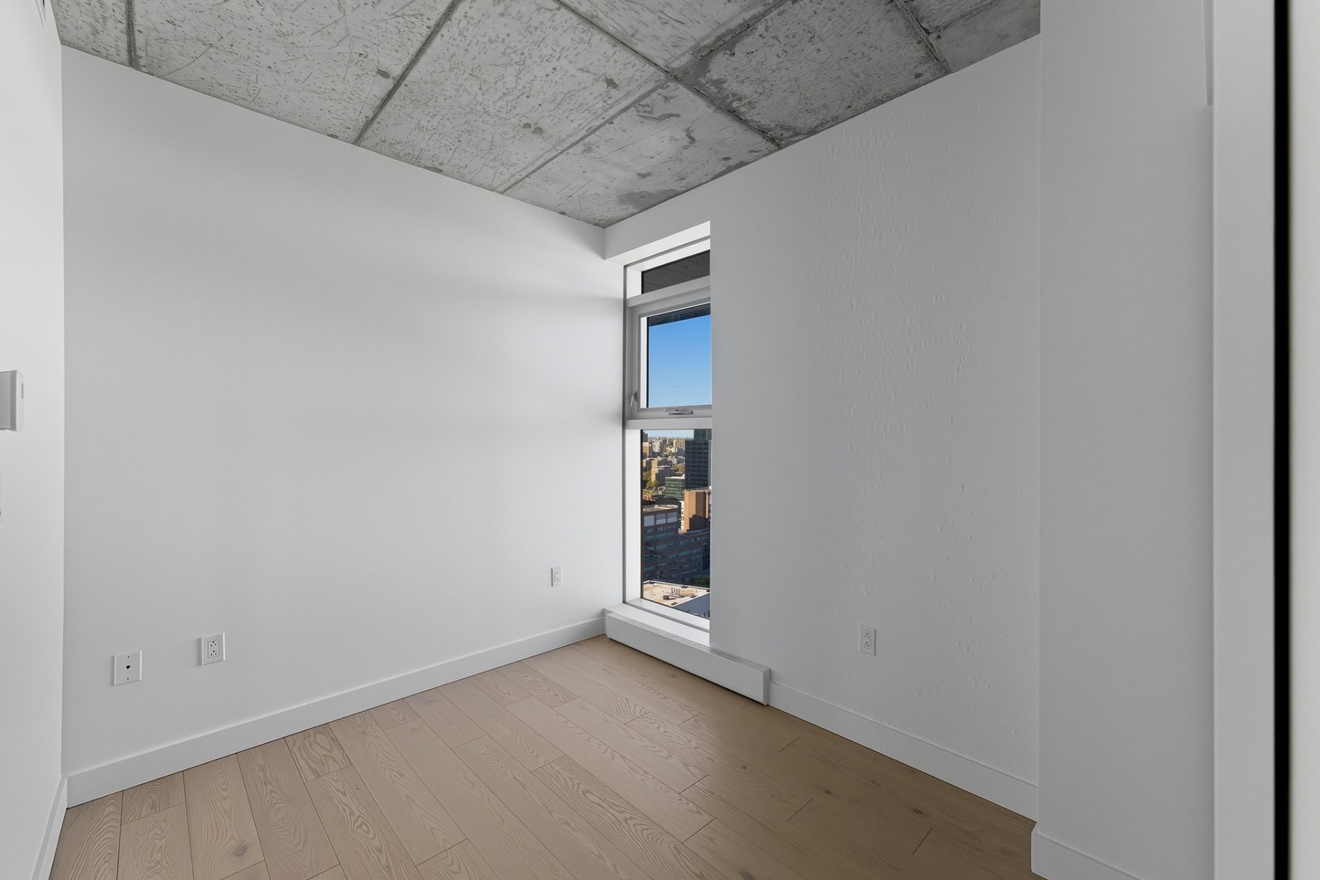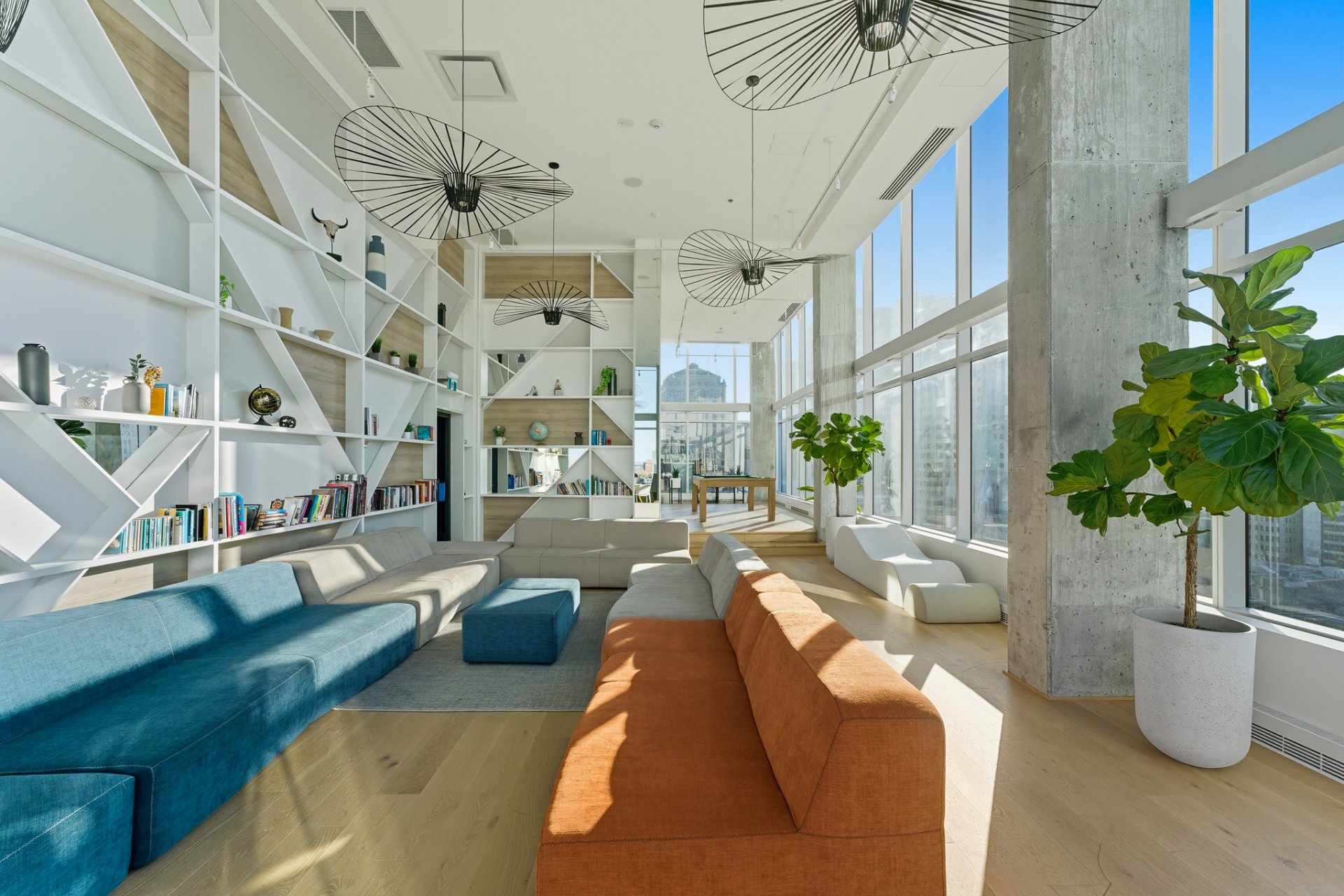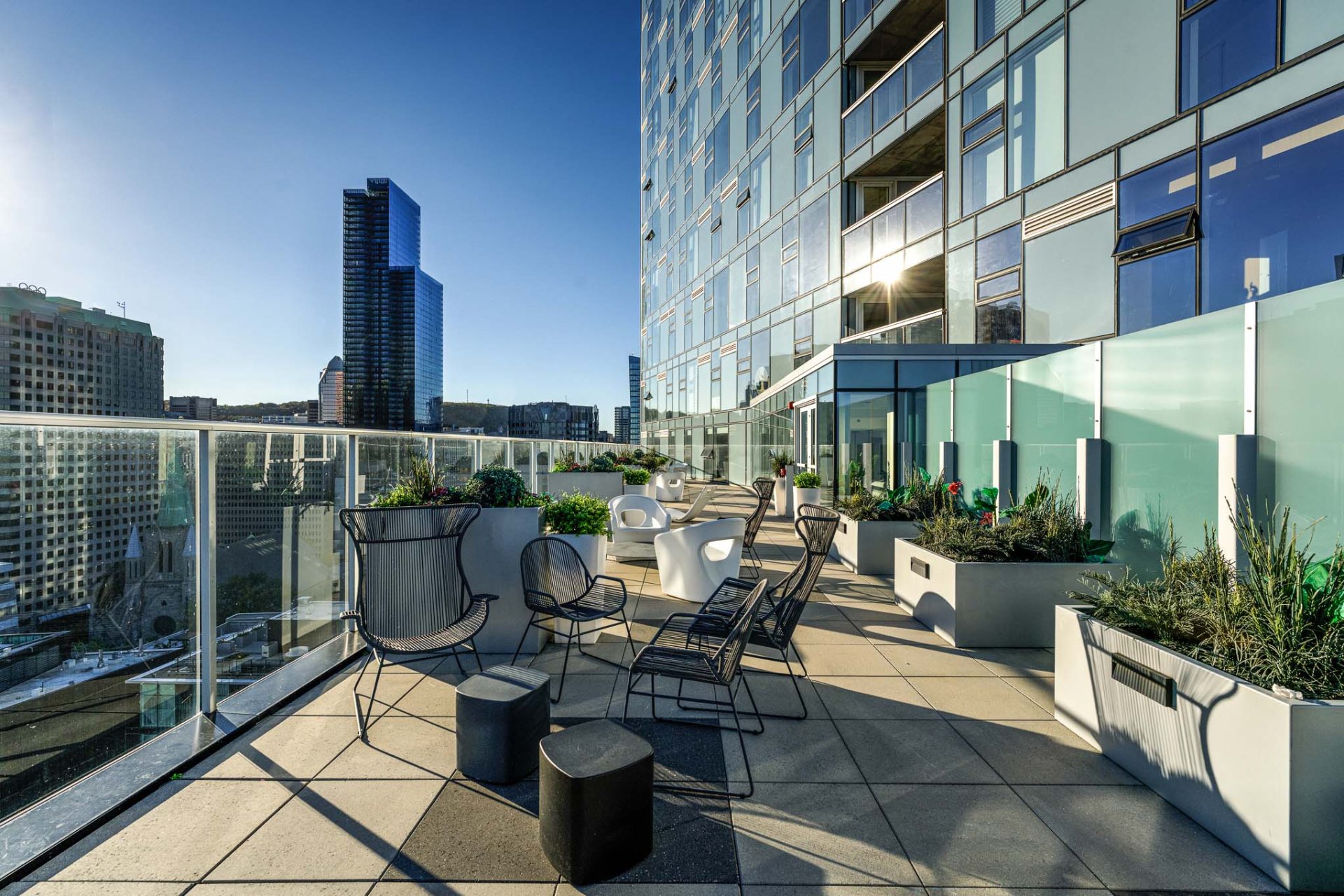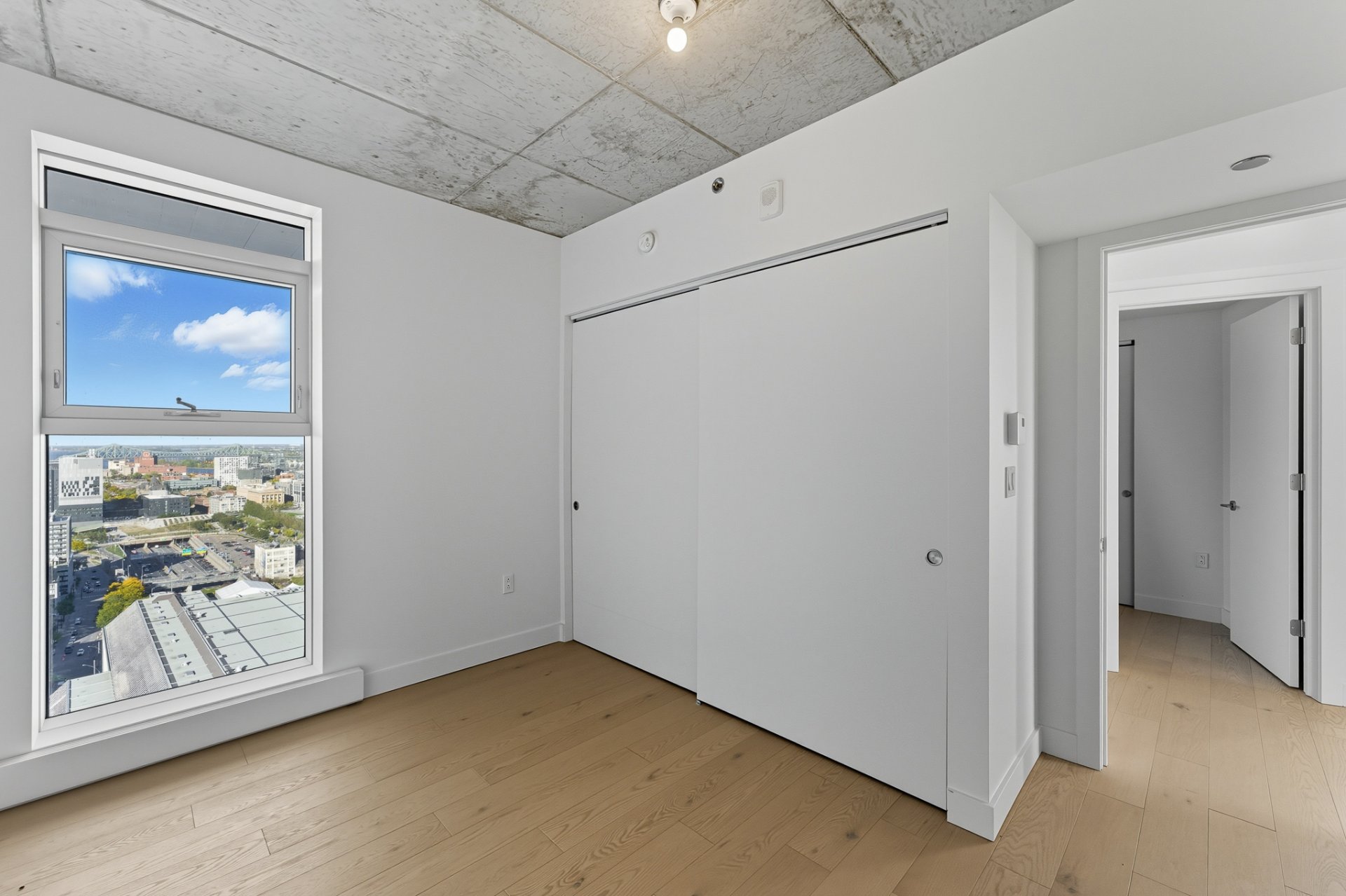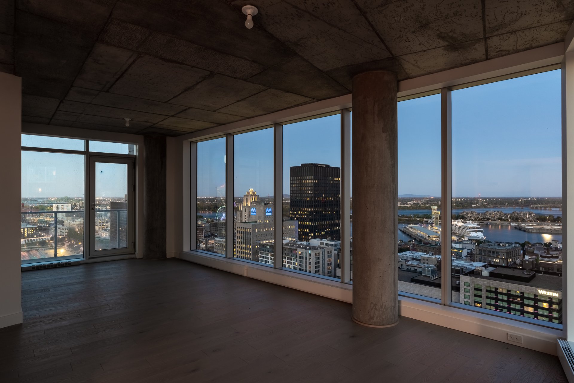 On the 32nd floor of the iconic Humaniti, this condo offers breathtaking panoramic views on three sides--east, south, and west--an ever-changing spectacle as magical by day as it is at dusk, with the city at your feet. Built in 2020 and barely lived in as a pied-à-terre, the unit feels virtually new. Open-concept living, contemporary kitchen and bathrooms, expansive windows flooding the space with natural light, balcony and garage. Exceptional building with hotel-style services, pool, terrace, and even the Avril health-food market steps away. A refined urban haven for those seeking comfort and sophistication.